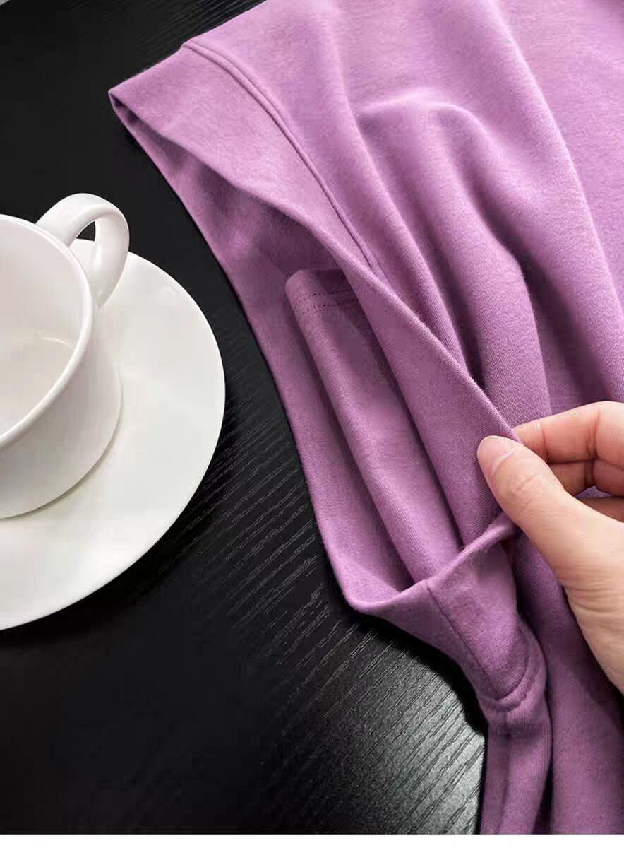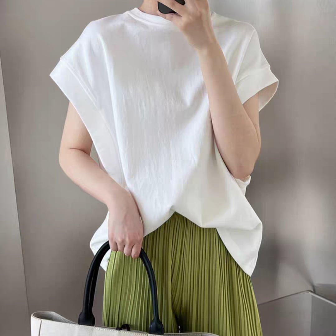 肩にかかるフレンチスリーブ風のシルエットが、腕まわりをさりげなくカバーしつつ抜け感をプラス。