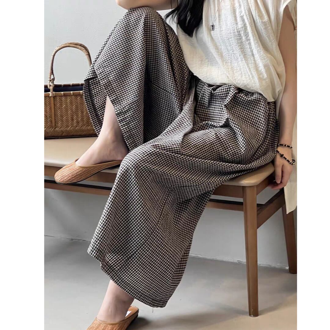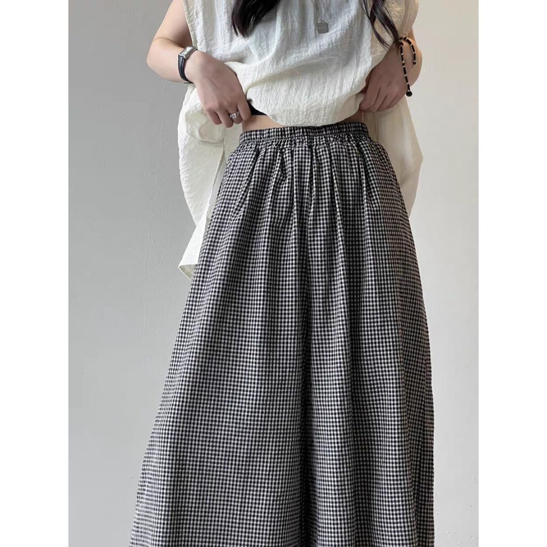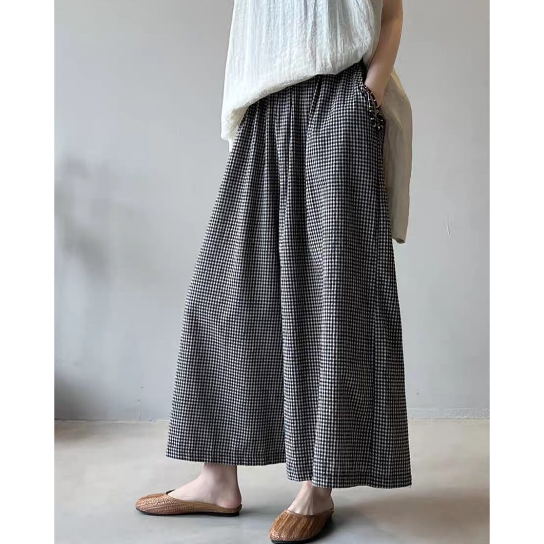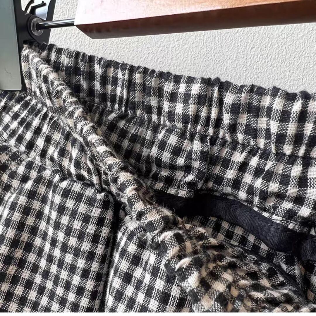 ゆったりとしたシルエットが魅力の、ナチュラル可愛いギンガムチェックワイドパンツ。