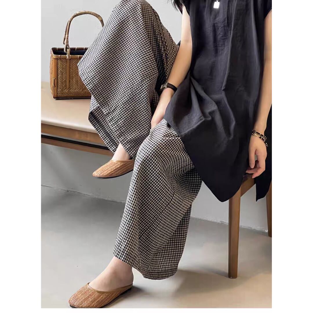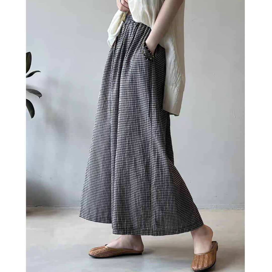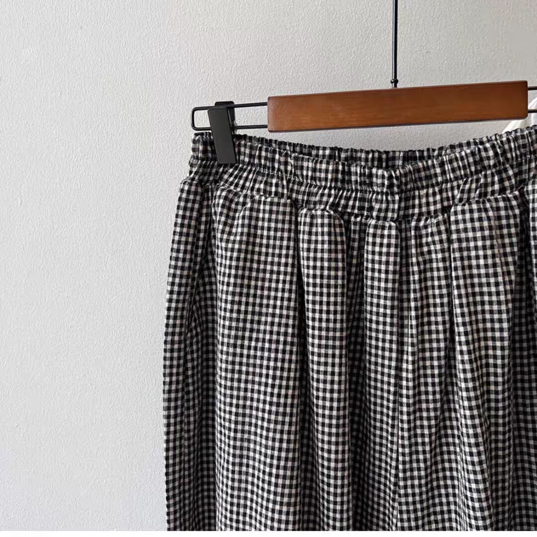 ゆったりとしたシルエットが魅力の、ナチュラル可愛いギンガムチェックワイドパンツ。