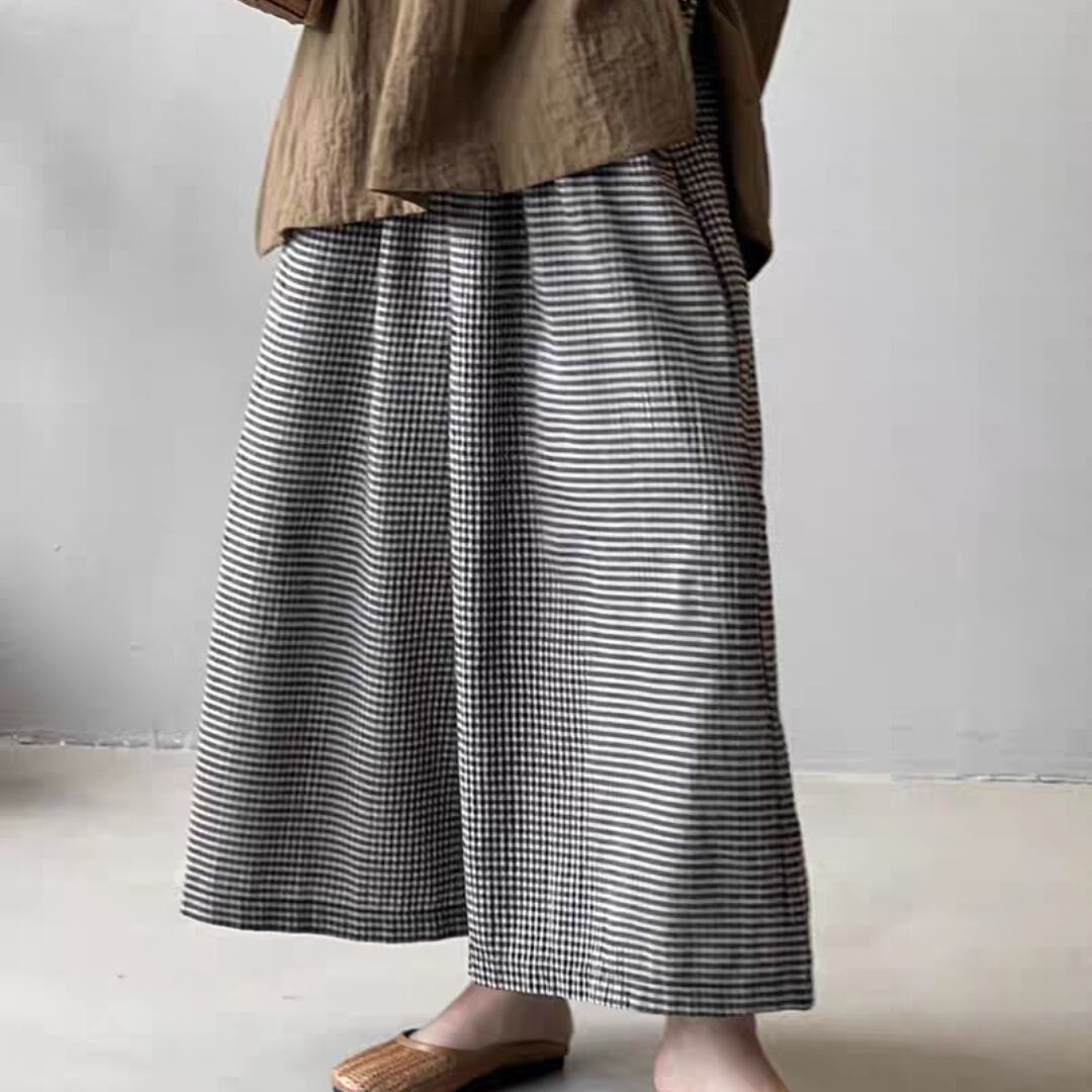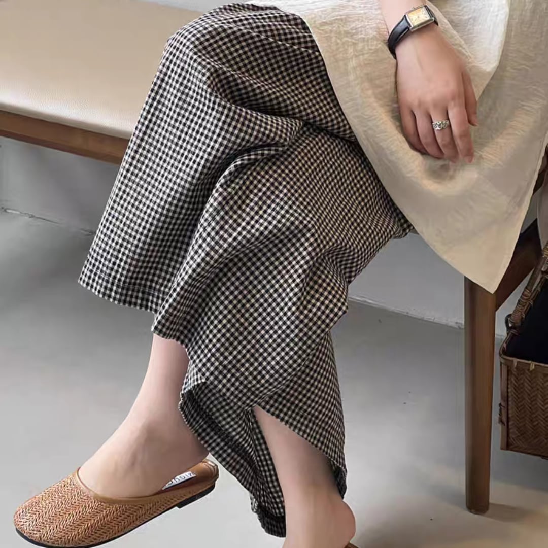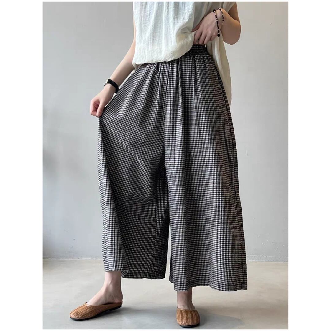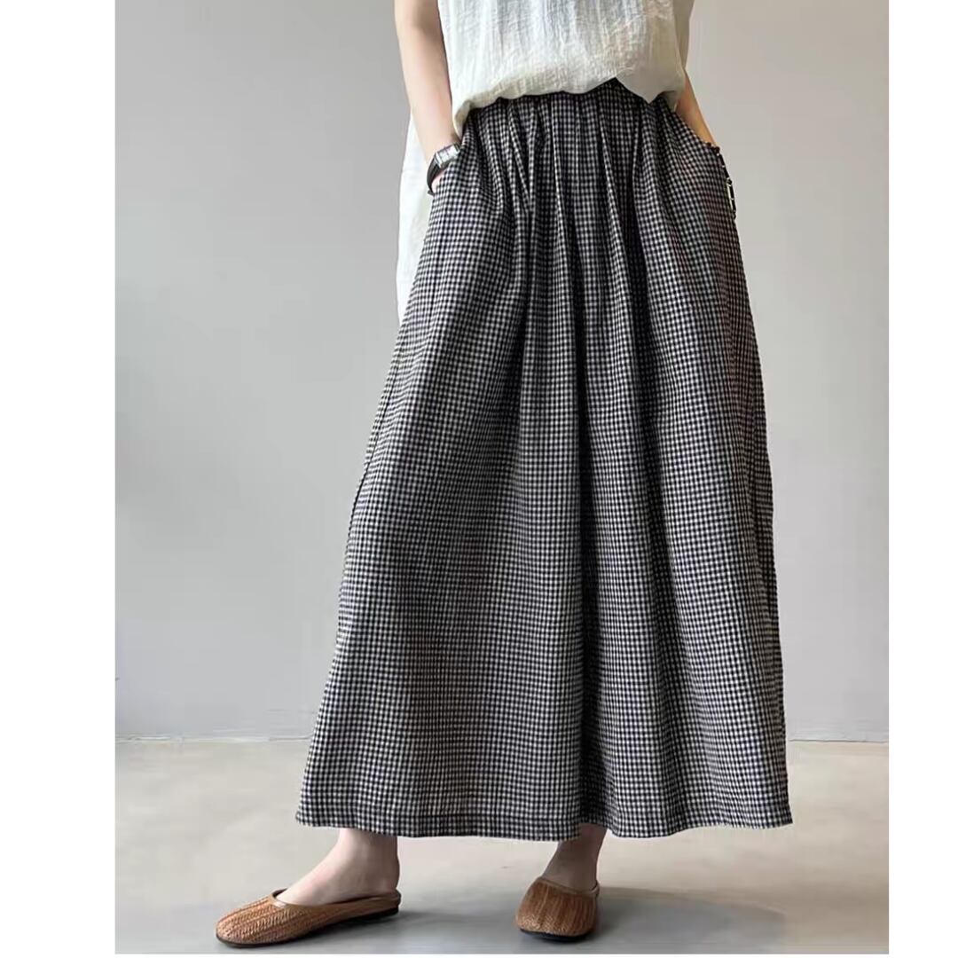 ゆったりとしたシルエットが魅力の、ナチュラル可愛いギンガムチェックワイドパンツ。