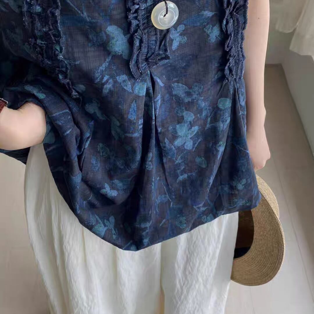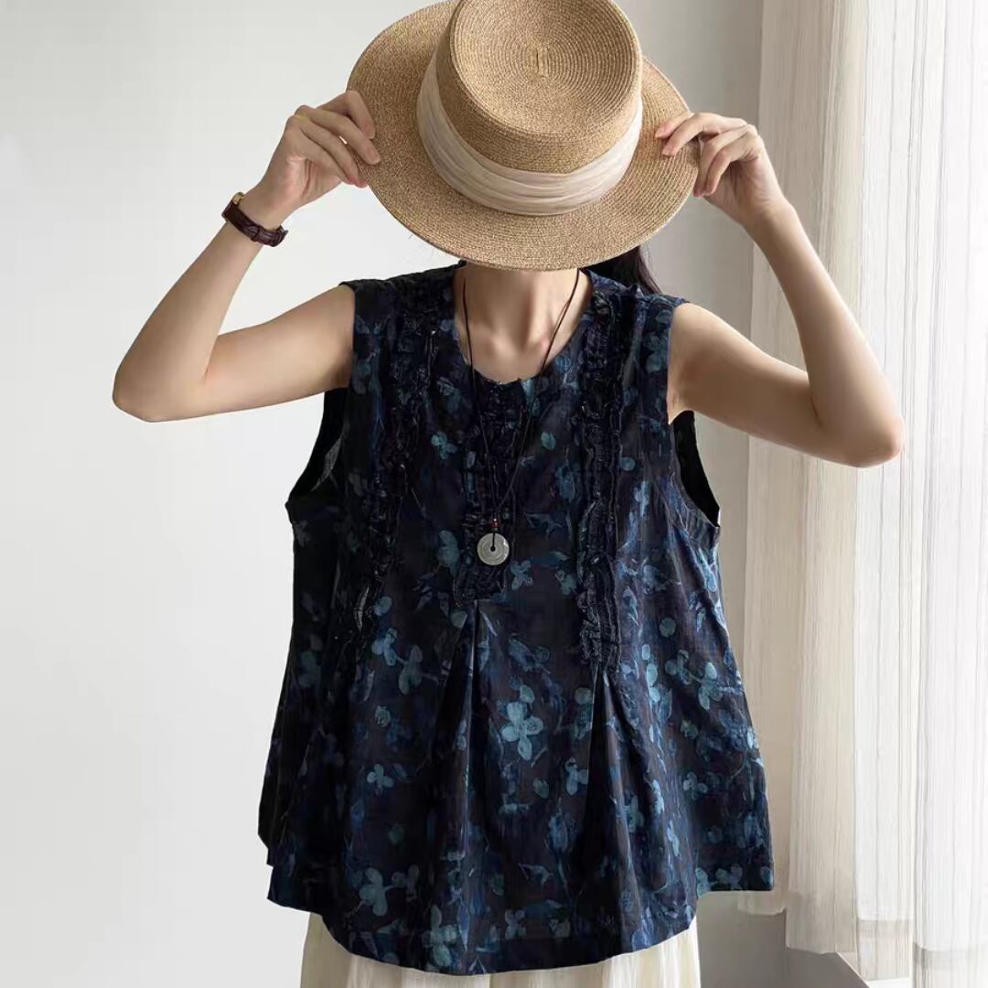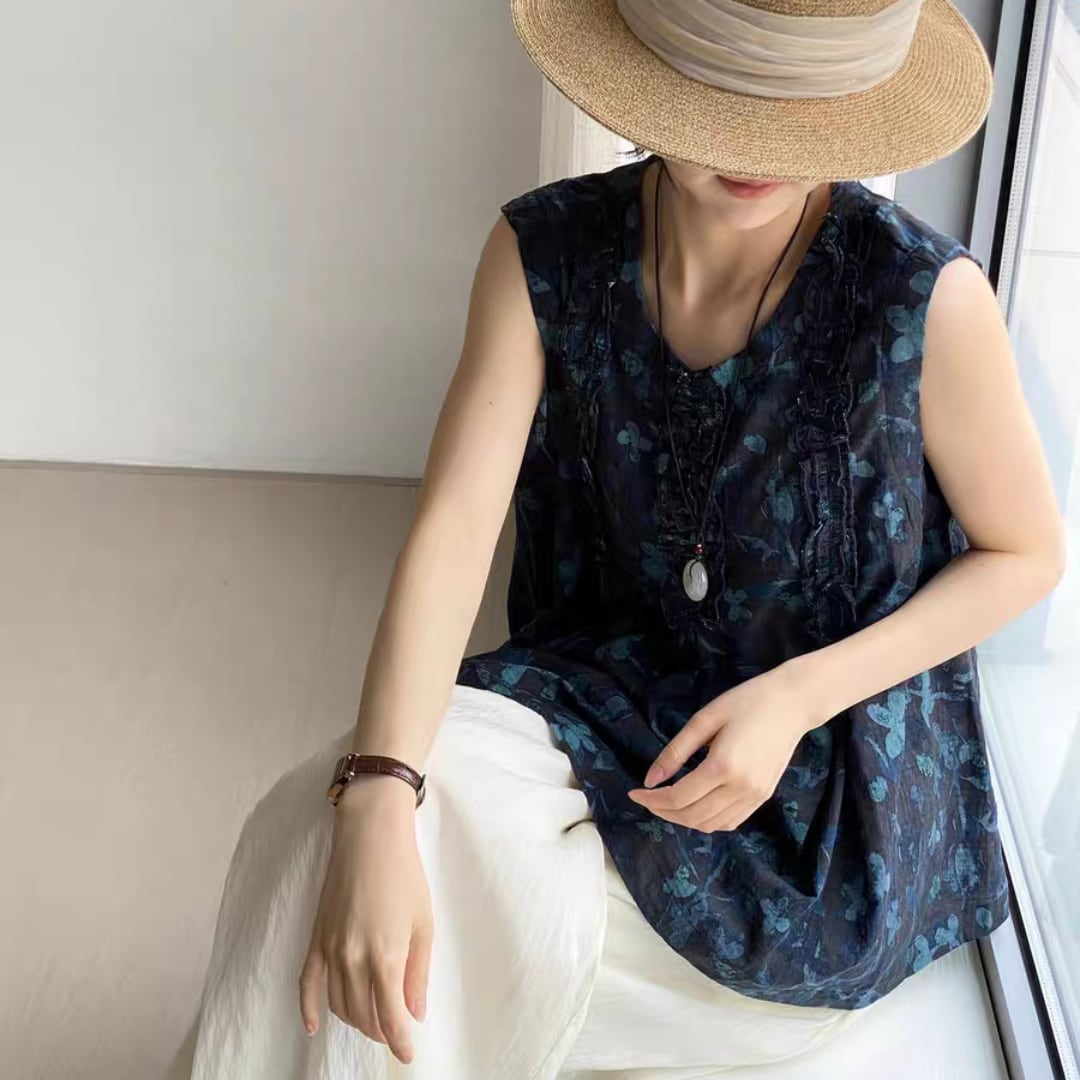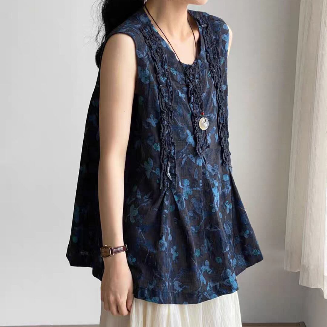 フロントフリル花柄コットンノースリーブブラウス 0024