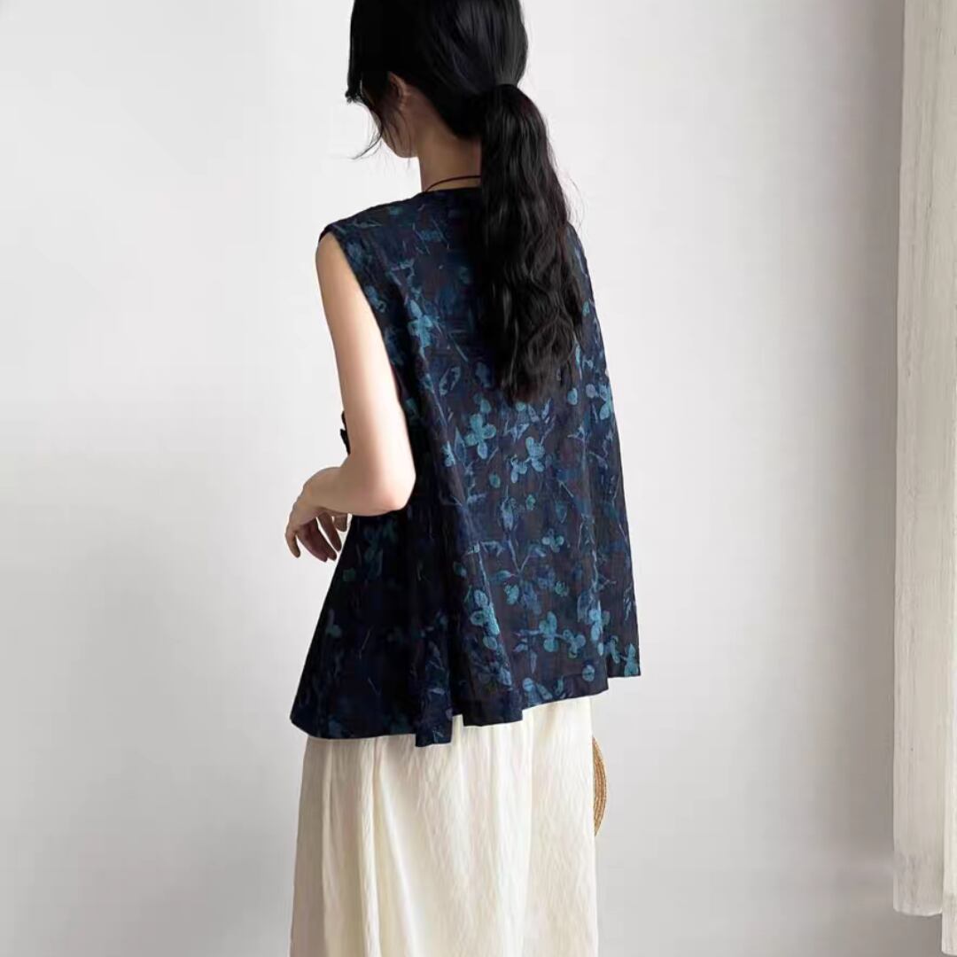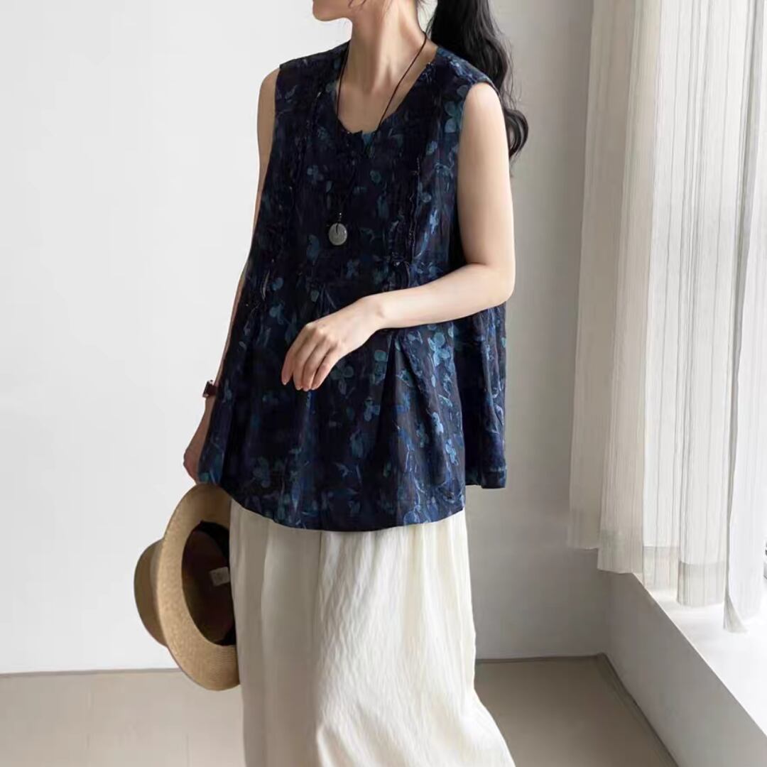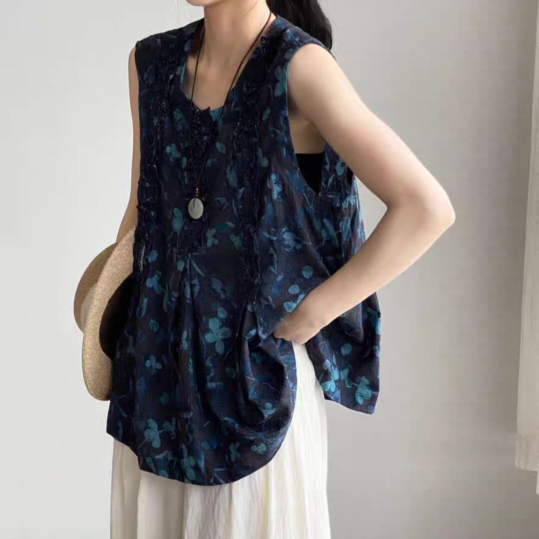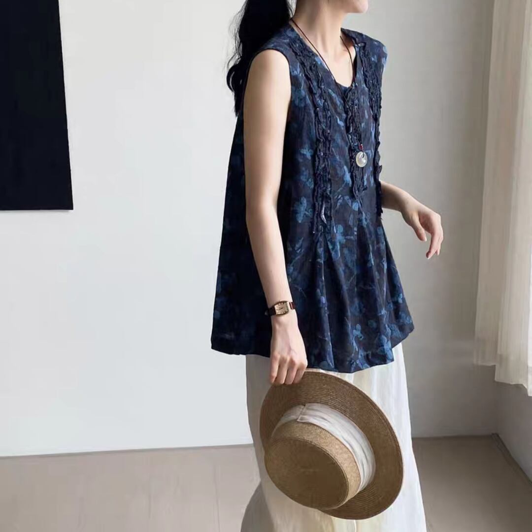 フロントフリル花柄コットンノースリーブブラウス 0024