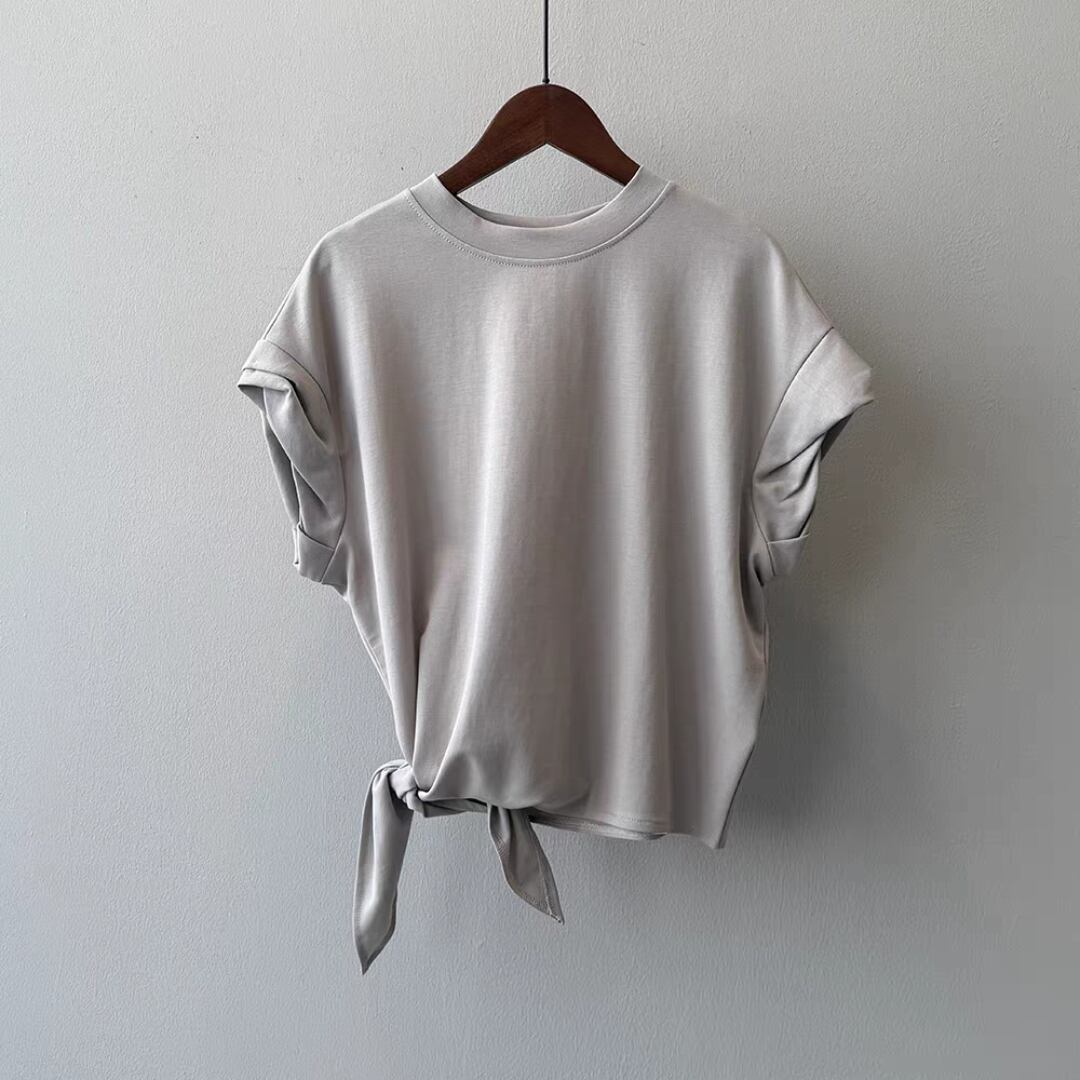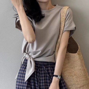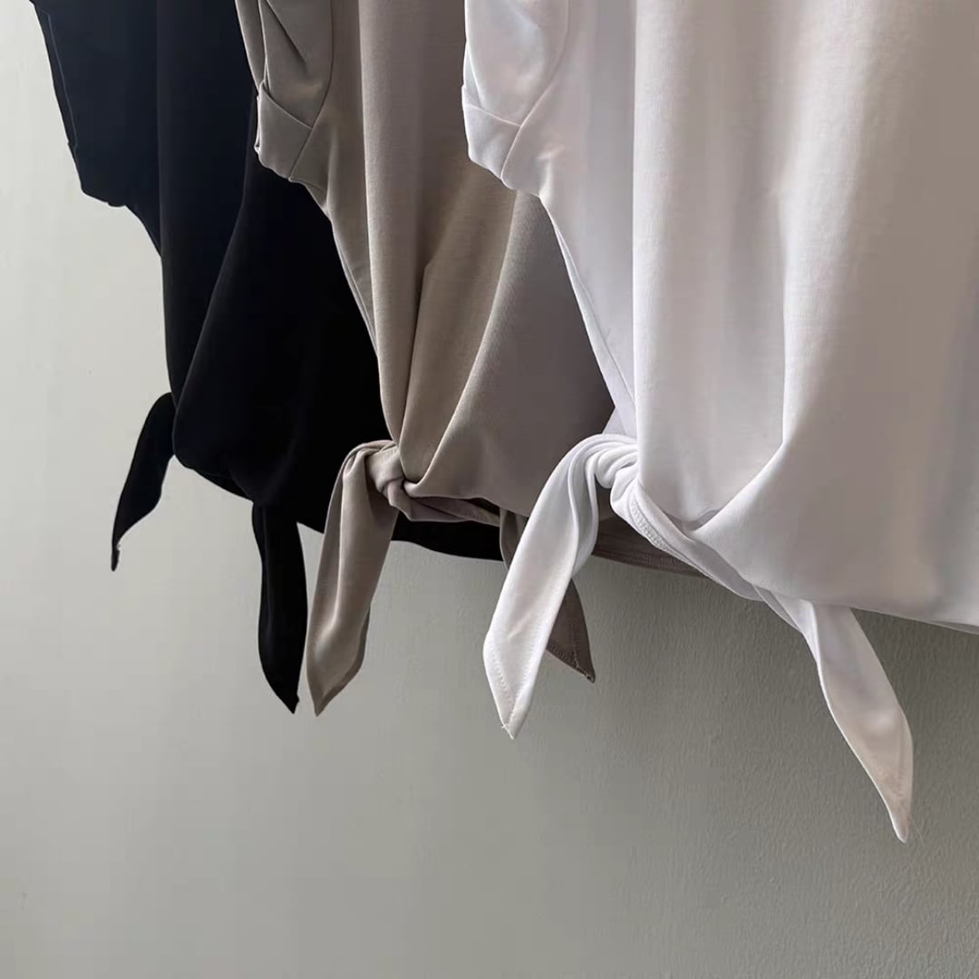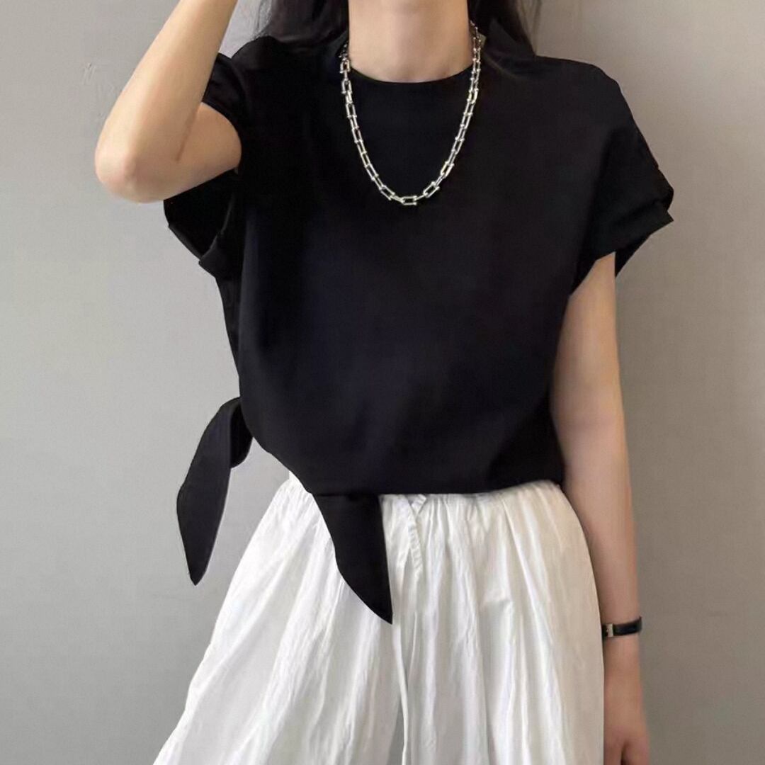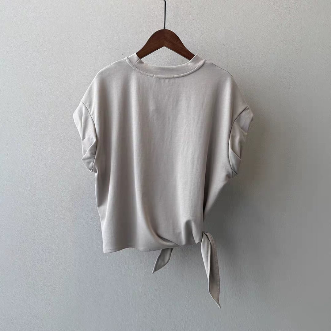 アシンメトリーな裾ラインと、サイドで結ぶリボンディテールがシンプルながらもこなれた印象に。