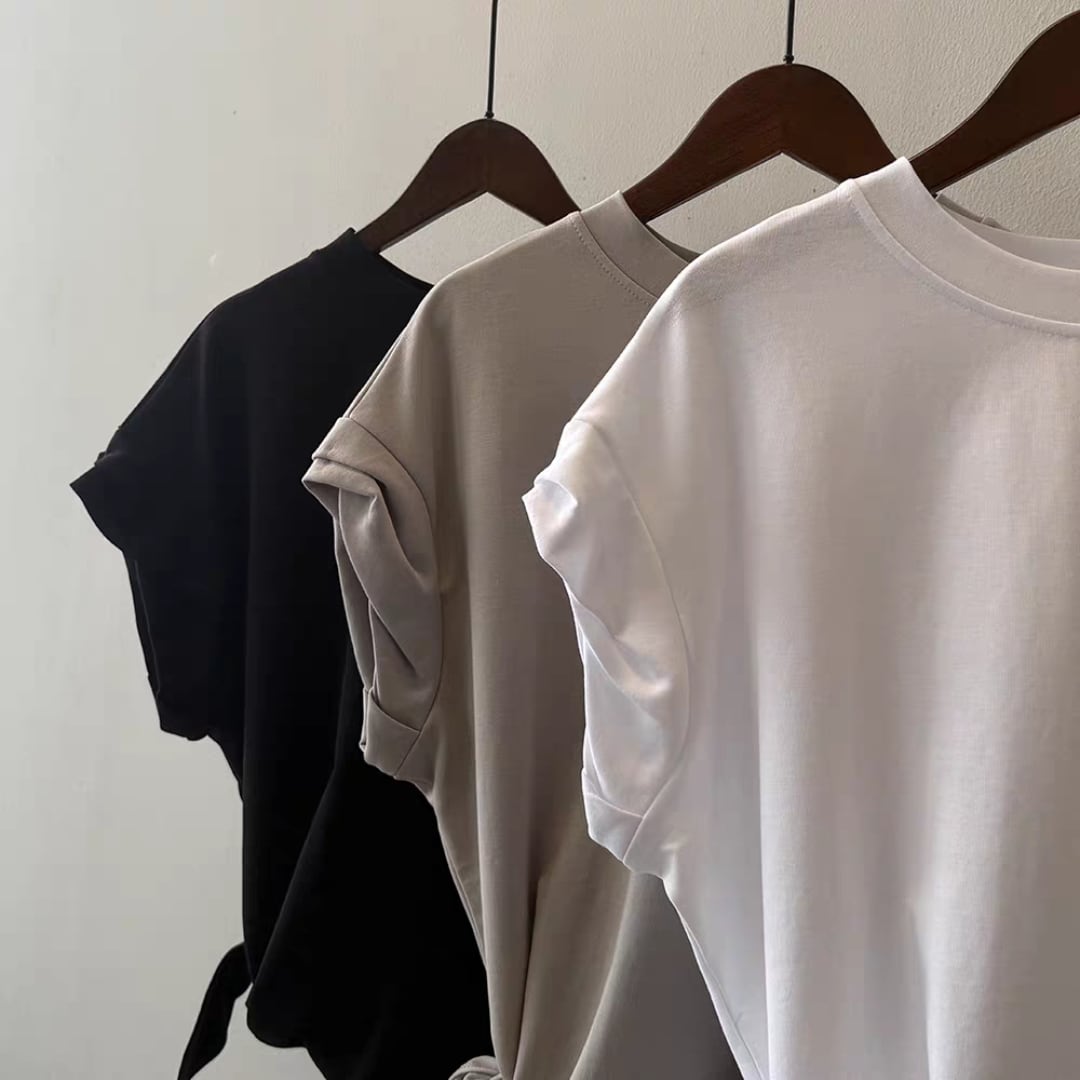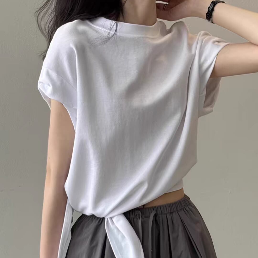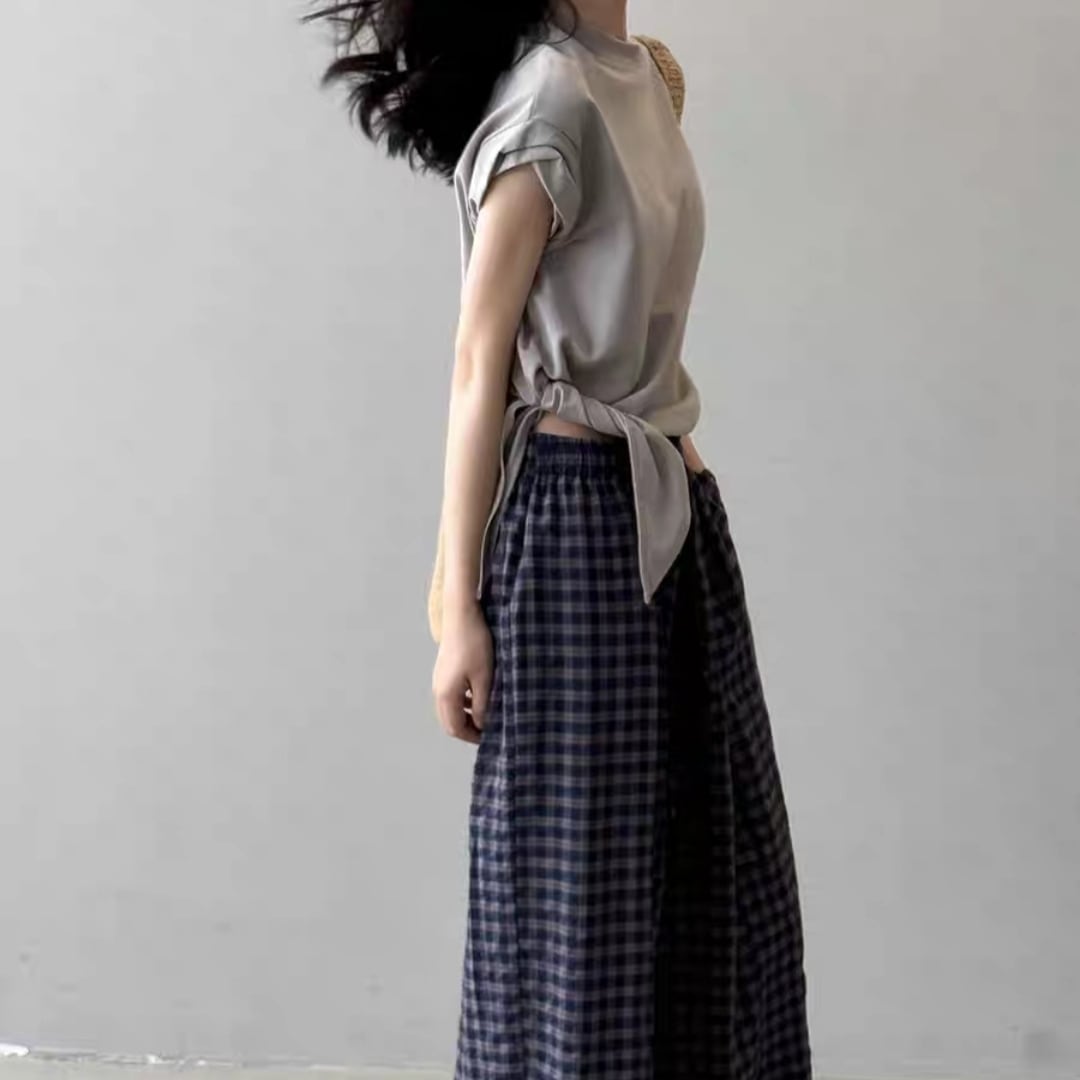 アシンメトリーな裾ラインと、サイドで結ぶリボンディテールがシンプルながらもこなれた印象に。