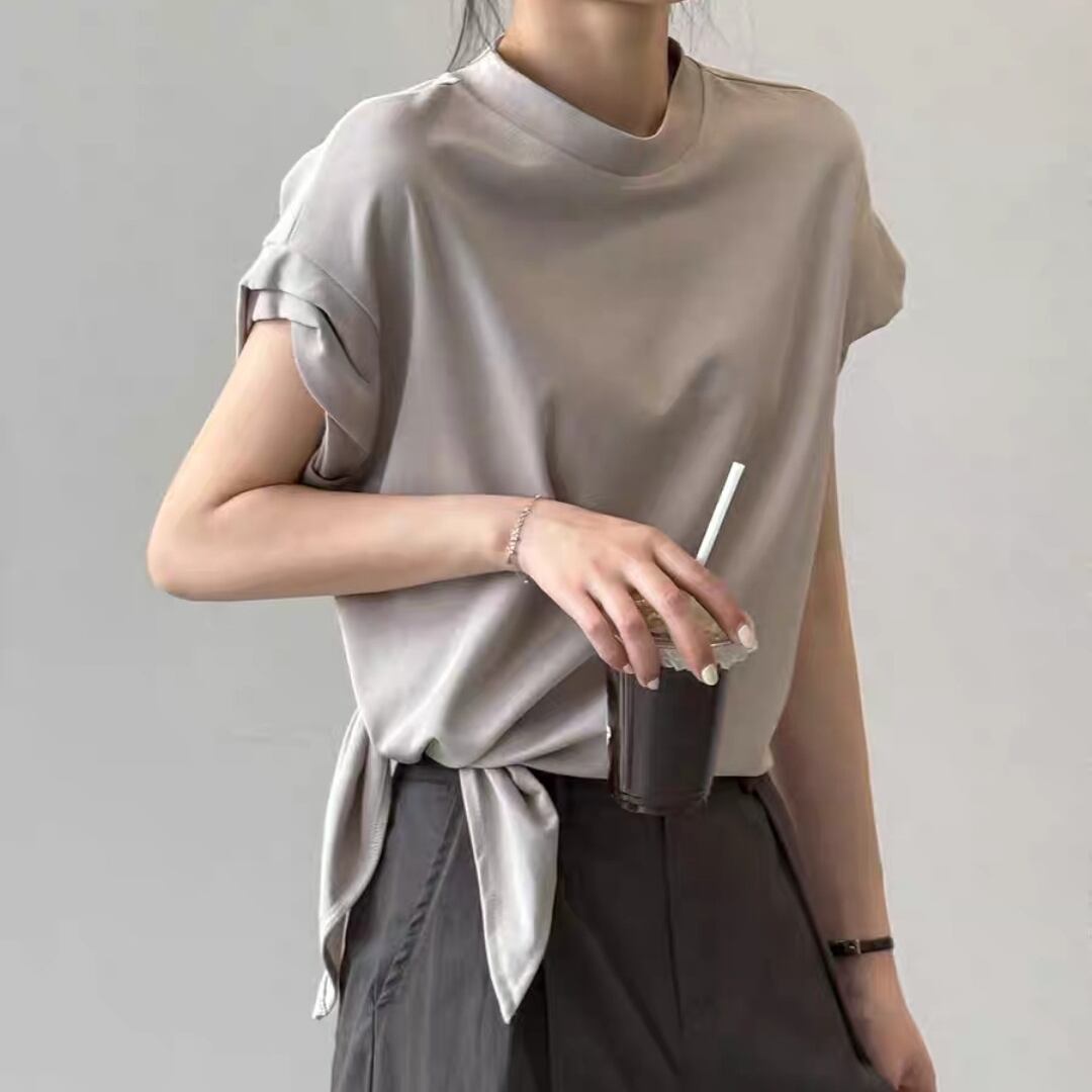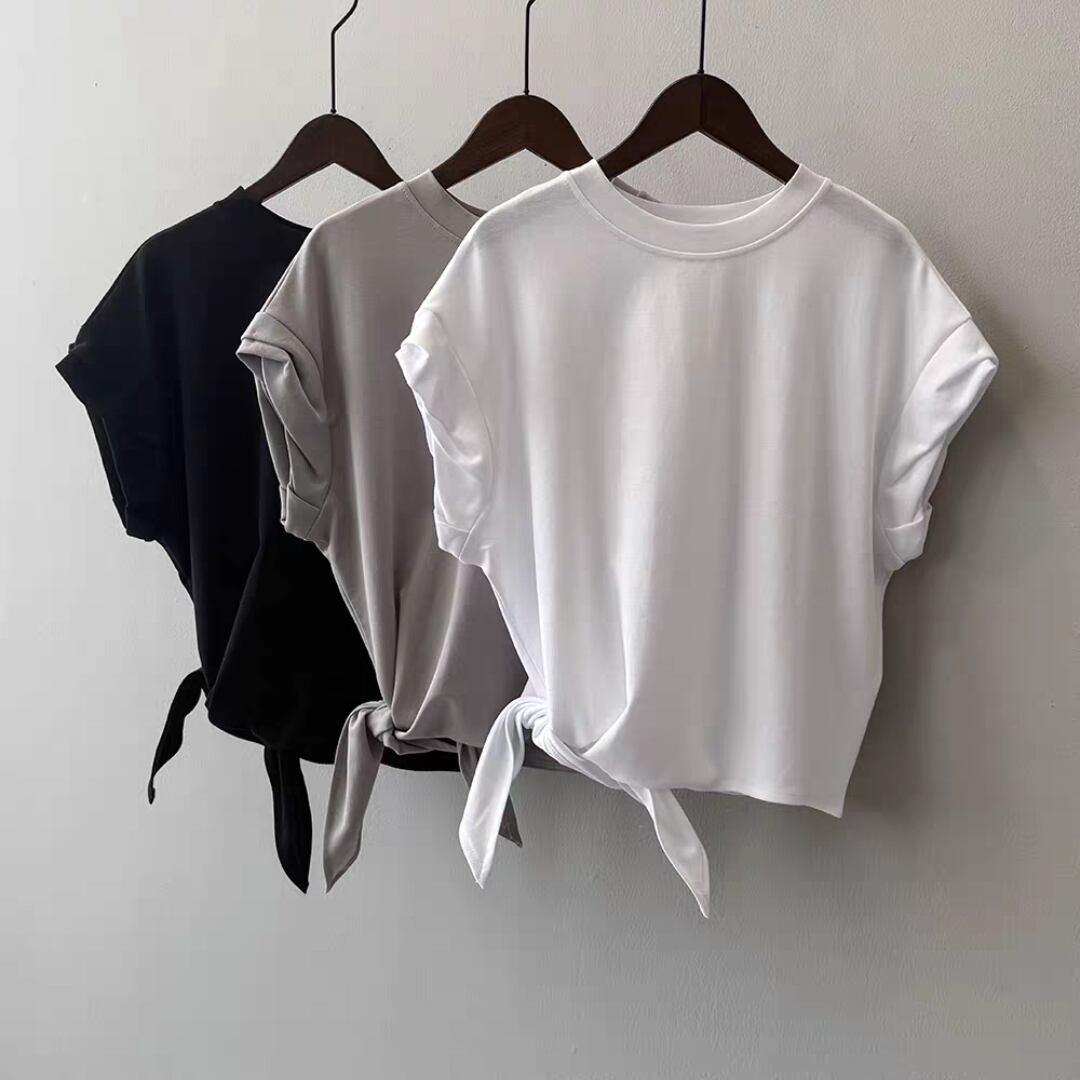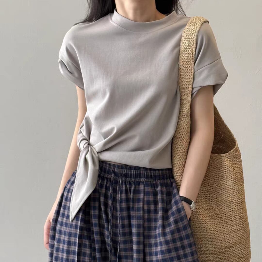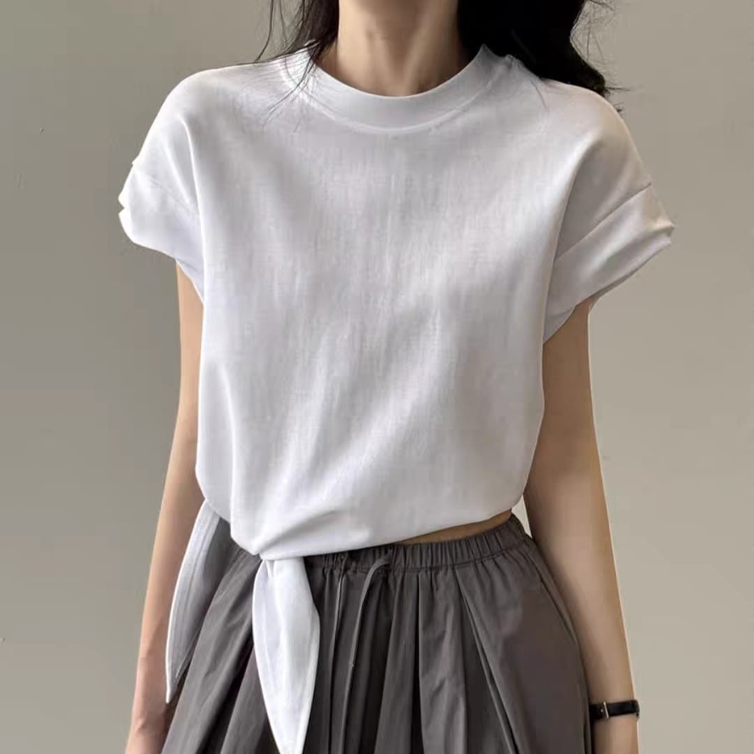 アシンメトリーな裾ラインと、サイドで結ぶリボンディテールがシンプルながらもこなれた印象に。