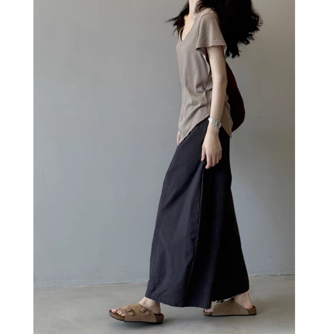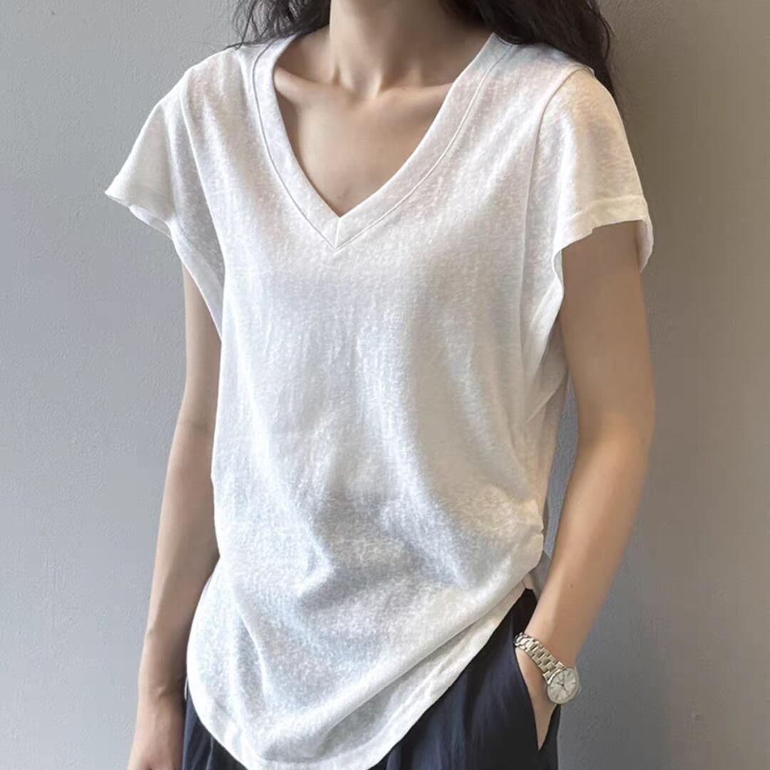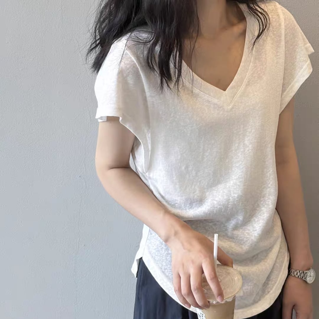 深めのVネックが首元をすっきり見せ、