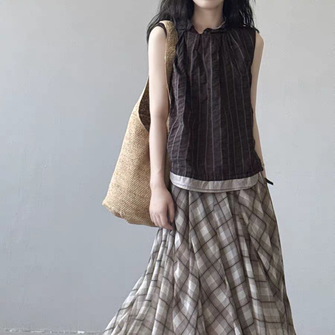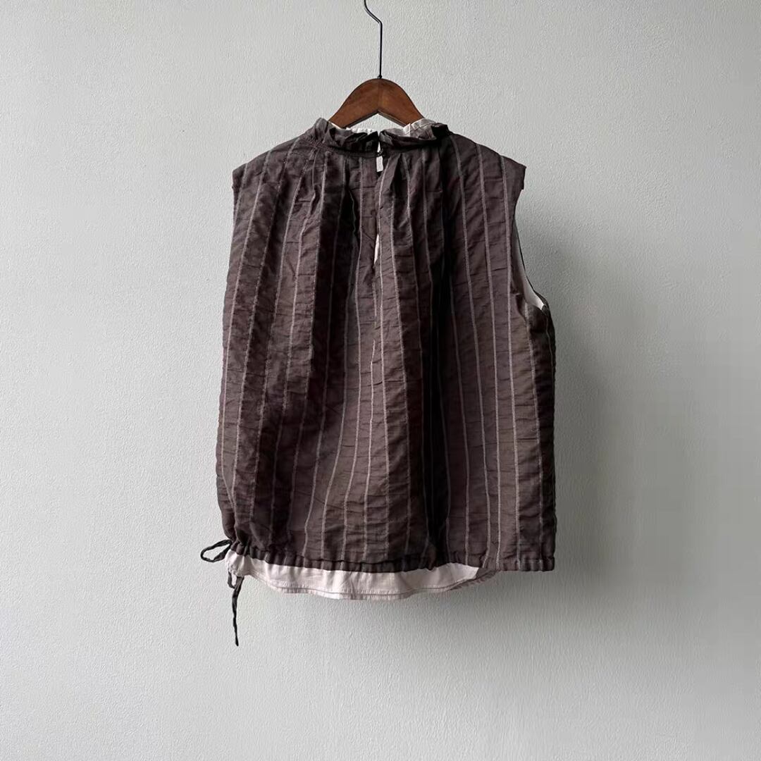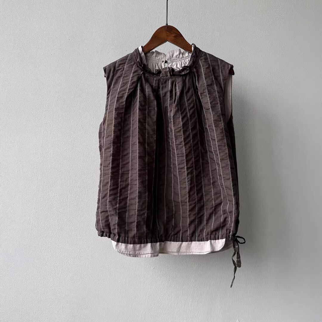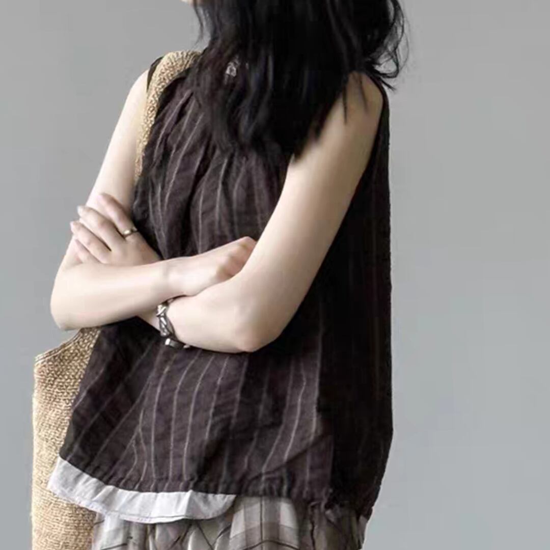 レイヤード風デザインが魅力のノースリーブトップス。パンツにもスカートにも合わせやすく、夏のカジュアルコーデにぴったりです。