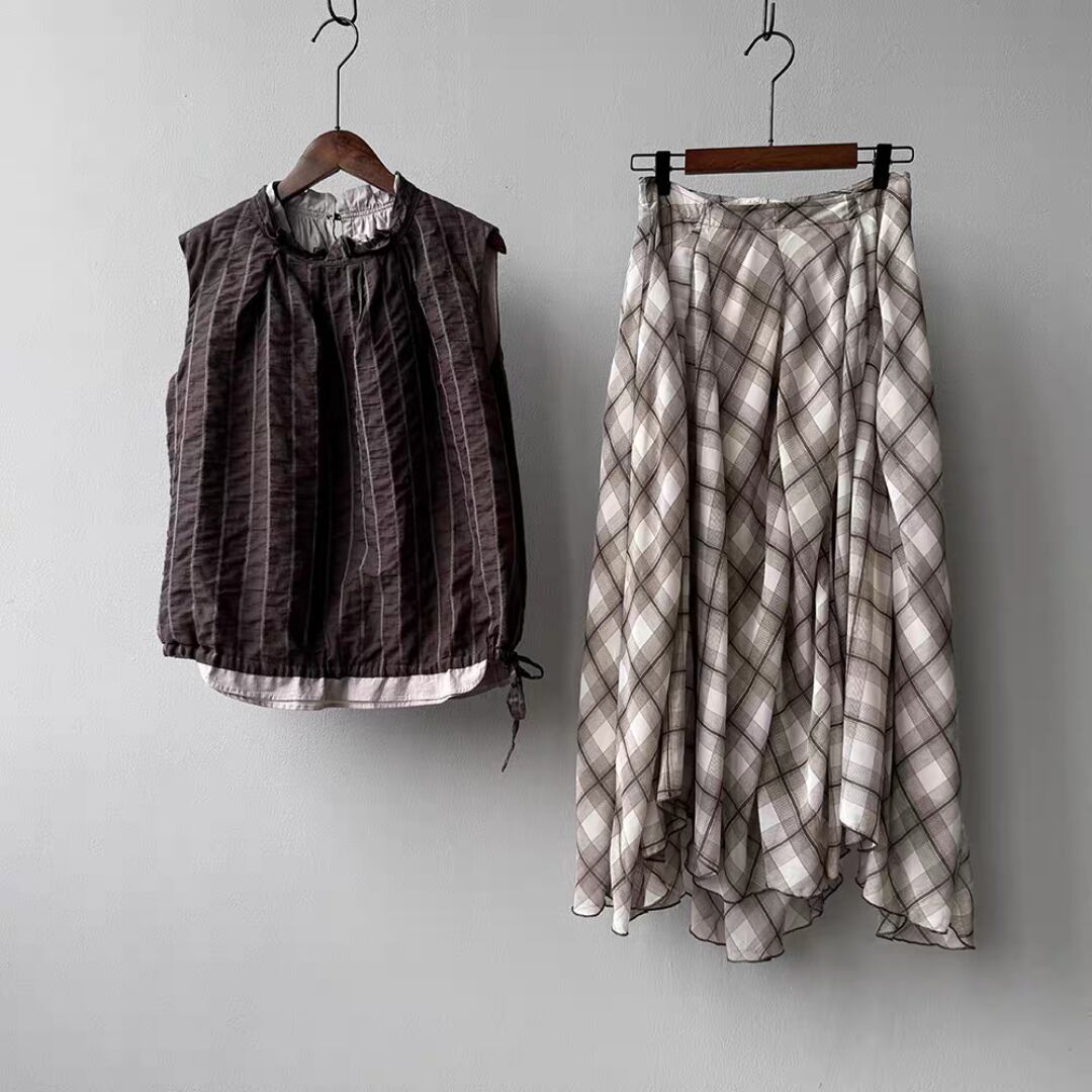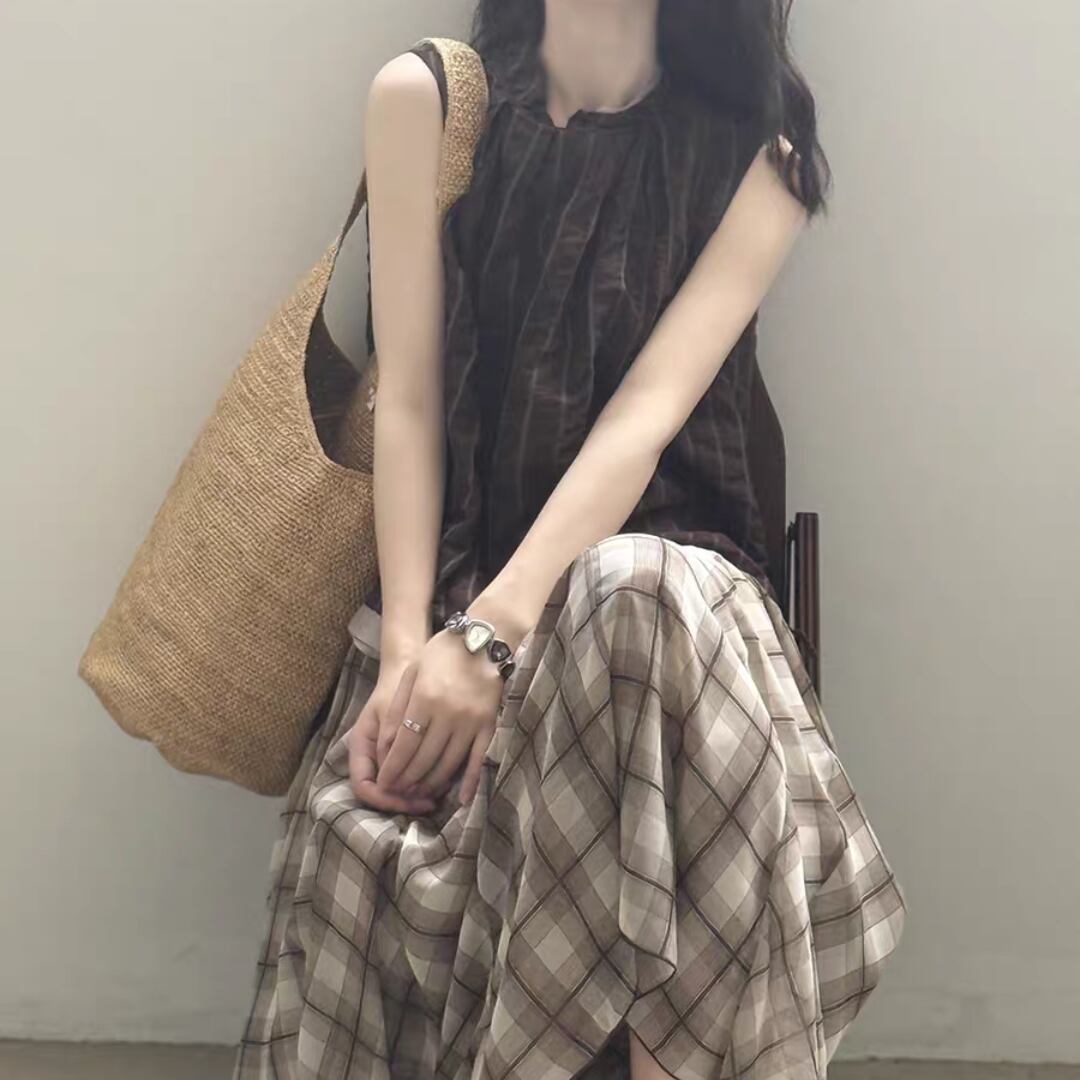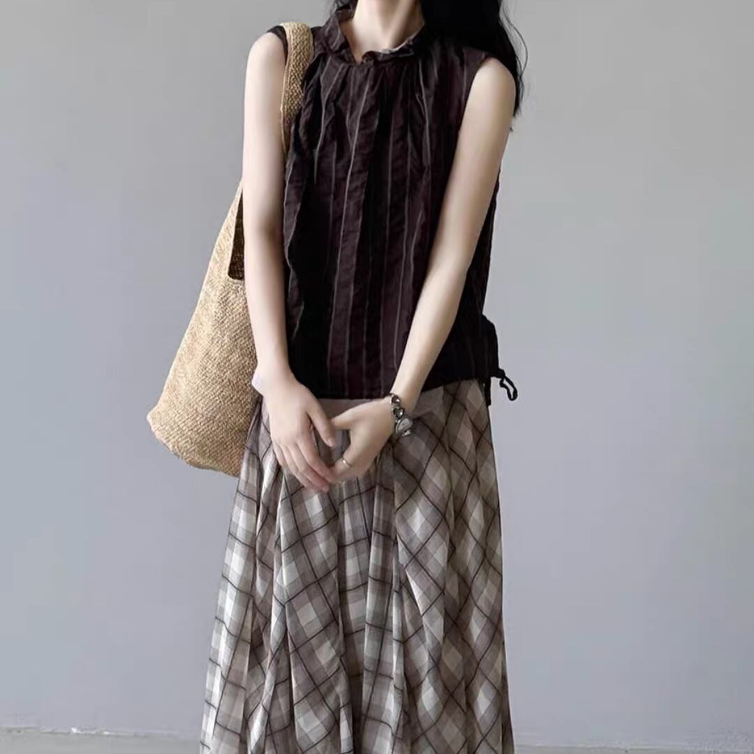 レイヤード風デザインが魅力のノースリーブトップス。パンツにもスカートにも合わせやすく、夏のカジュアルコーデにぴったりです。