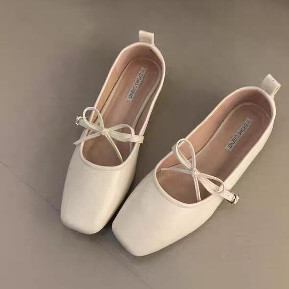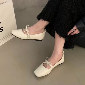 シンプルながらフェミニンなアクセントを効かせた、リボンストラップ付きのフラットシューズ。