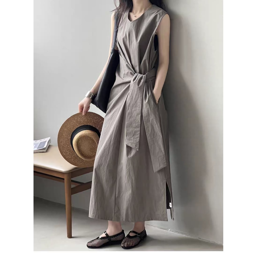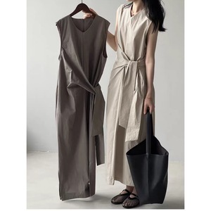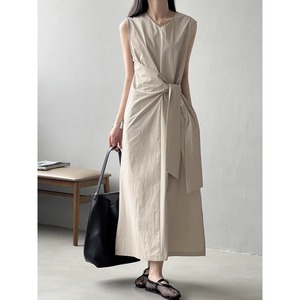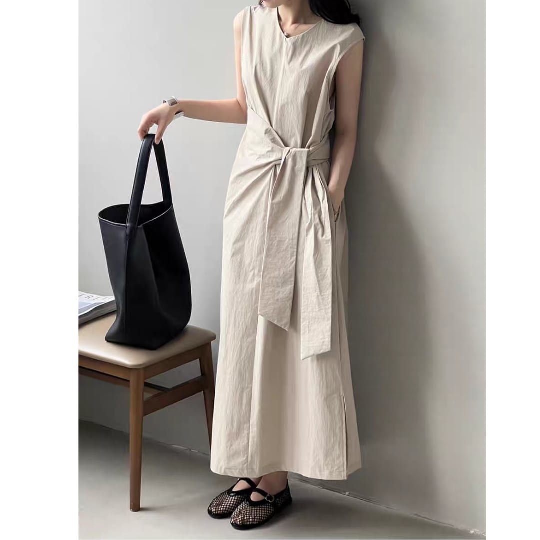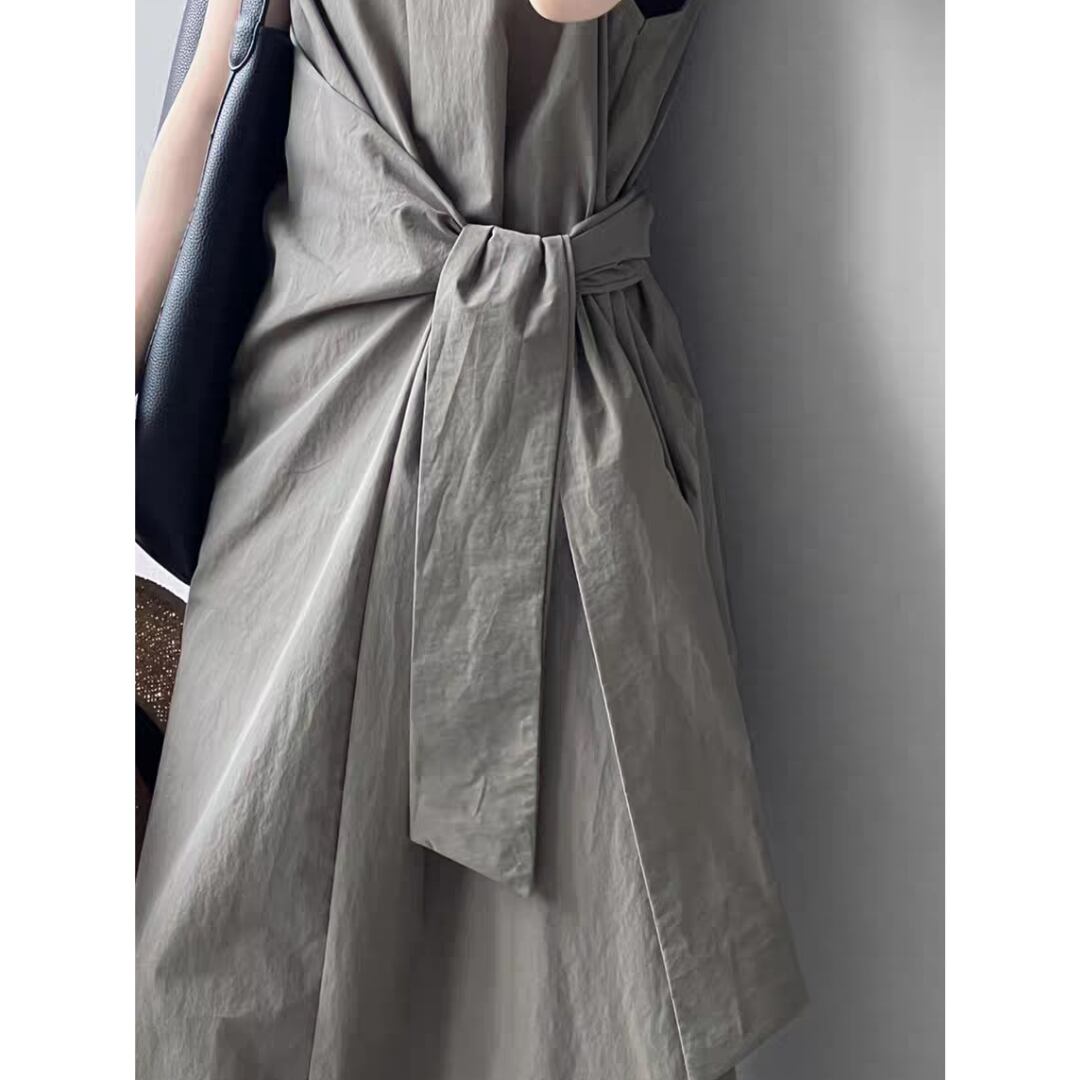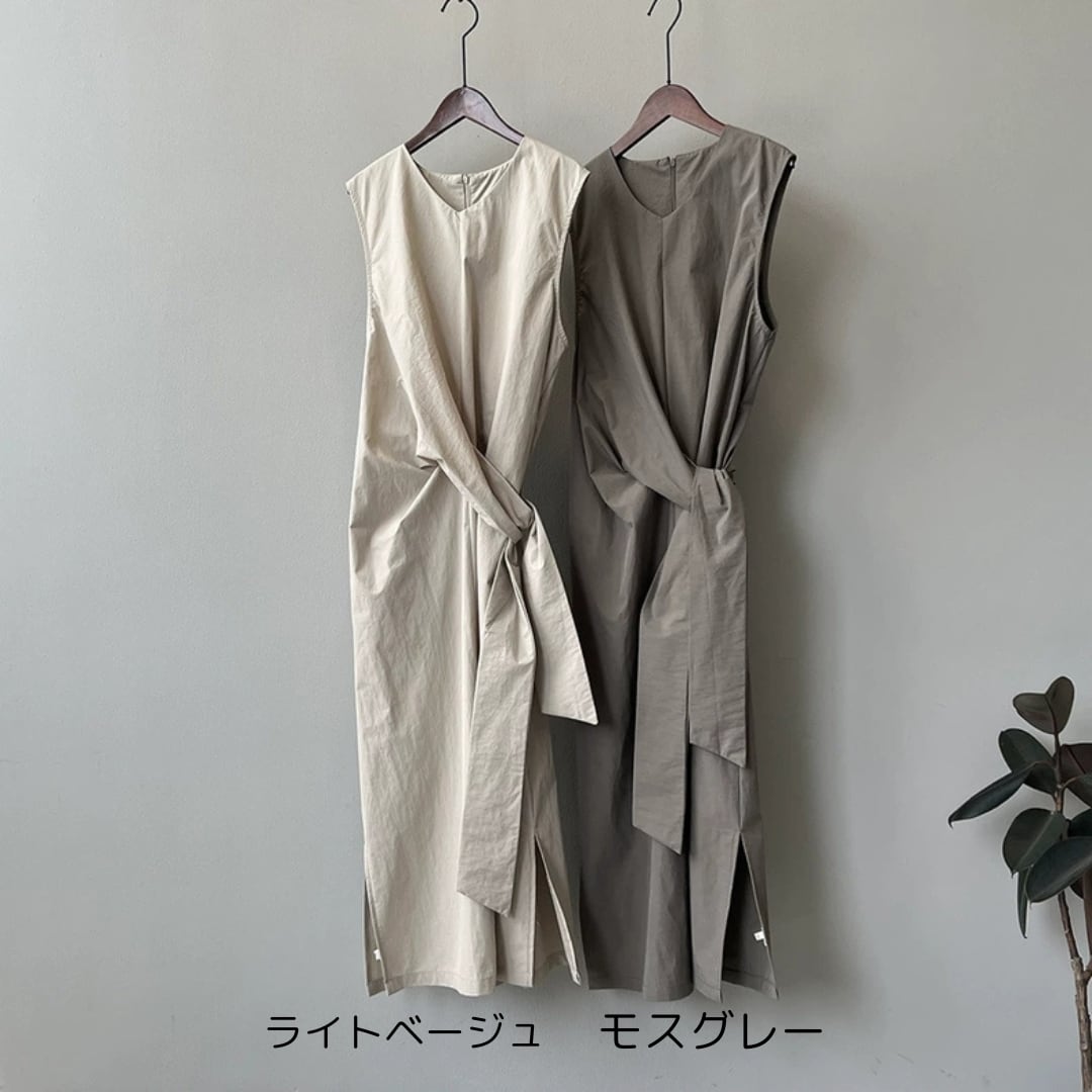 フロントのラップデザインと大胆なウエストリボンがポイントで、1枚でこなれ感のあるスタイルが完成。サイドスリット入りで動きやすく、抜け感も演出します。