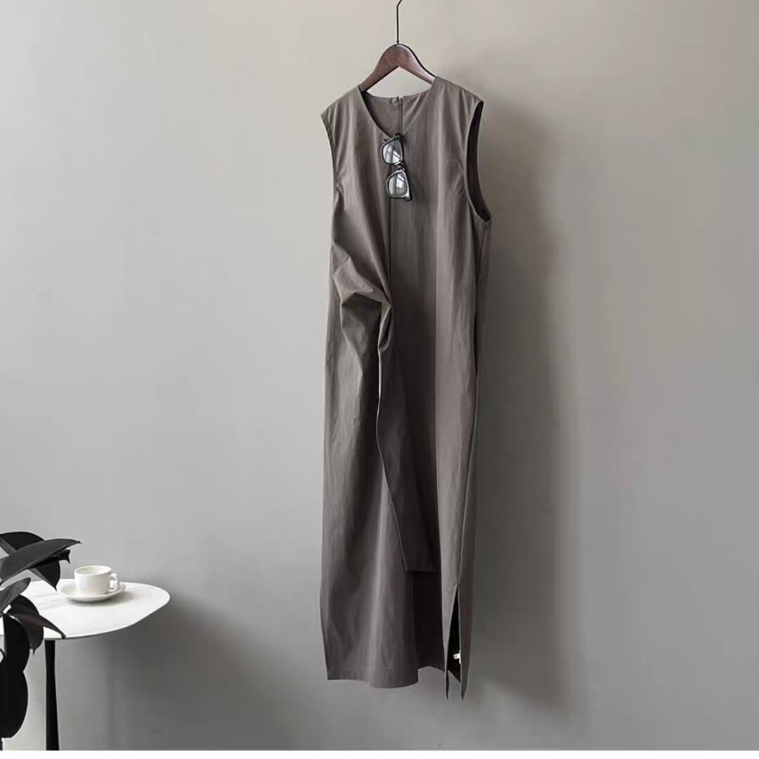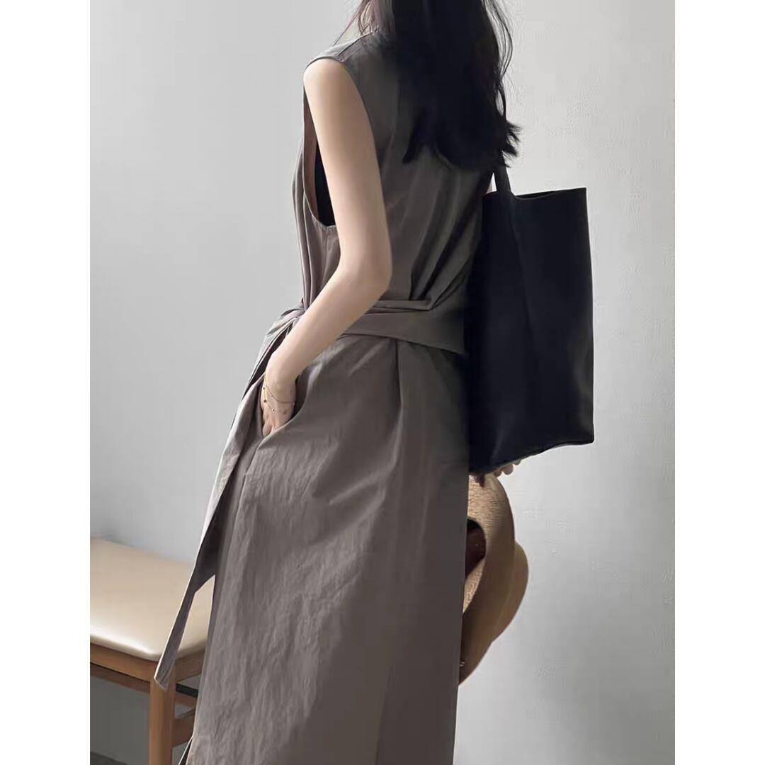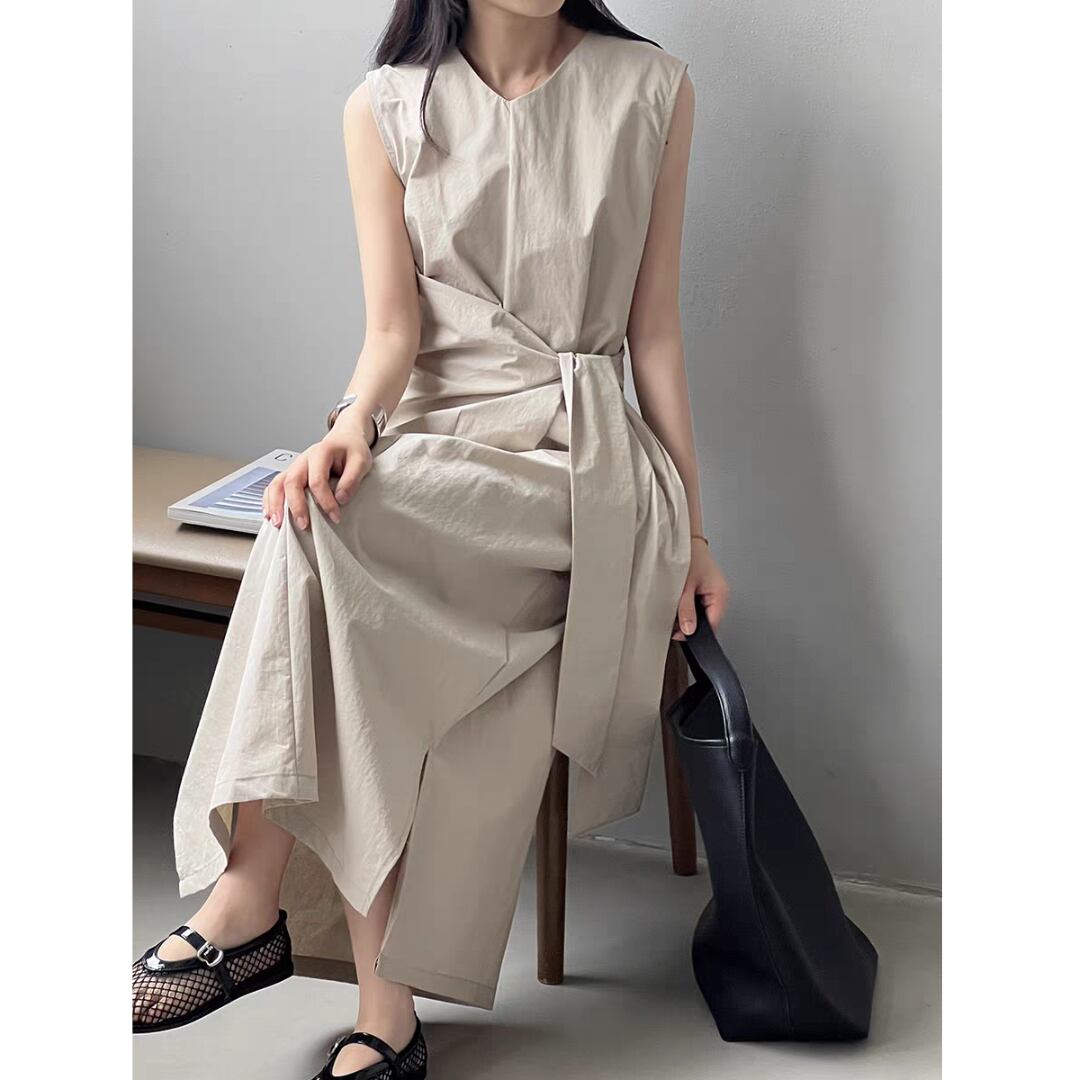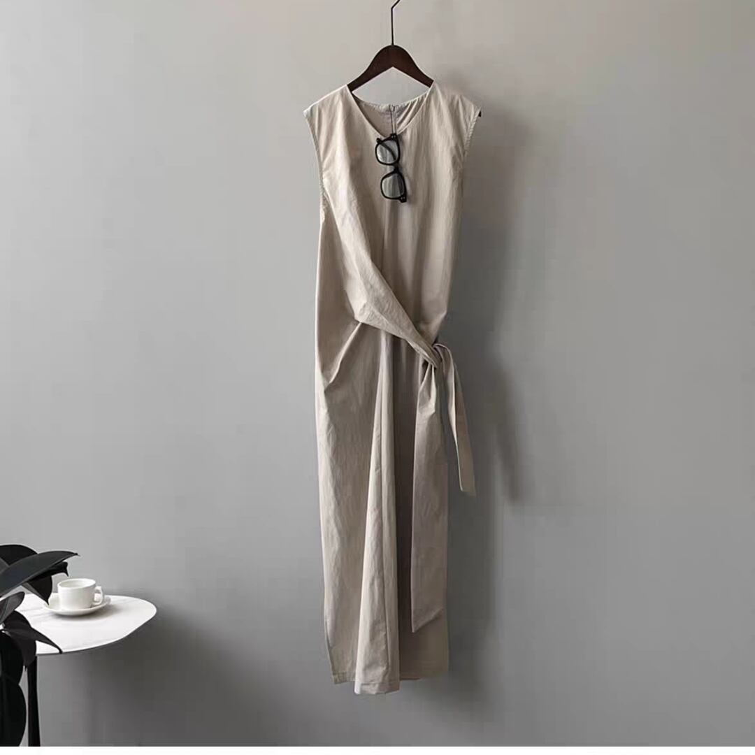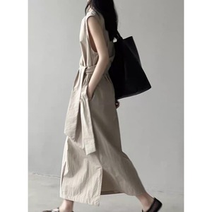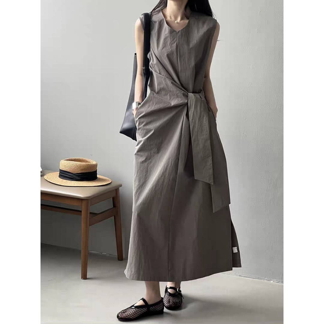 フロントのラップデザインと大胆なウエストリボンがポイントで、1枚でこなれ感のあるスタイルが完成。サイドスリット入りで動きやすく、抜け感も演出します。