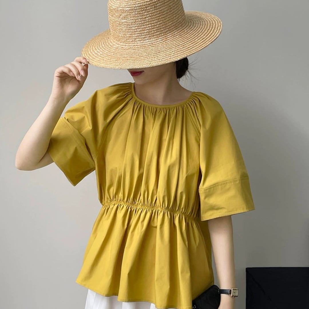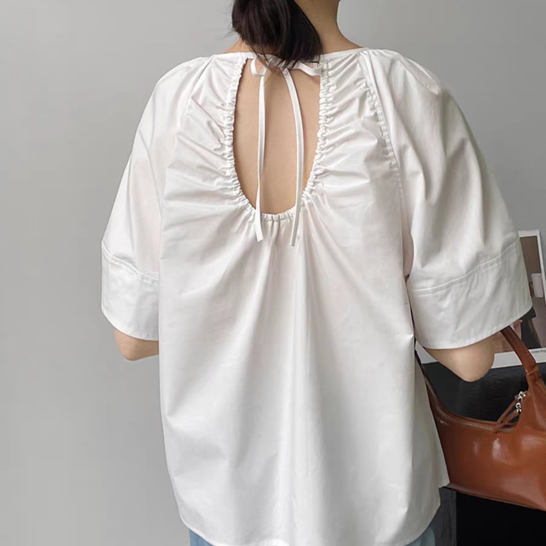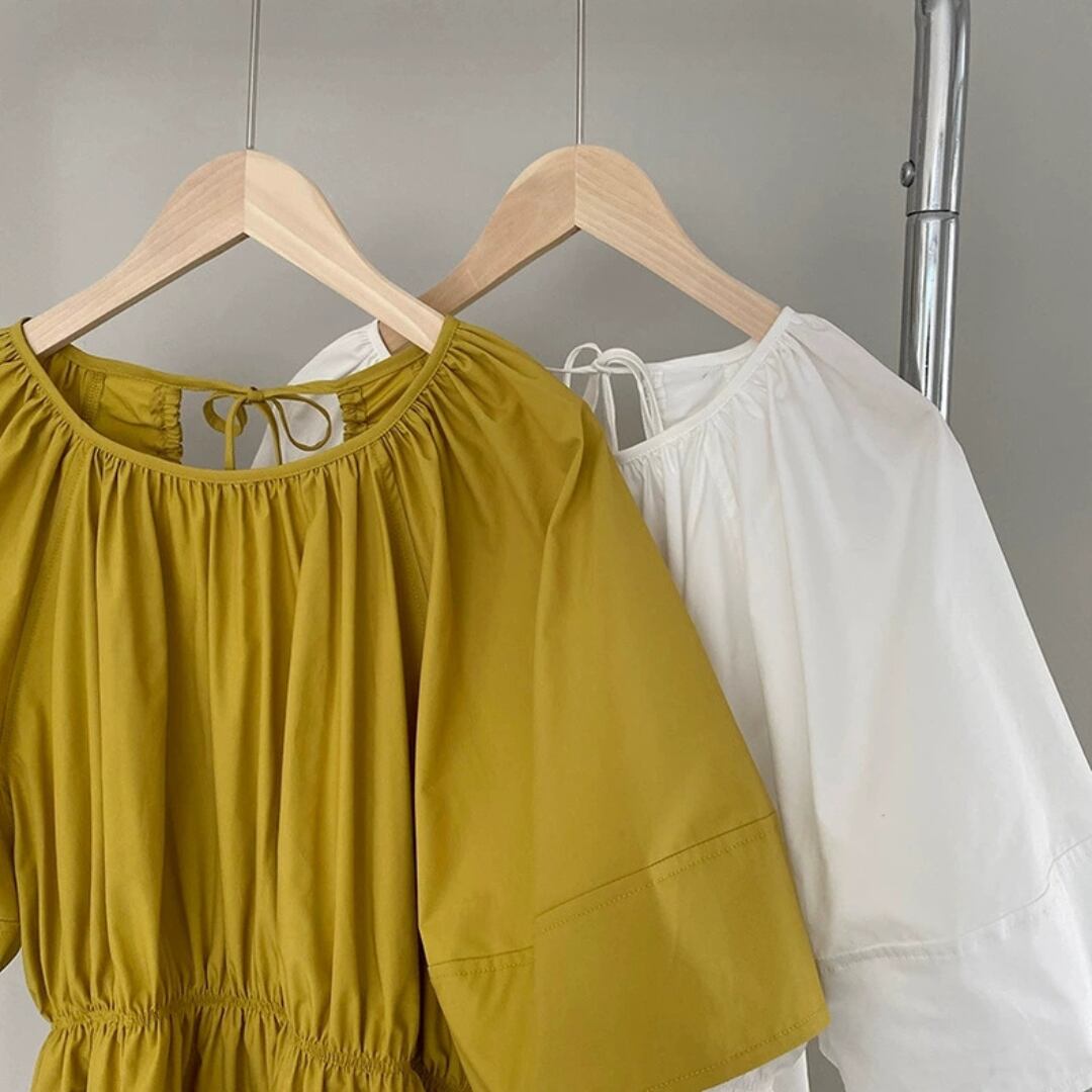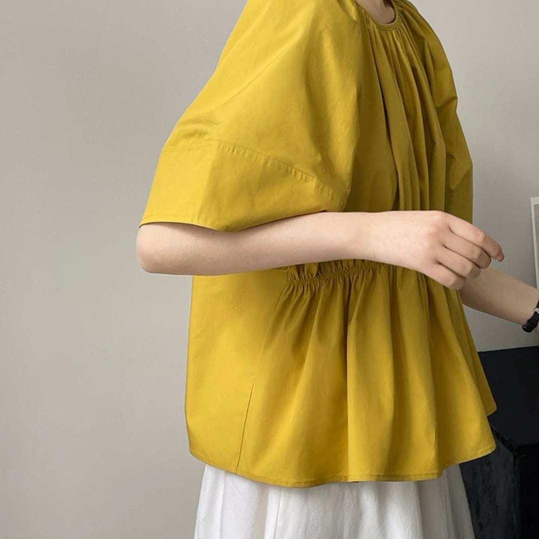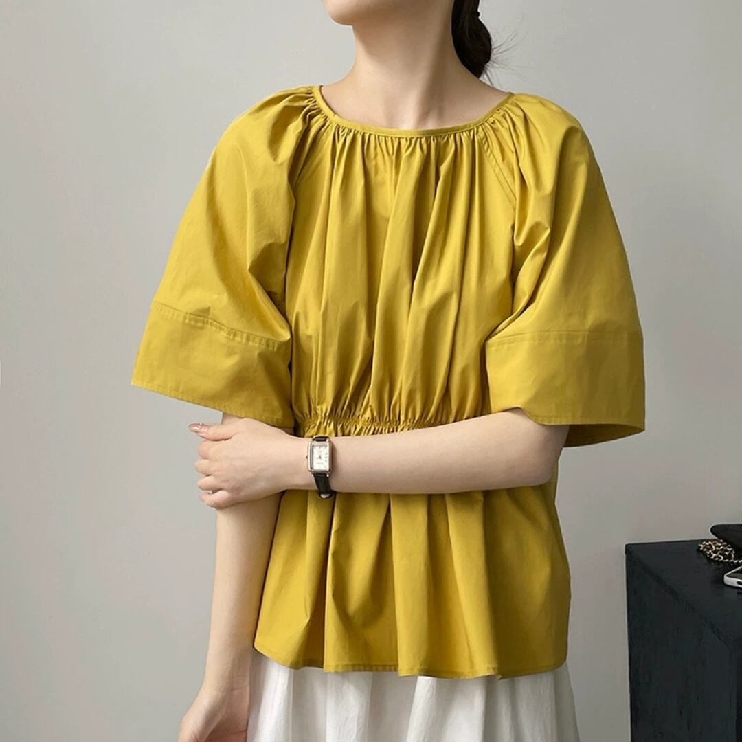 フロントもバックも、ふんわりとギャザーを効かせたフェミニンなシルエットが魅力のブラウス。