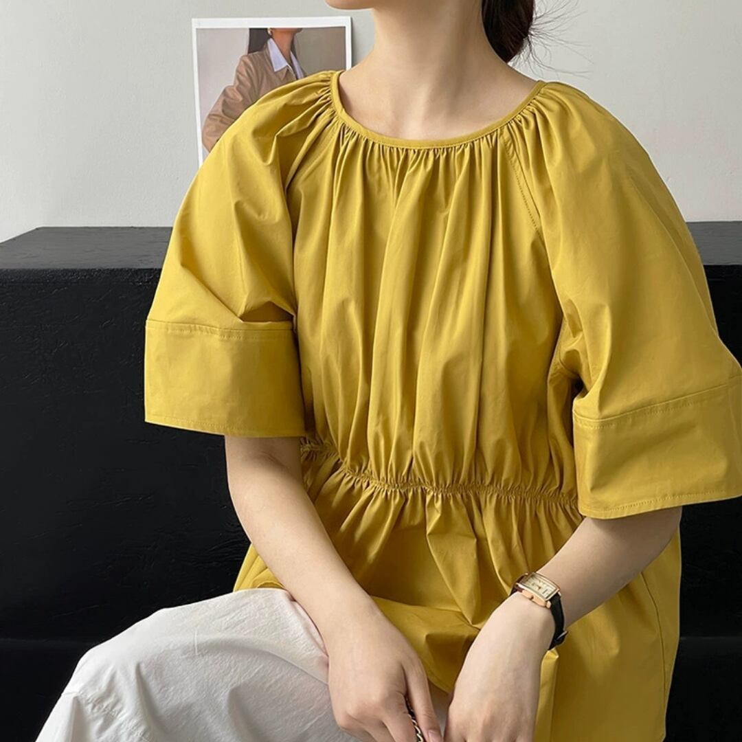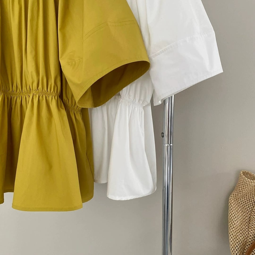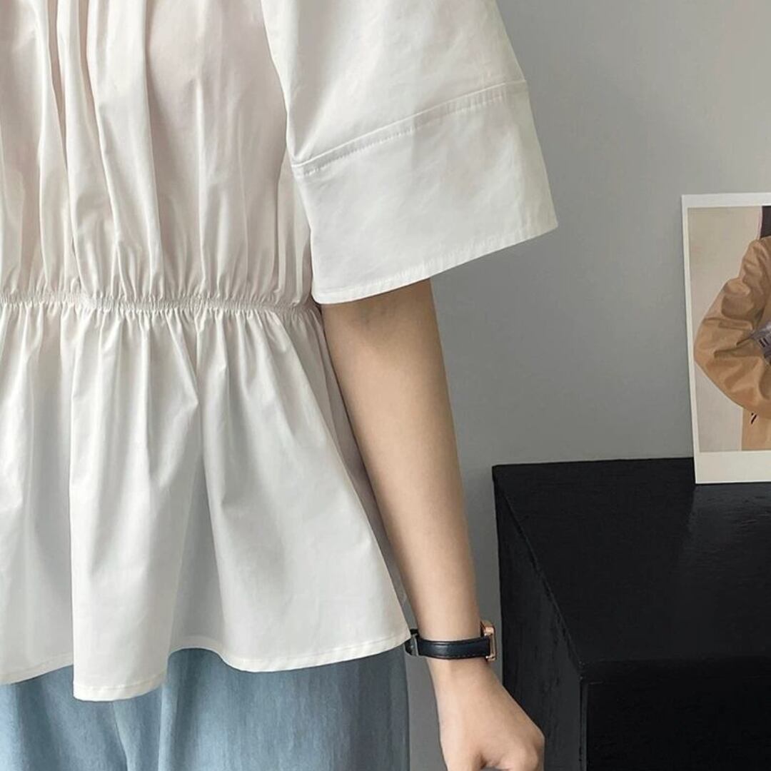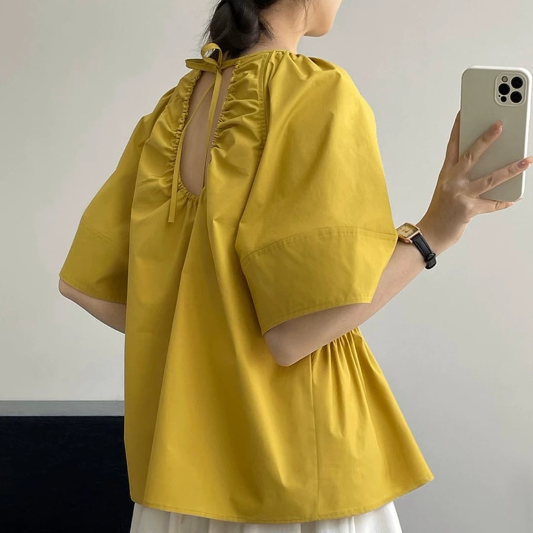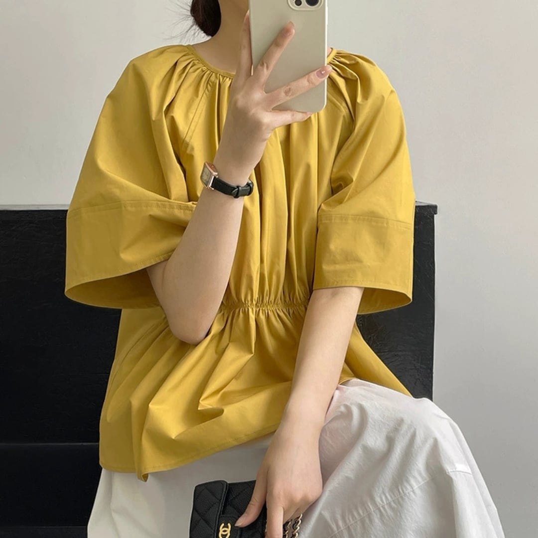 フロントもバックも、ふんわりとギャザーを効かせたフェミニンなシルエットが魅力のブラウス。