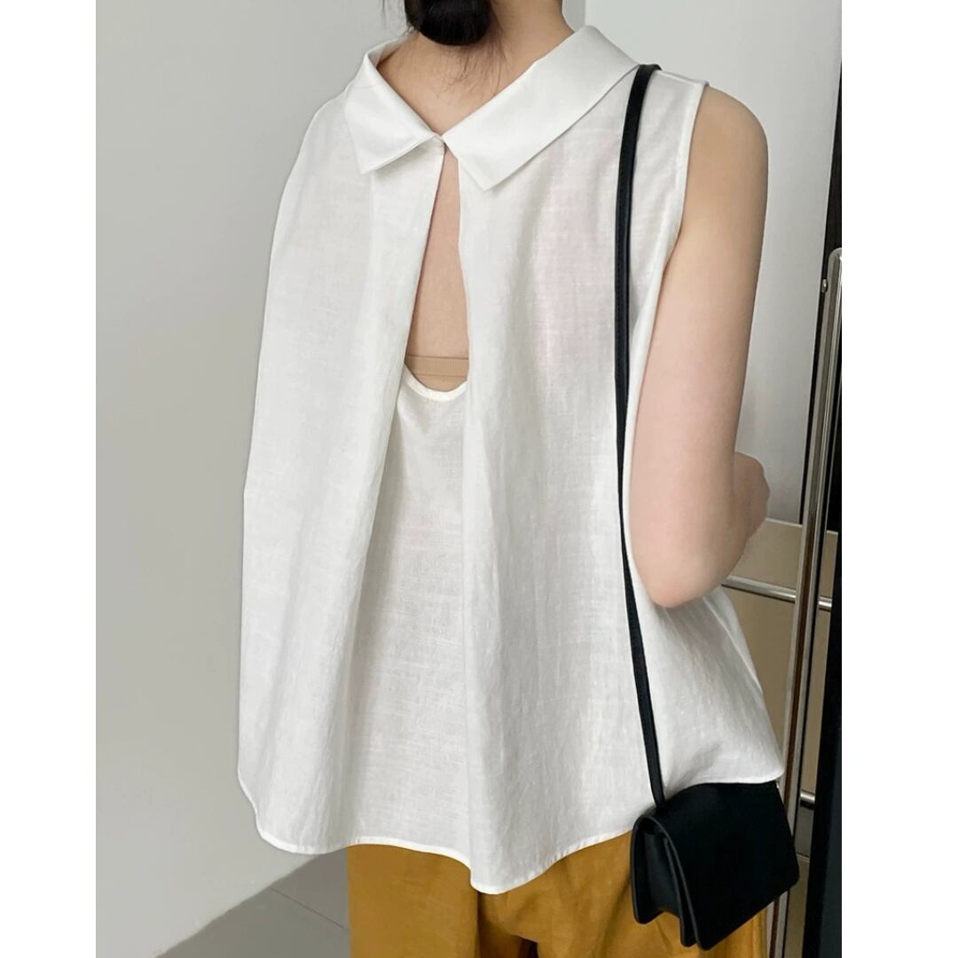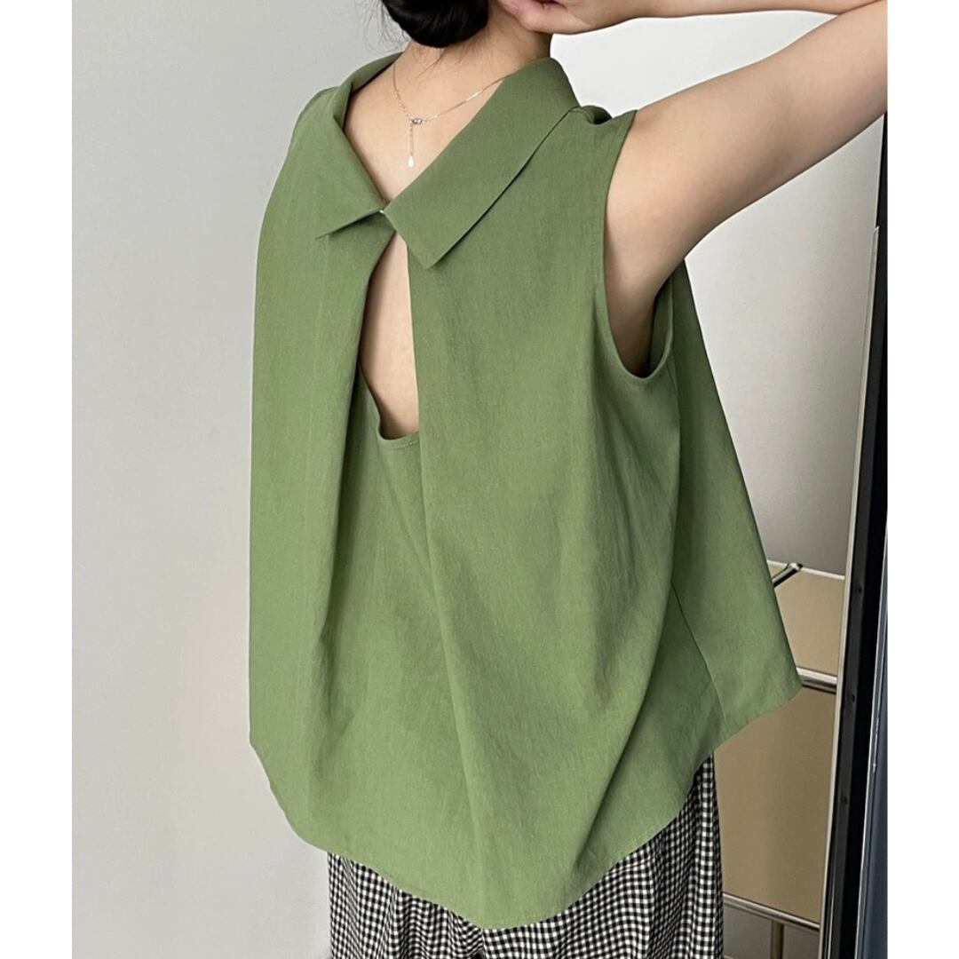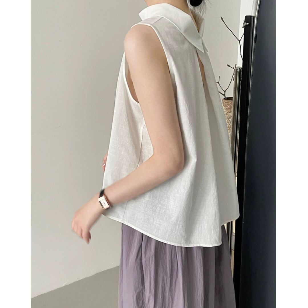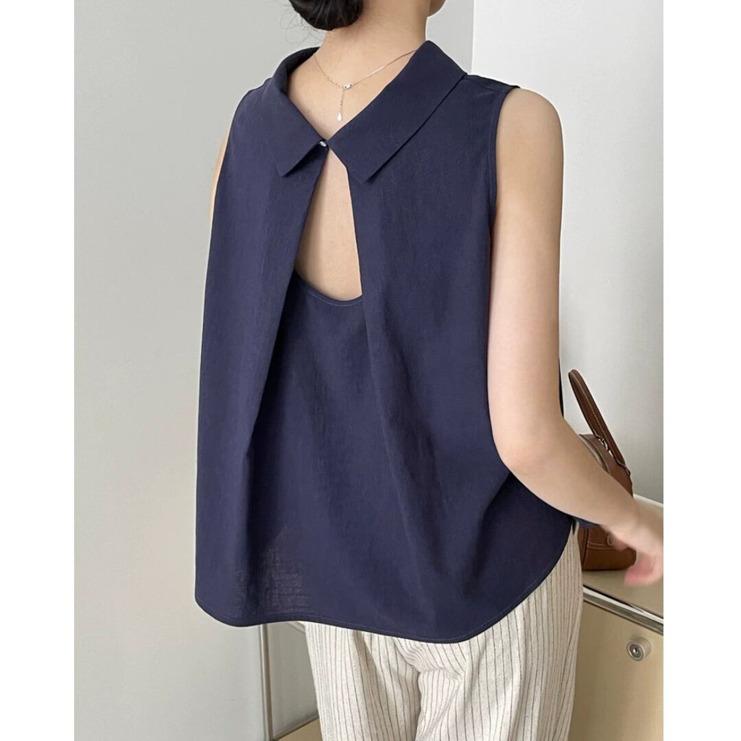 後ろ姿に差がつく、バッククロスデザインが印象的なノースリーブブラウス。