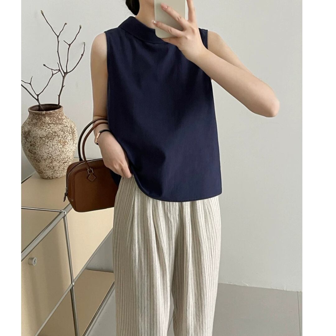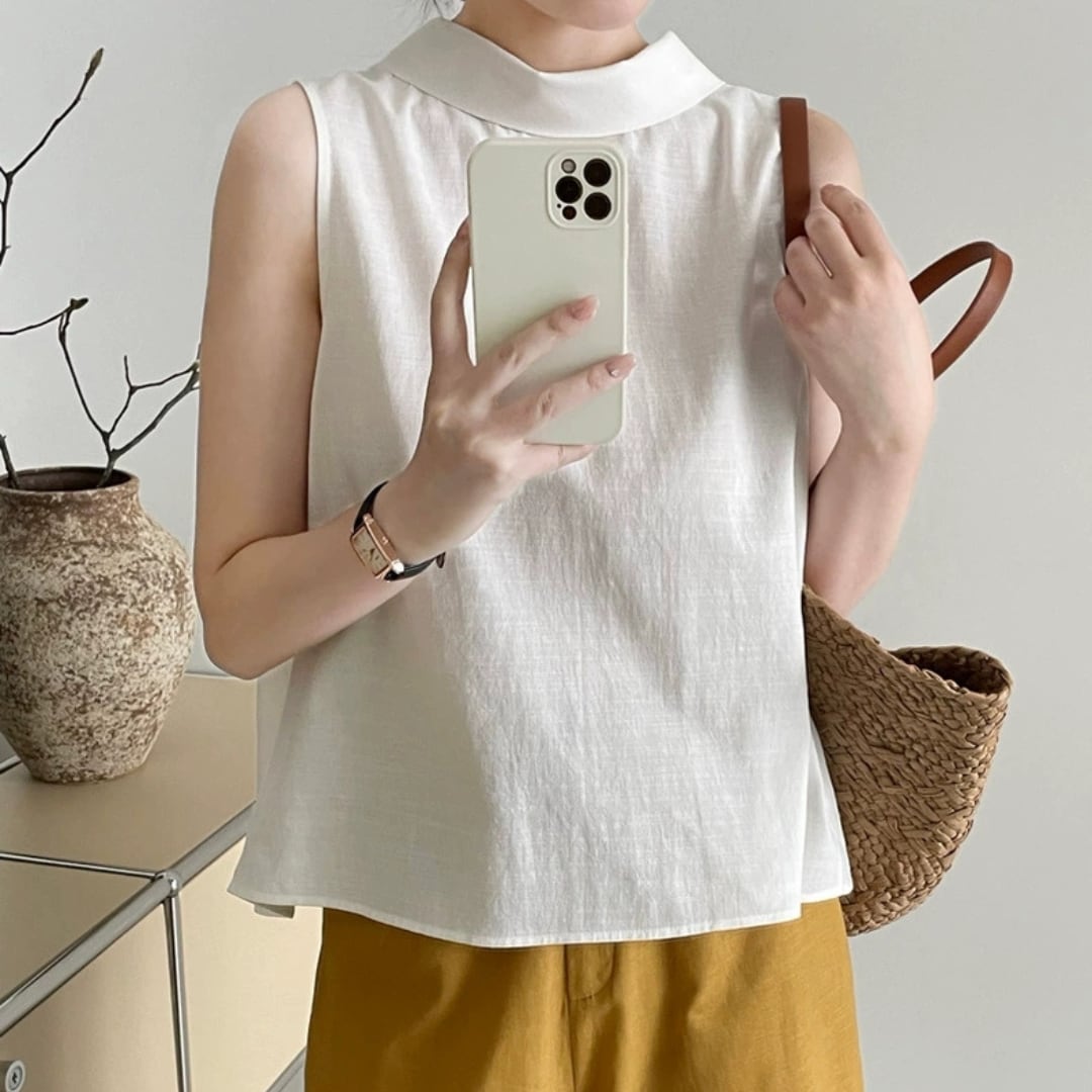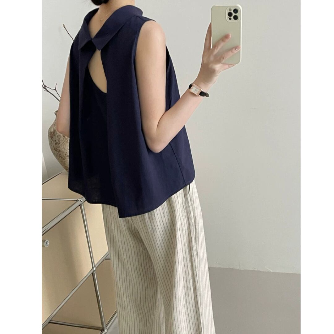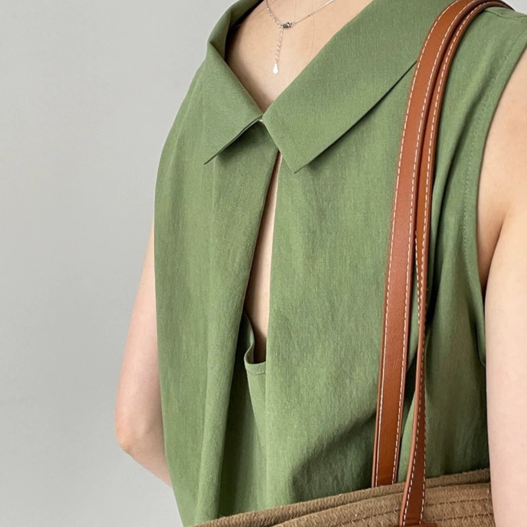 後ろ姿に差がつく、バッククロスデザインが印象的なノースリーブブラウス。