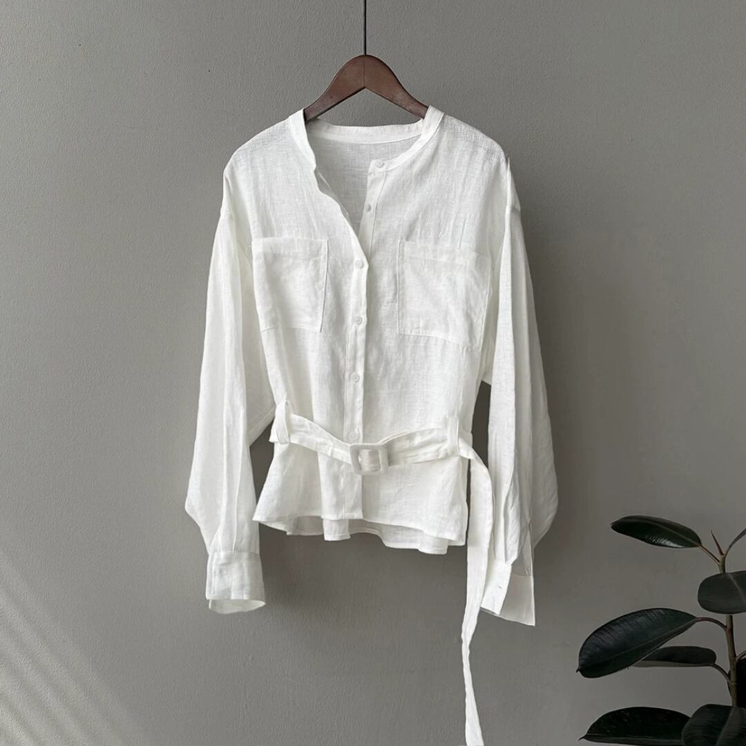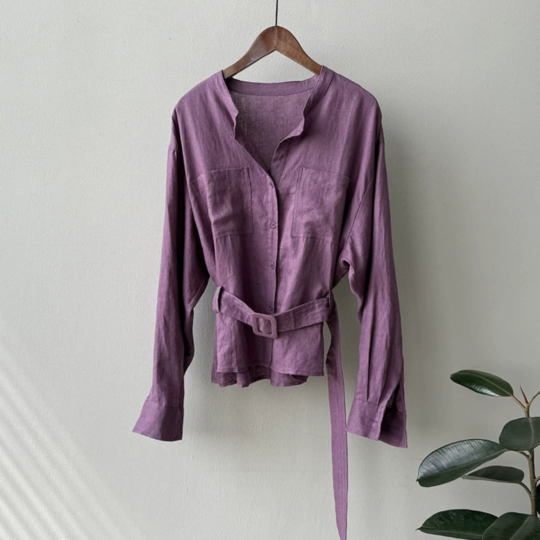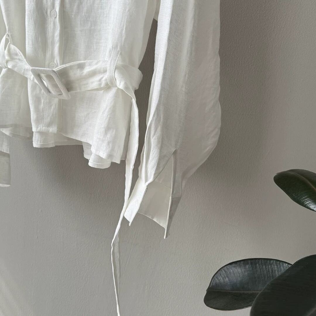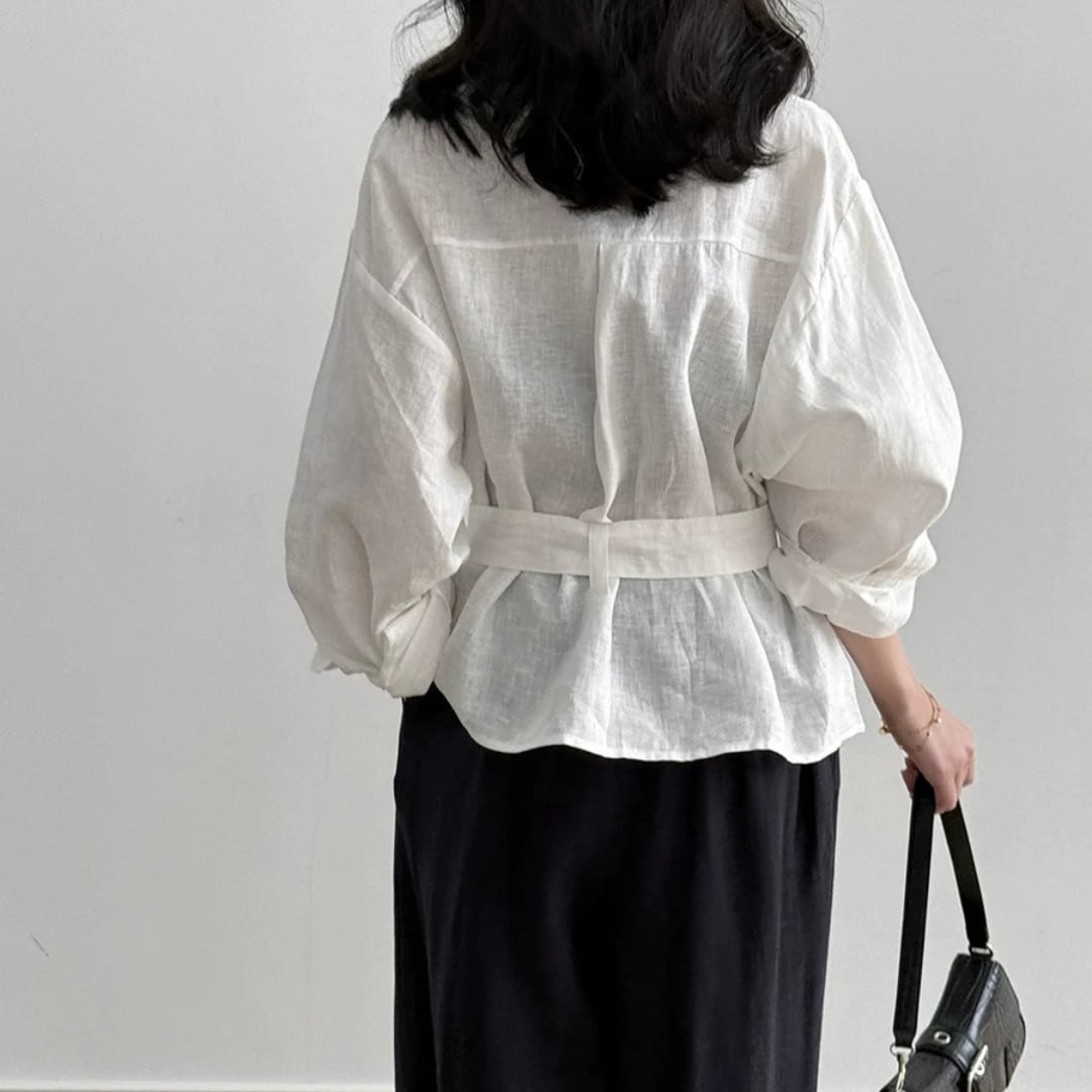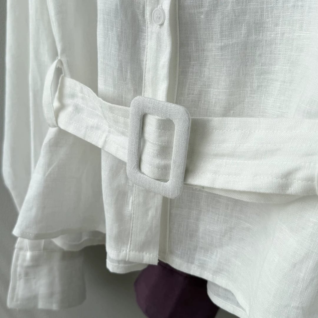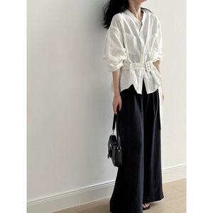 共布のワイドベルトがウエストマークを叶え、メリハリのある美シルエットを演出します。