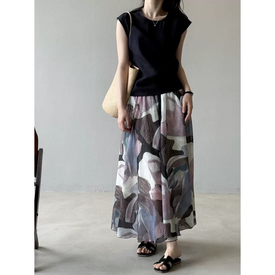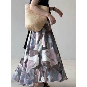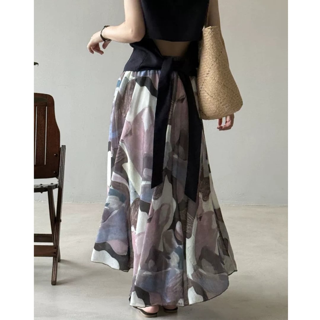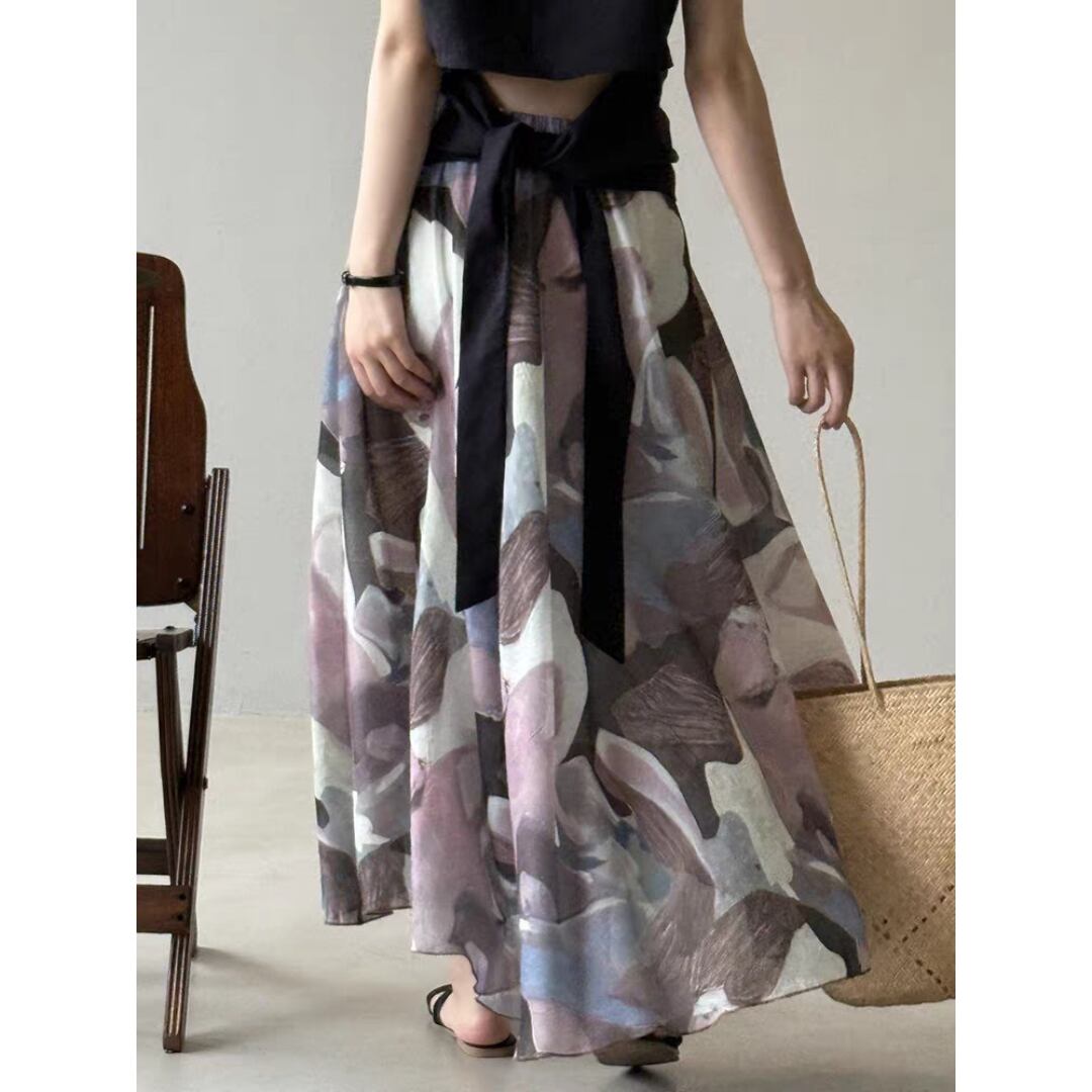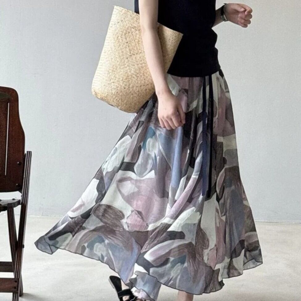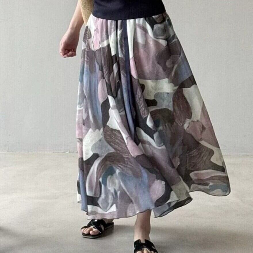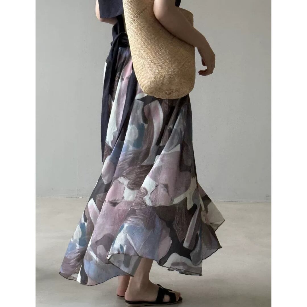 軽やかなシフォン素材に、水彩画のようなアートフラワープリントが広がるマキシ丈スカート。