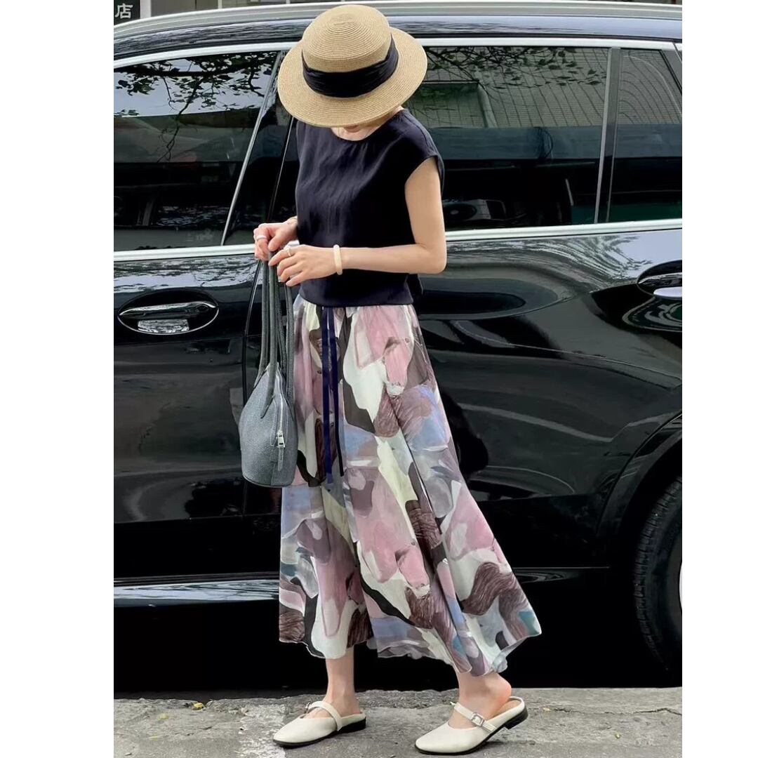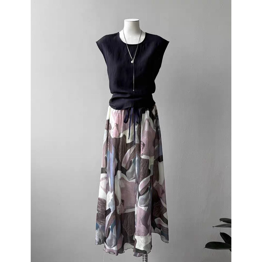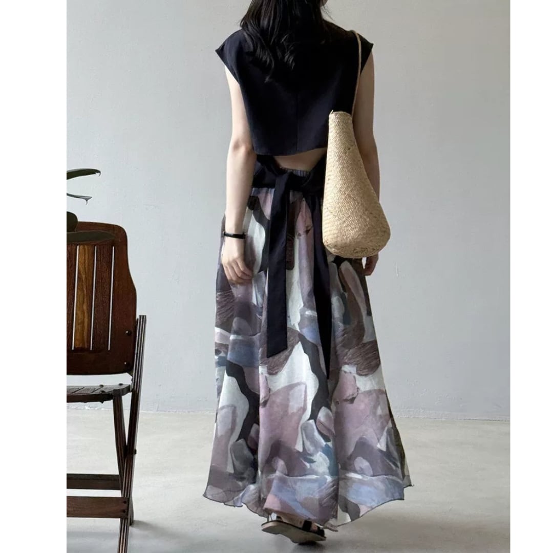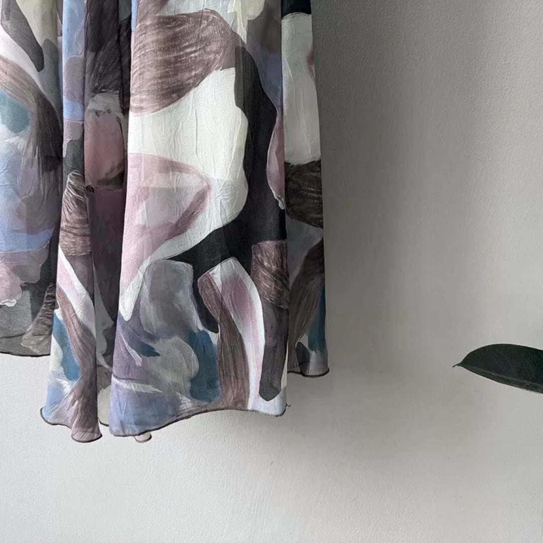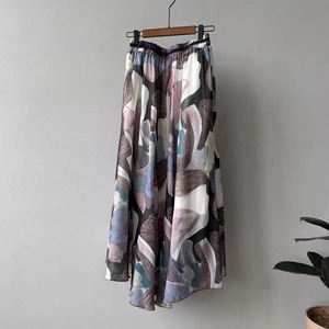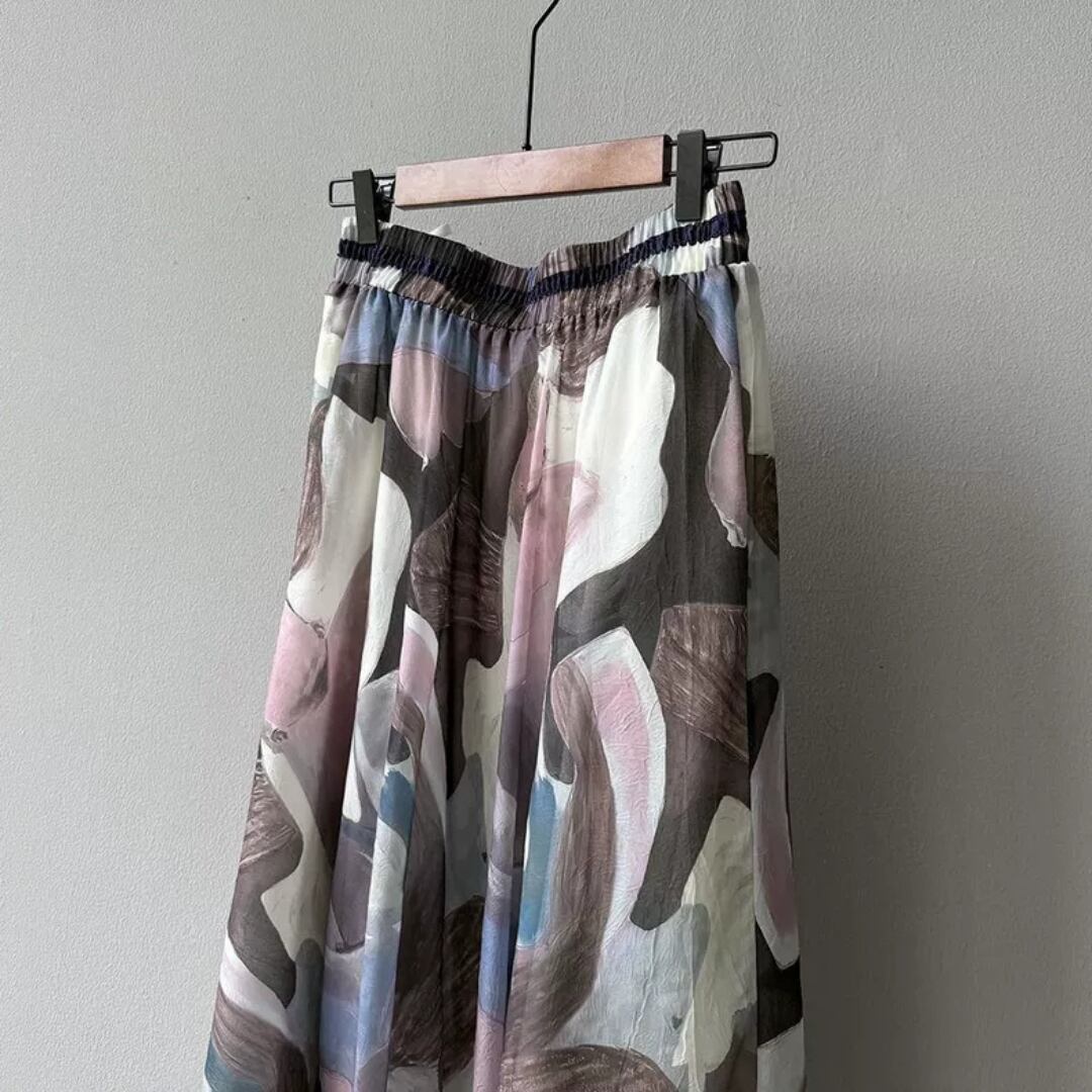 軽やかなシフォン素材に、水彩画のようなアートフラワープリントが広がるマキシ丈スカート。