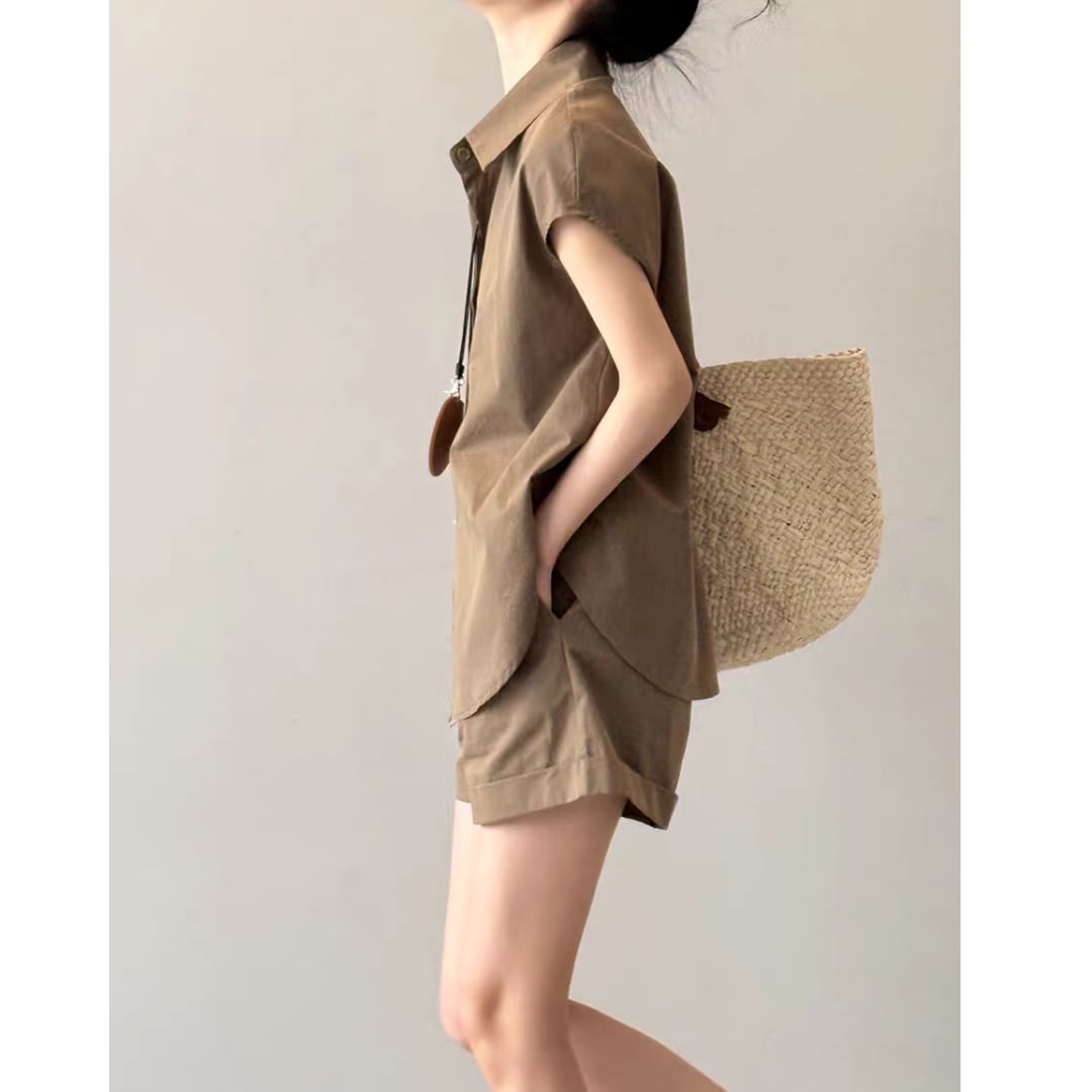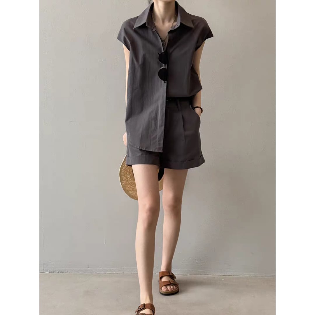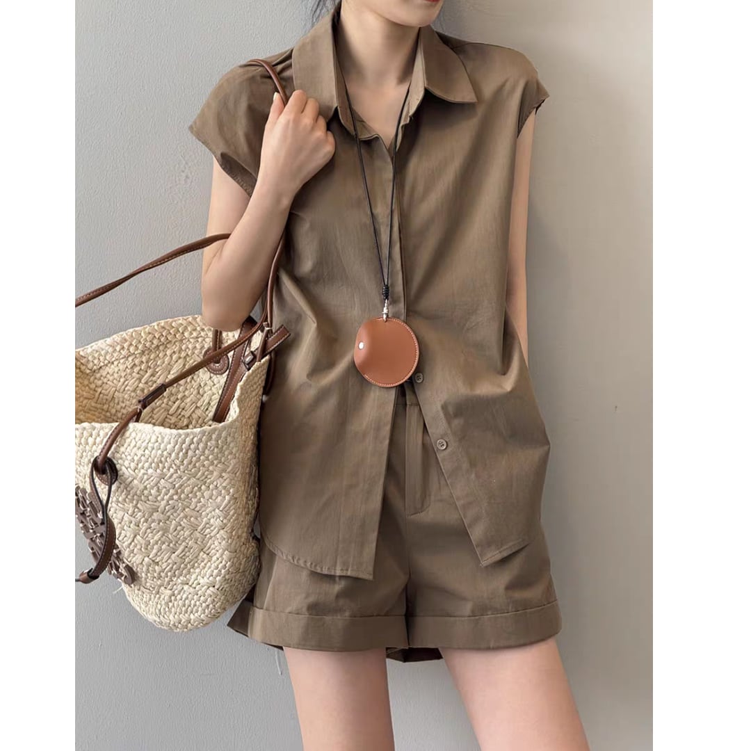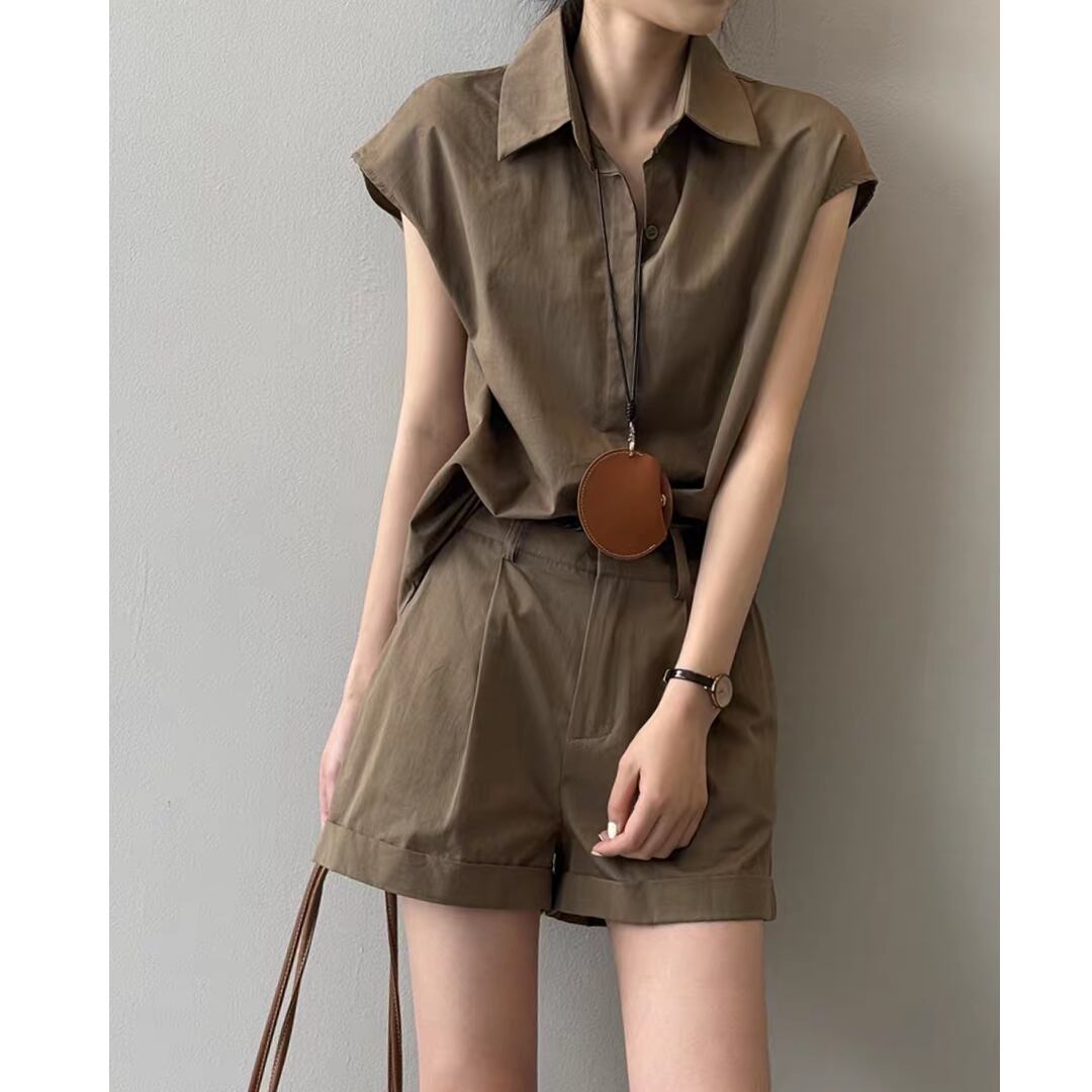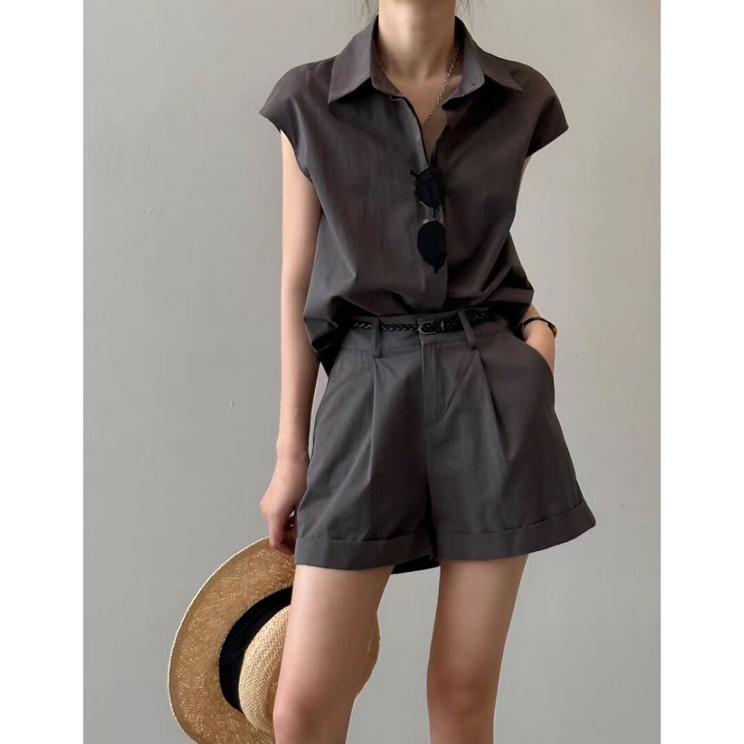 ショートパンツはタック入りで腰まわりにゆとりを持たせつつ、程よい丈感と折り返しヘムで脚長効果も◎