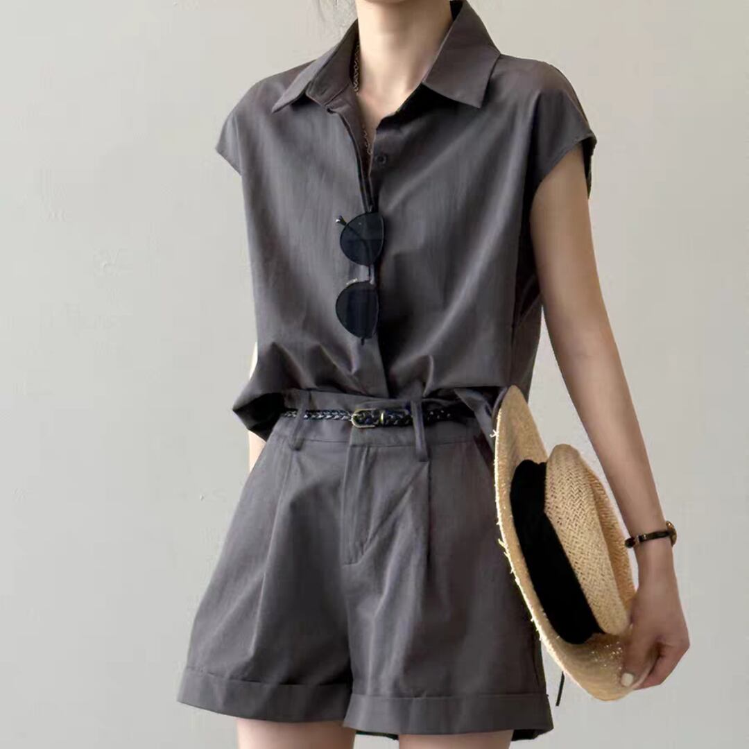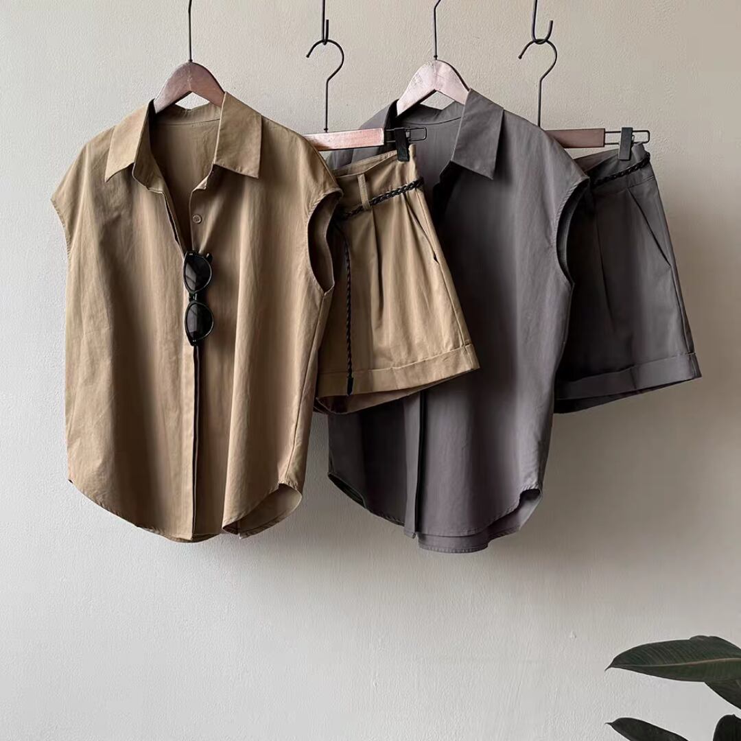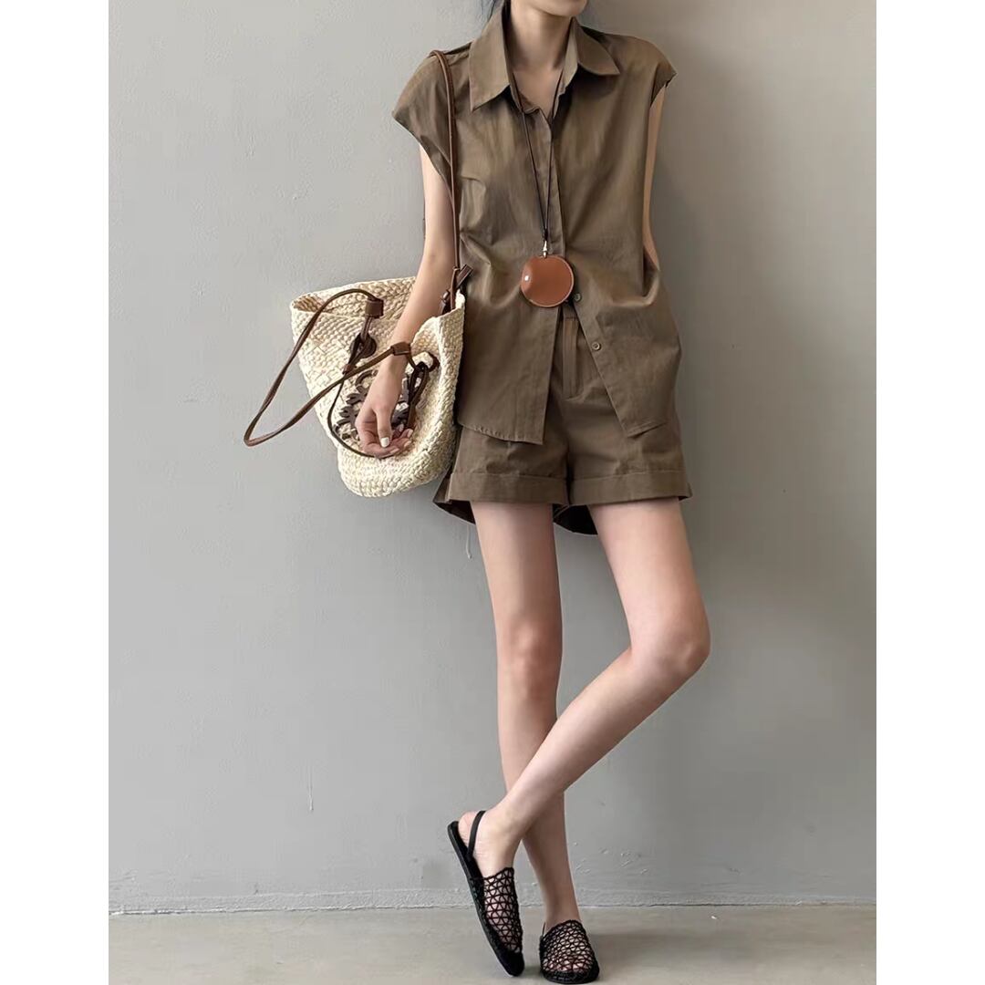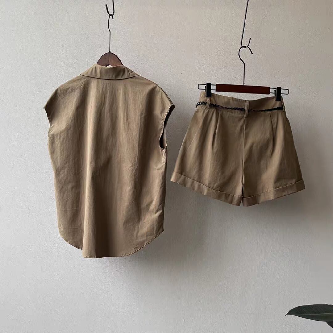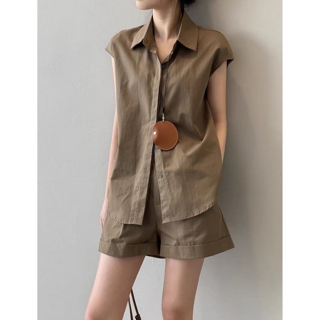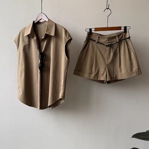 ショートパンツはタック入りで腰まわりにゆとりを持たせつつ、程よい丈感と折り返しヘムで脚長効果も◎