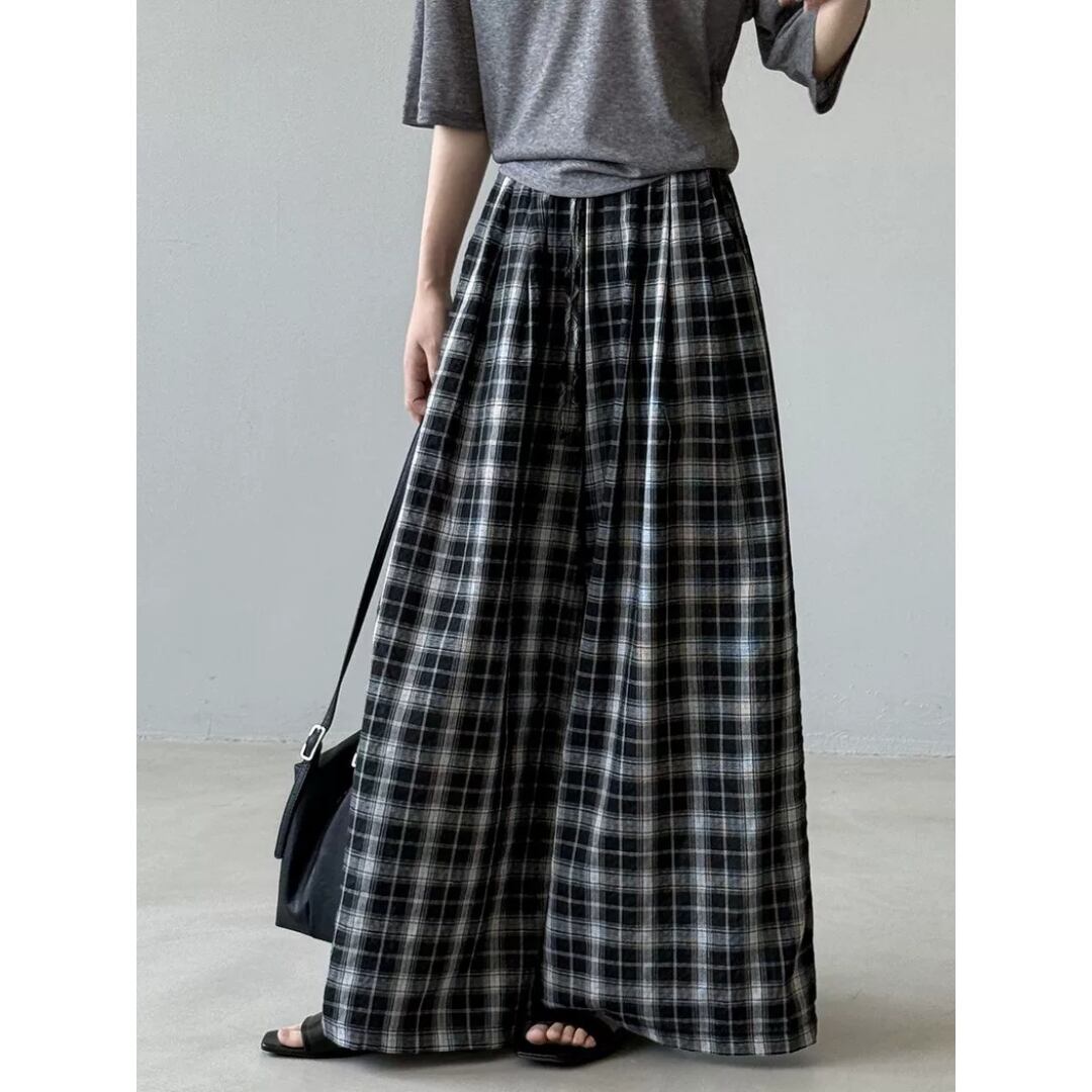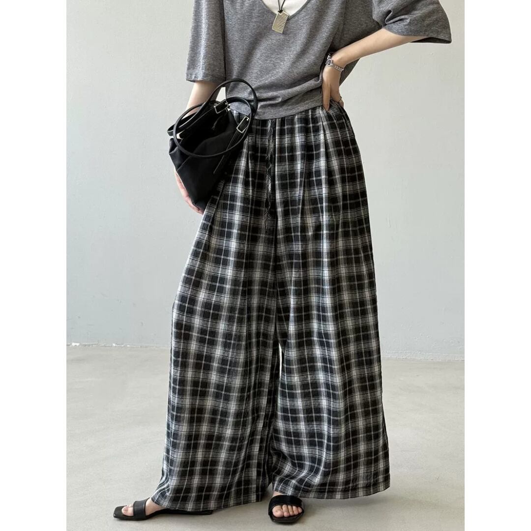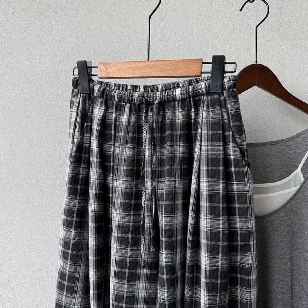 ゆったりとしたシルエットが魅力のチェック柄ワイドパンツ。