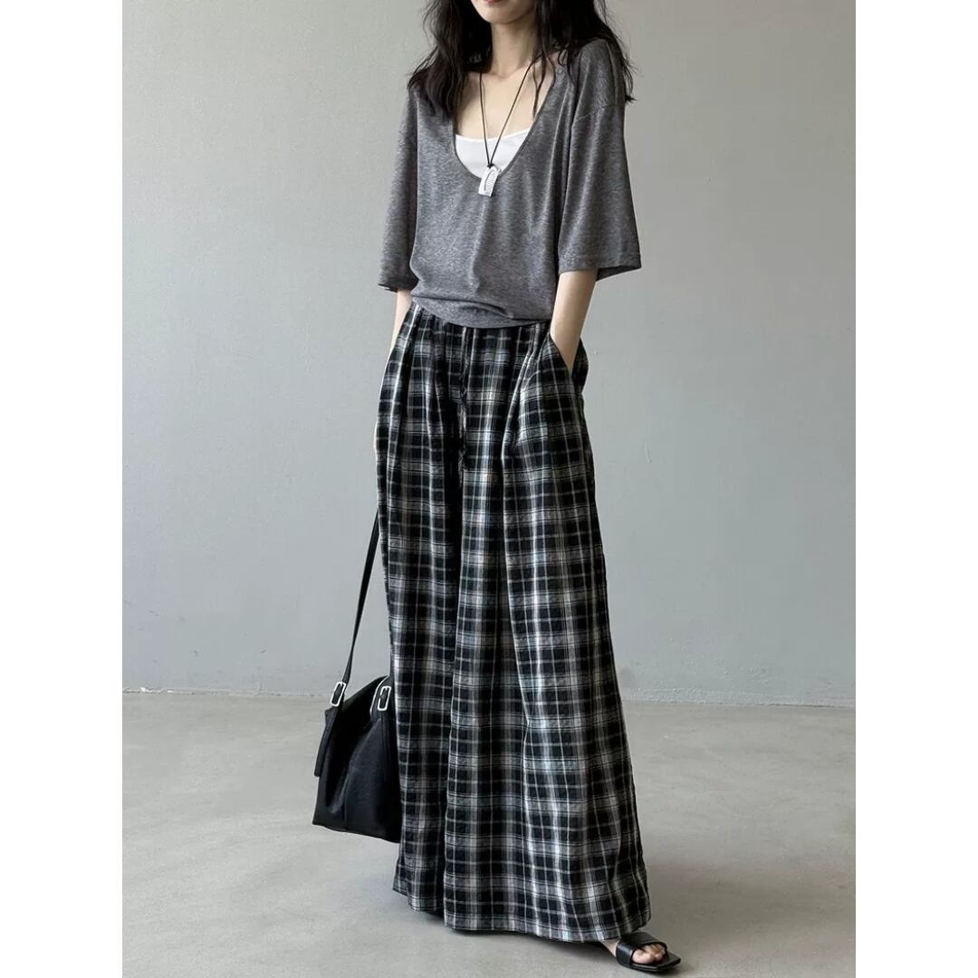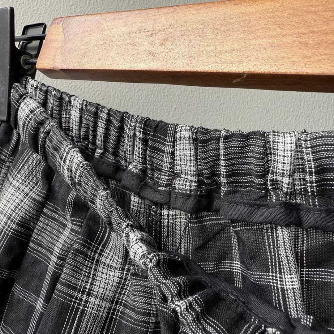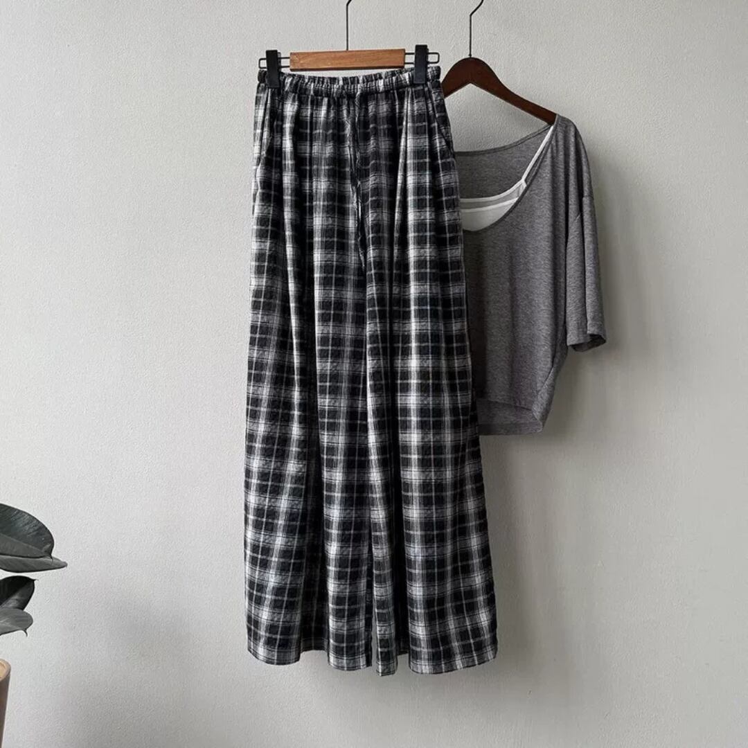 ゆったりとしたシルエットが魅力のチェック柄ワイドパンツ。