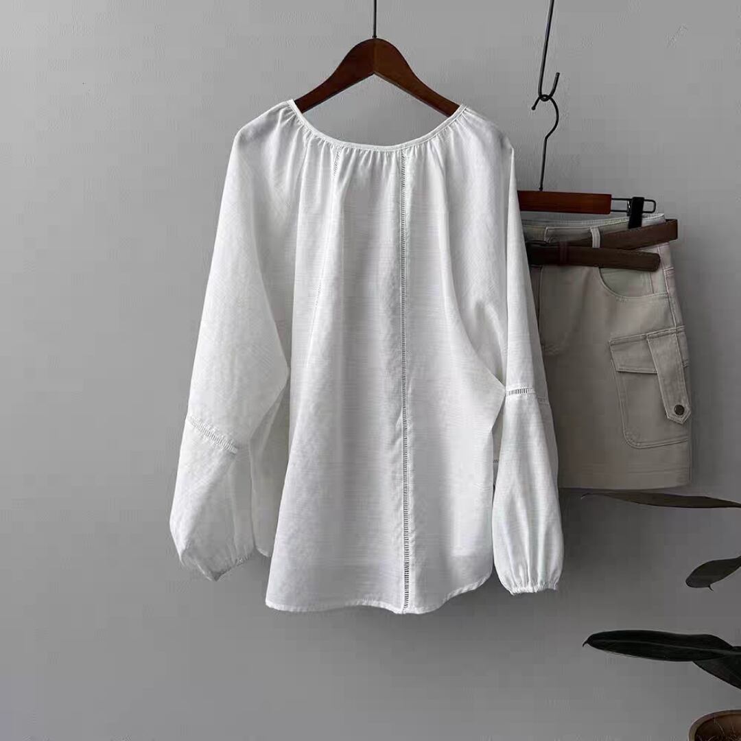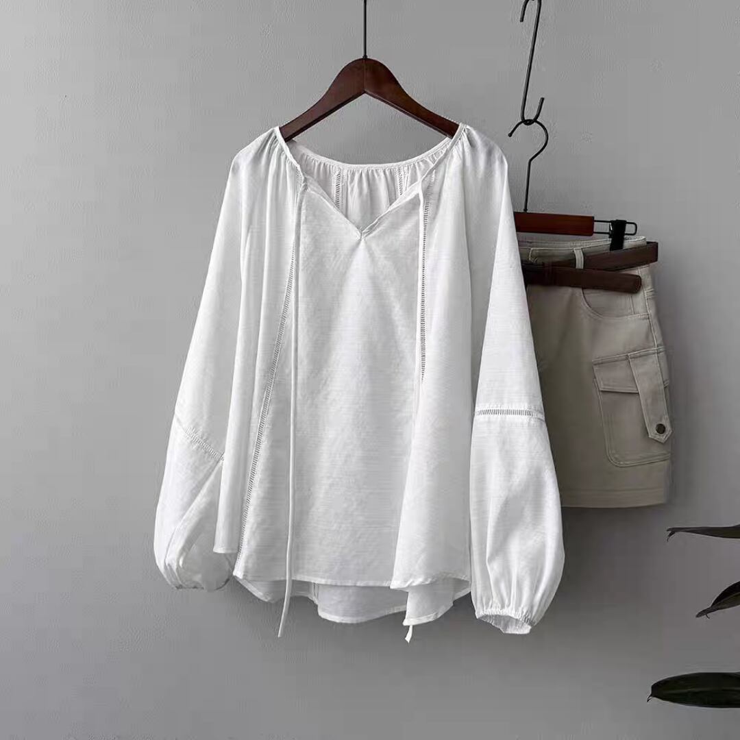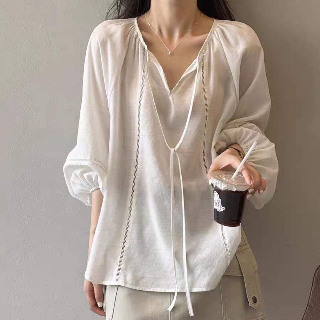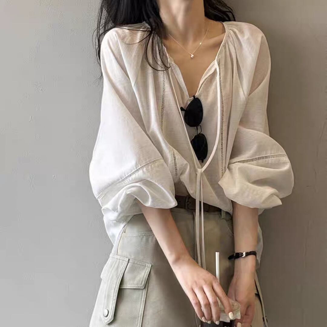 ふんわりとしたボリュームスリーブと繊細なレースライントリムが印象的な、リラックス感漂うナチュラルブラウス。