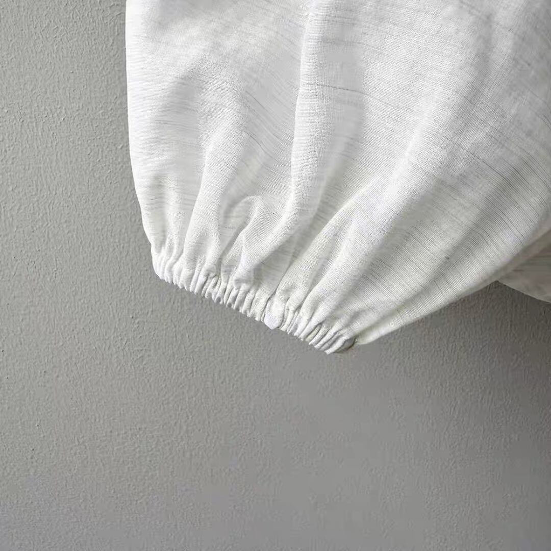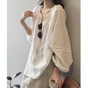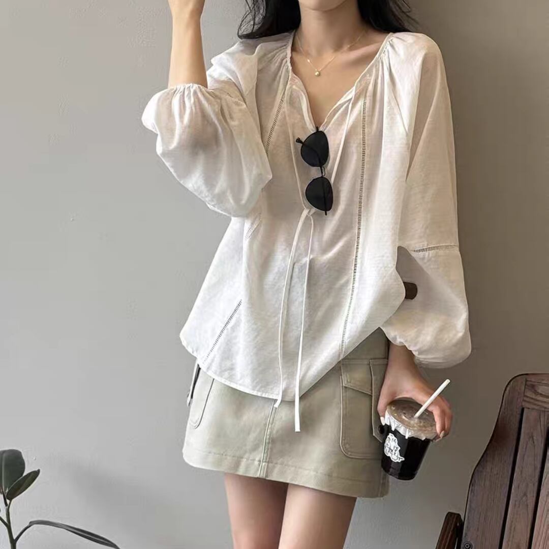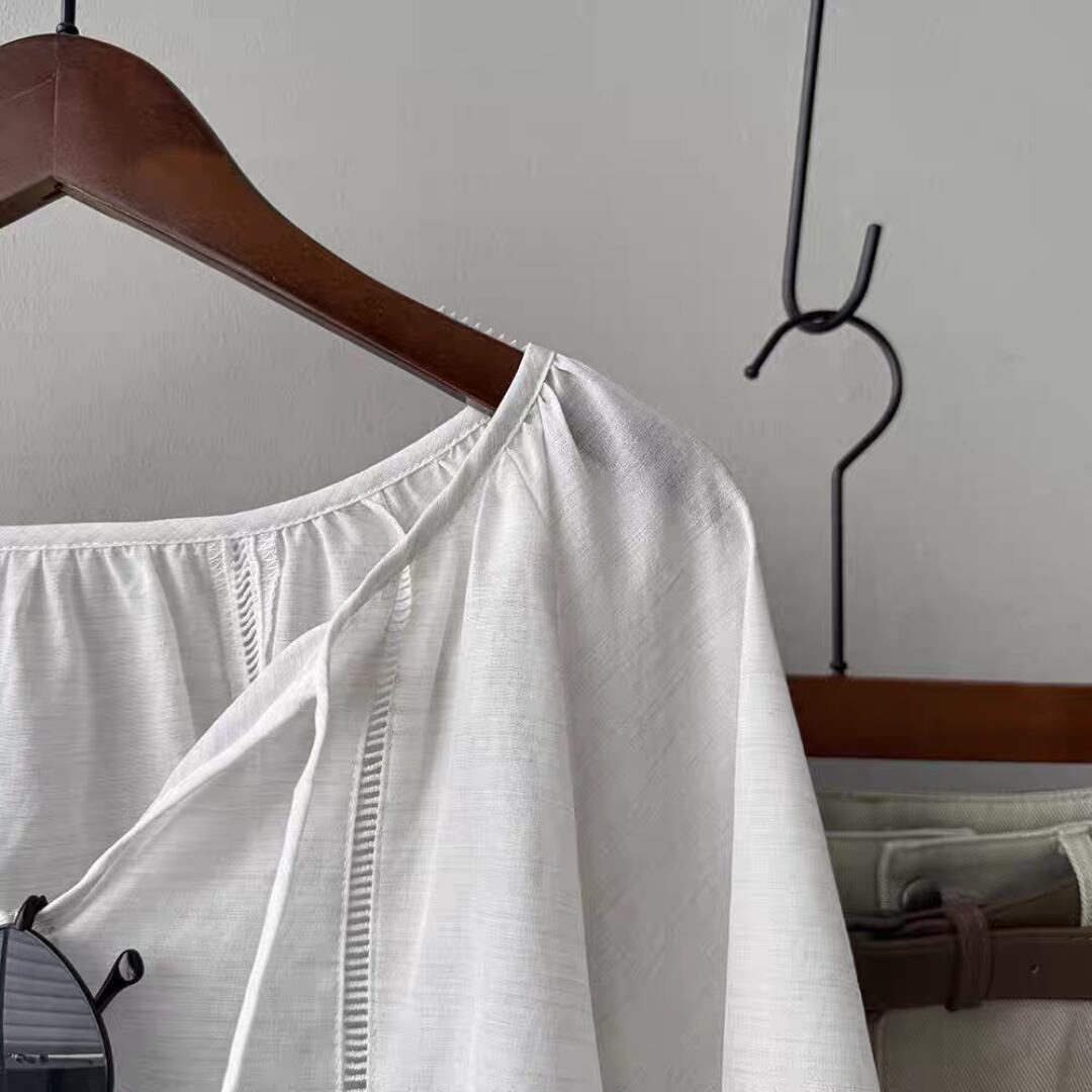 ふんわりとしたボリュームスリーブと繊細なレースライントリムが印象的な、リラックス感漂うナチュラルブラウス。