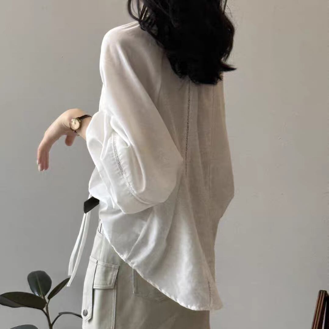 首元のスリットとリボンデザインが女性らしさを演出し、前後どちらから見ても抜け感のあるスタイルに。