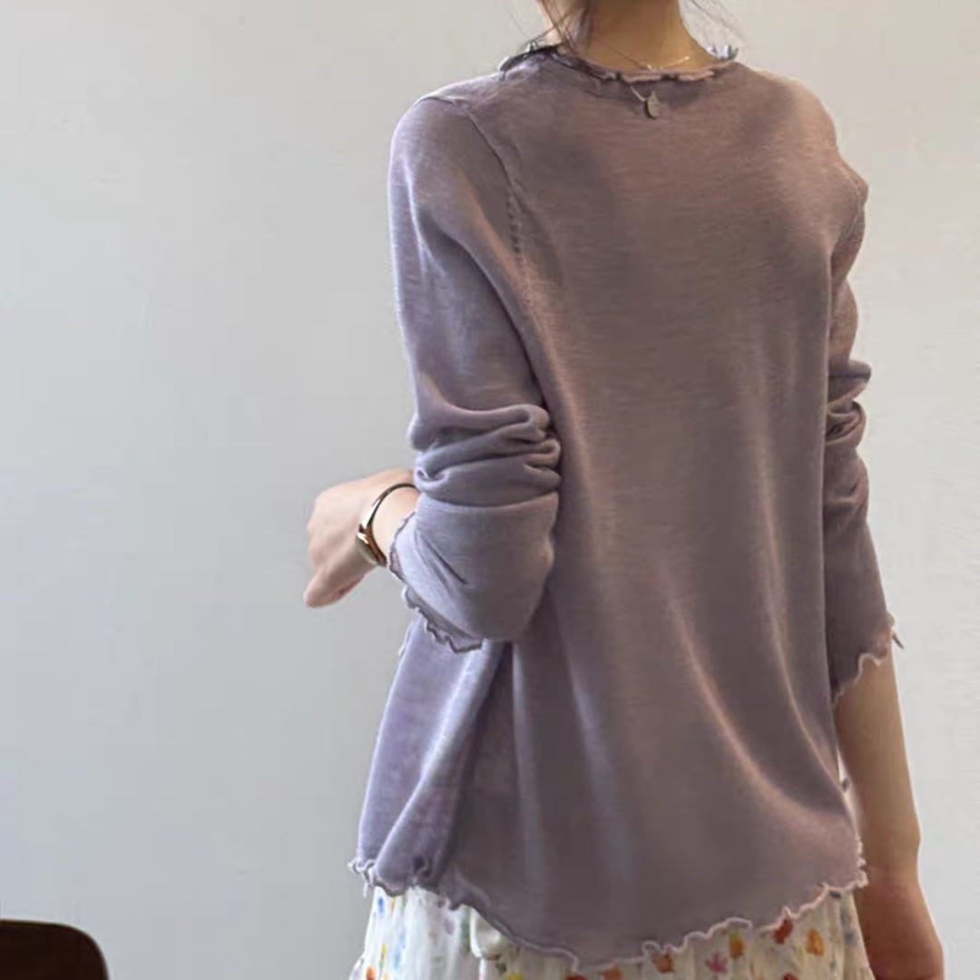 襟ぐり・袖口・裾に施されたメロウフリルが、