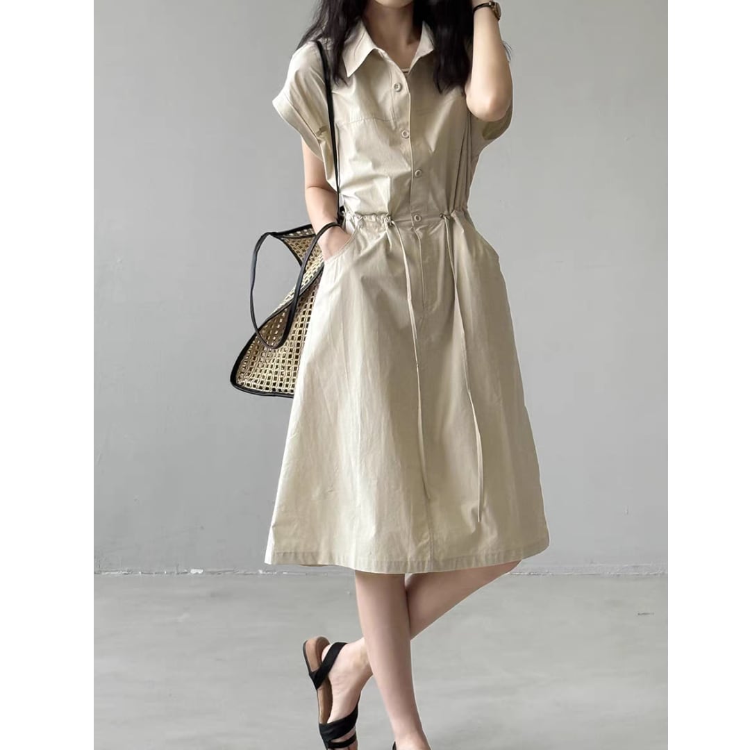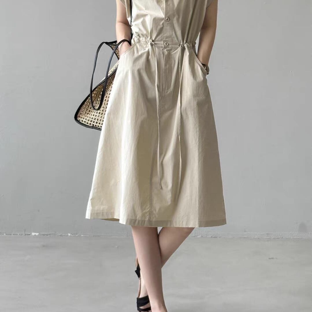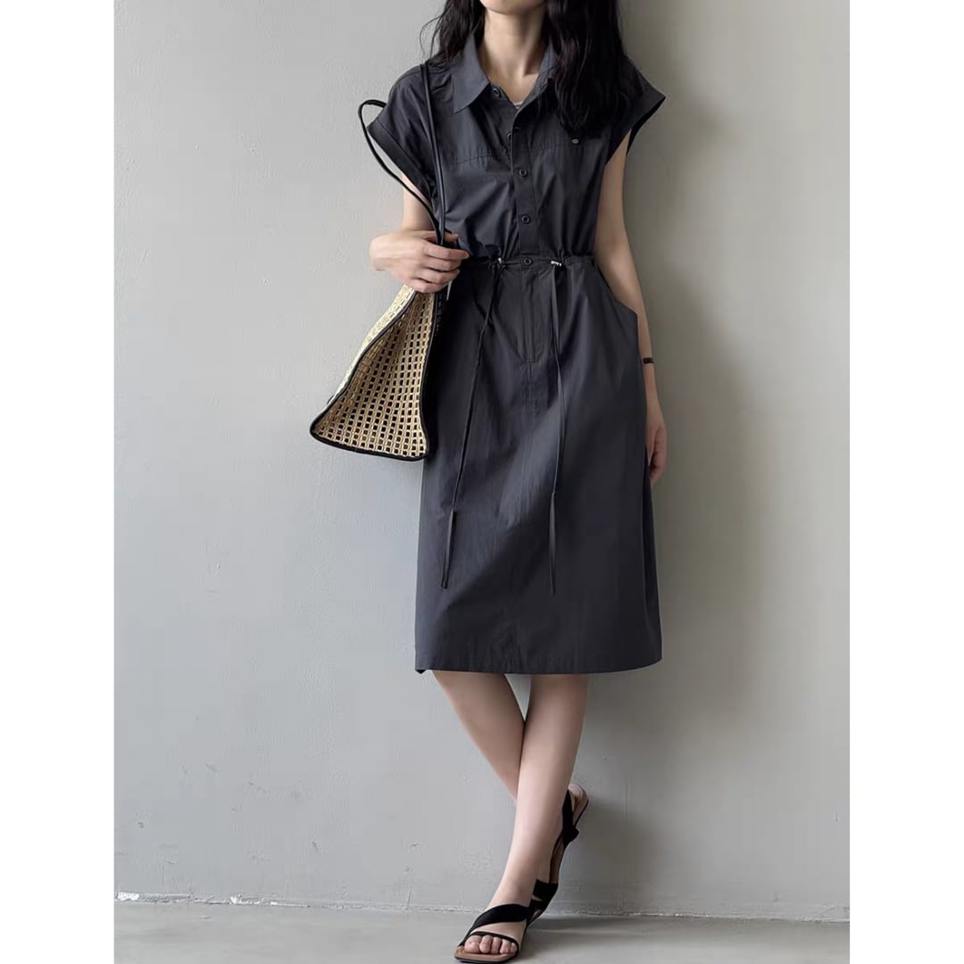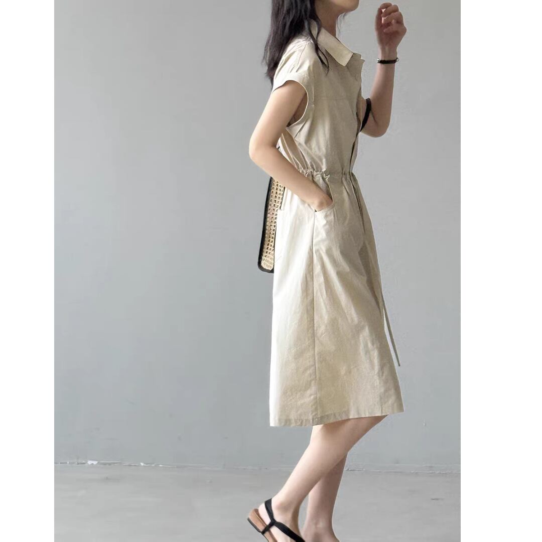 すっきりとしたシャツカラーと、ウエストギャザーで女性らしいシルエットを叶えるコットンワンピース。