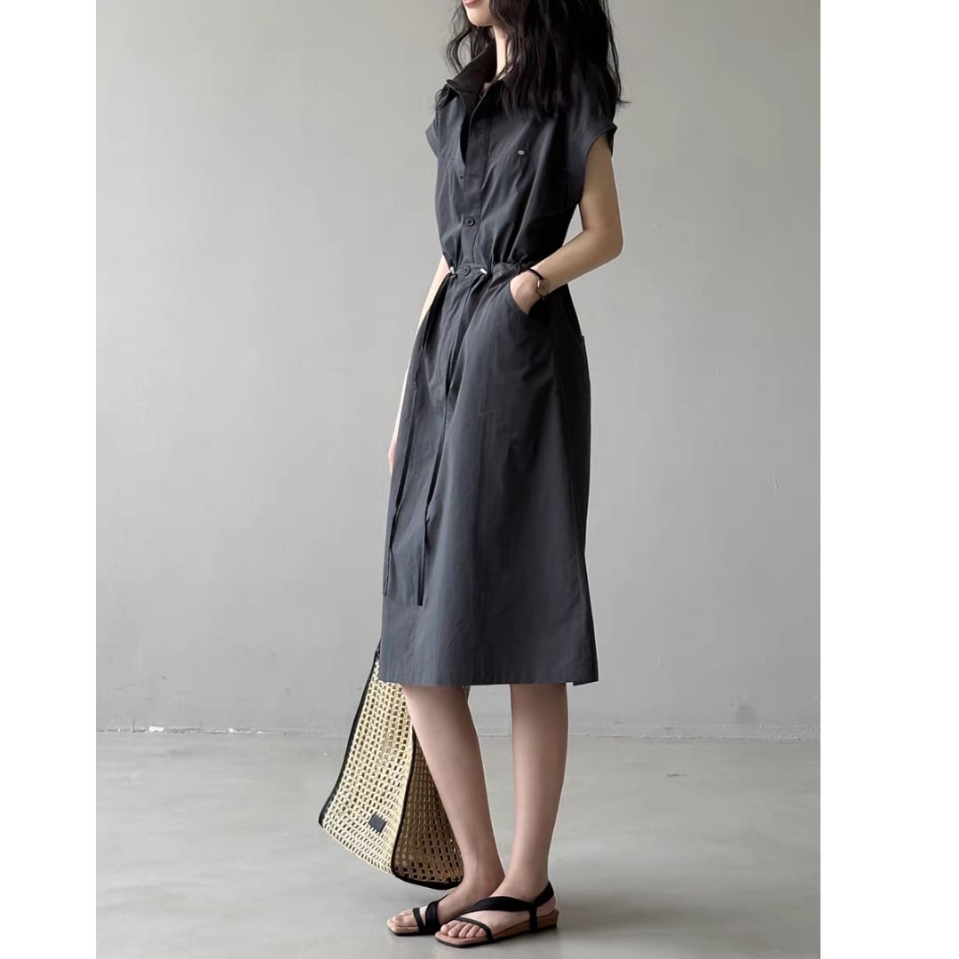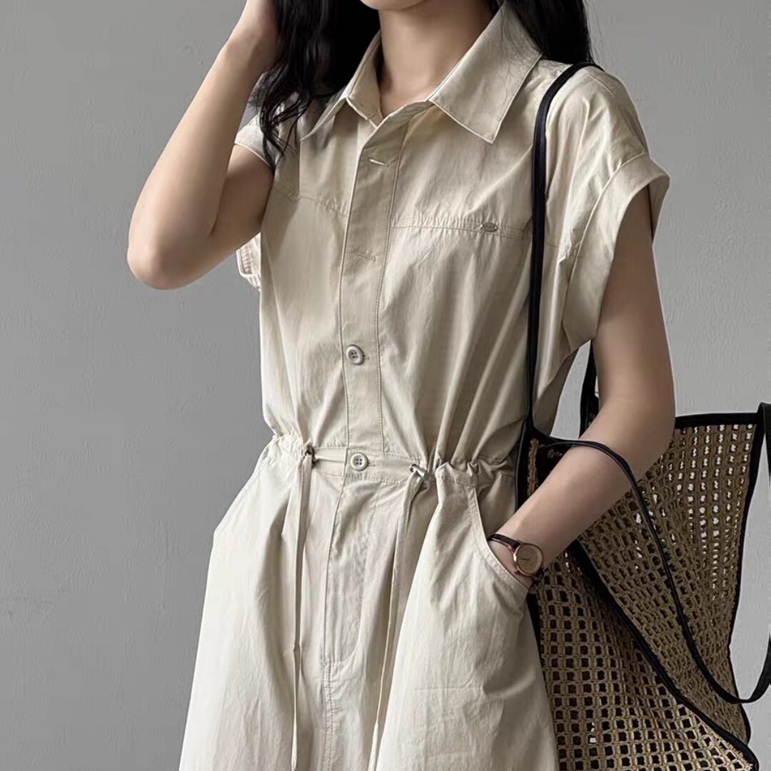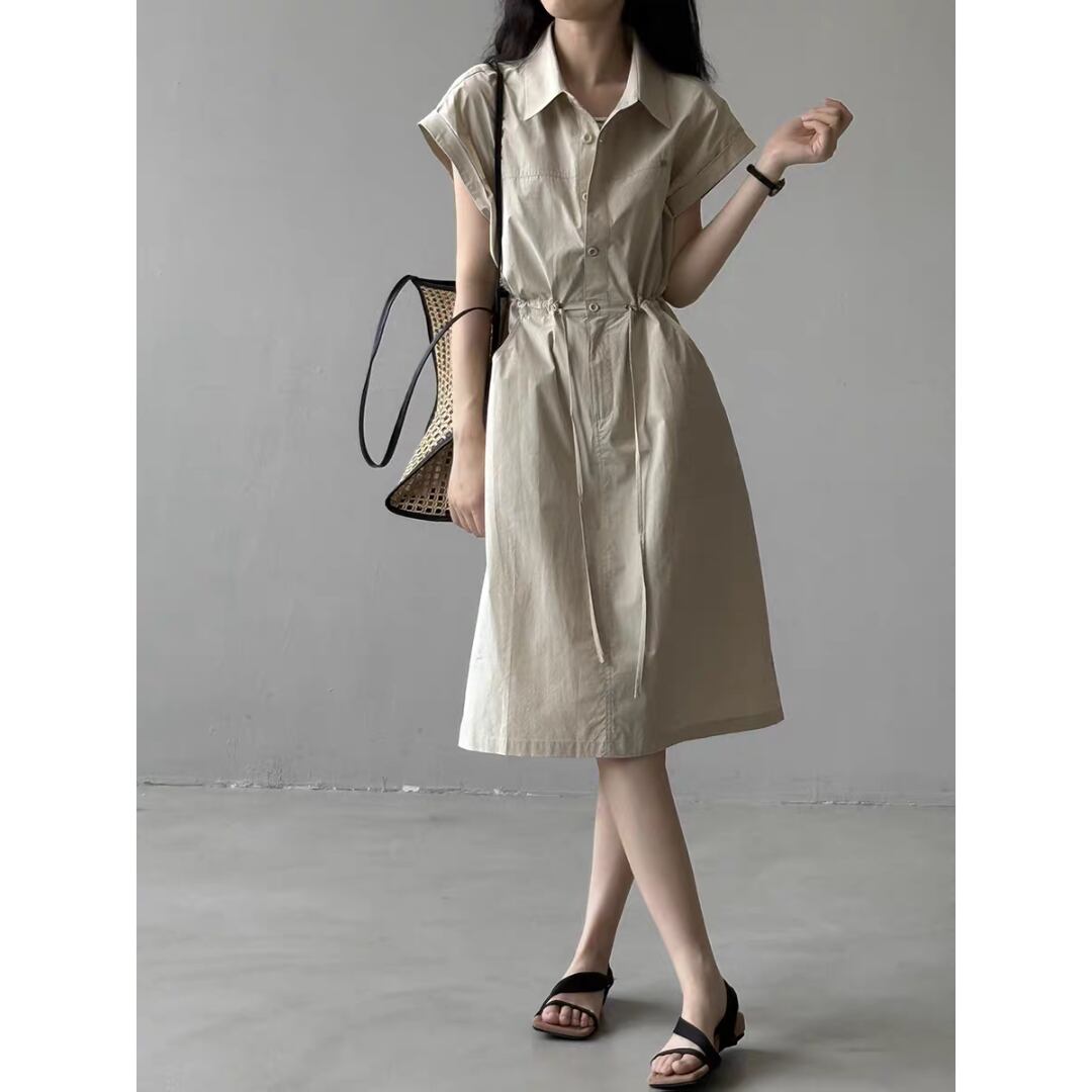 すっきりとしたシャツカラーと、ウエストギャザーで女性らしいシルエットを叶えるコットンワンピース。
