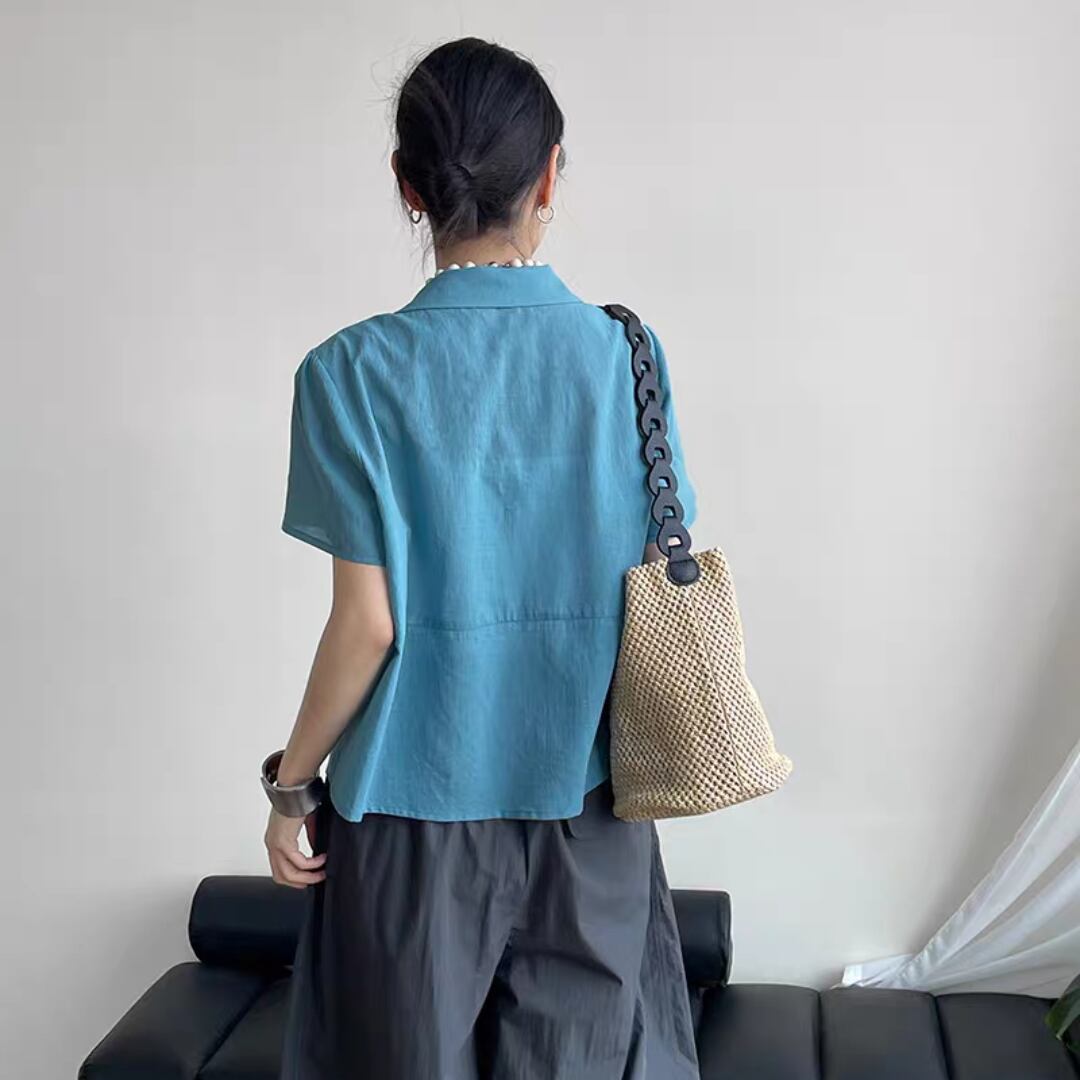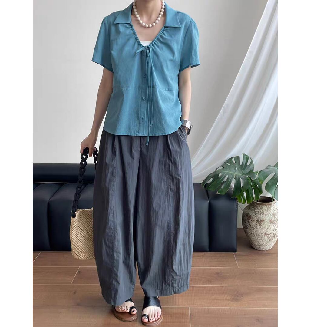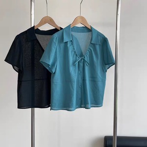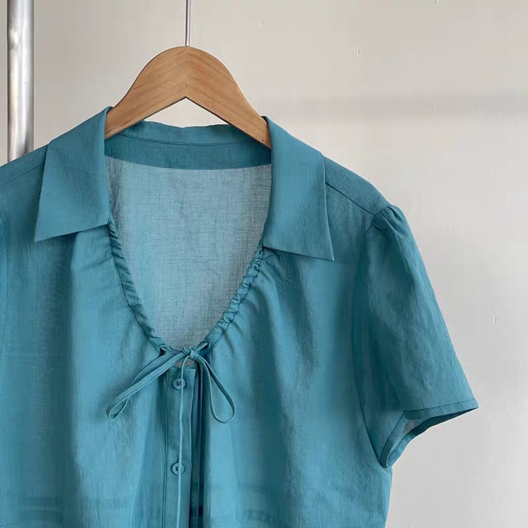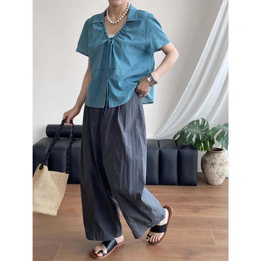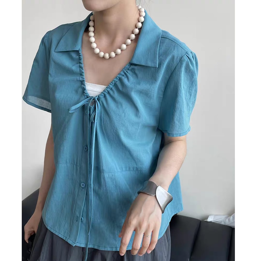フロントに施したギャザーとリボンがフェミニンな印象を添える、涼しげなコットンブラウス。