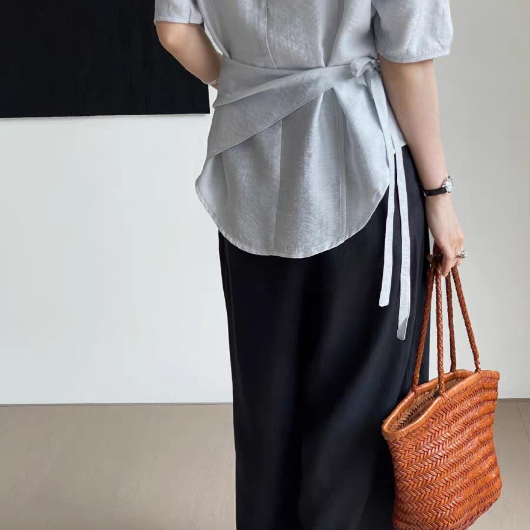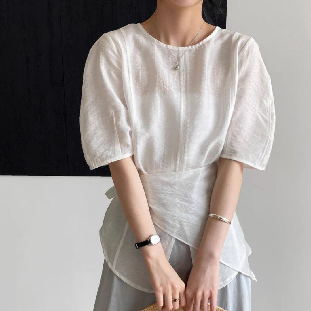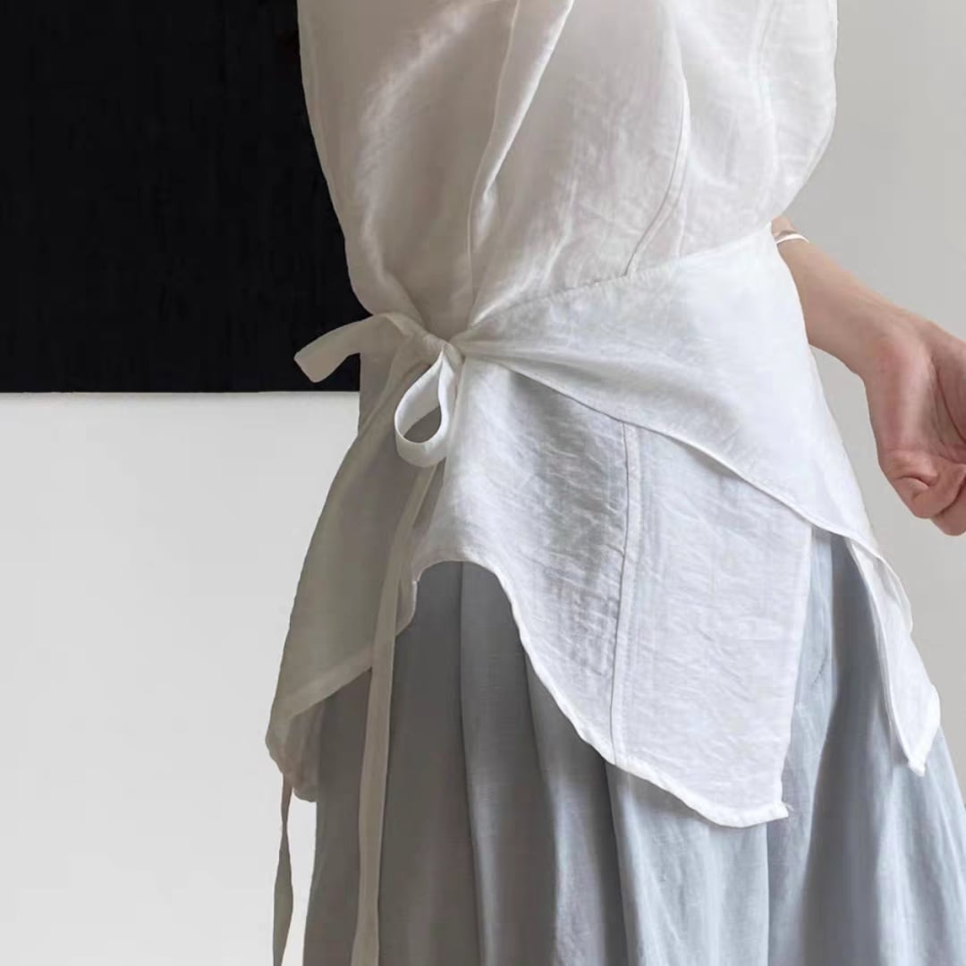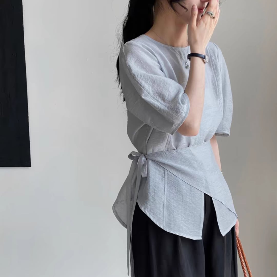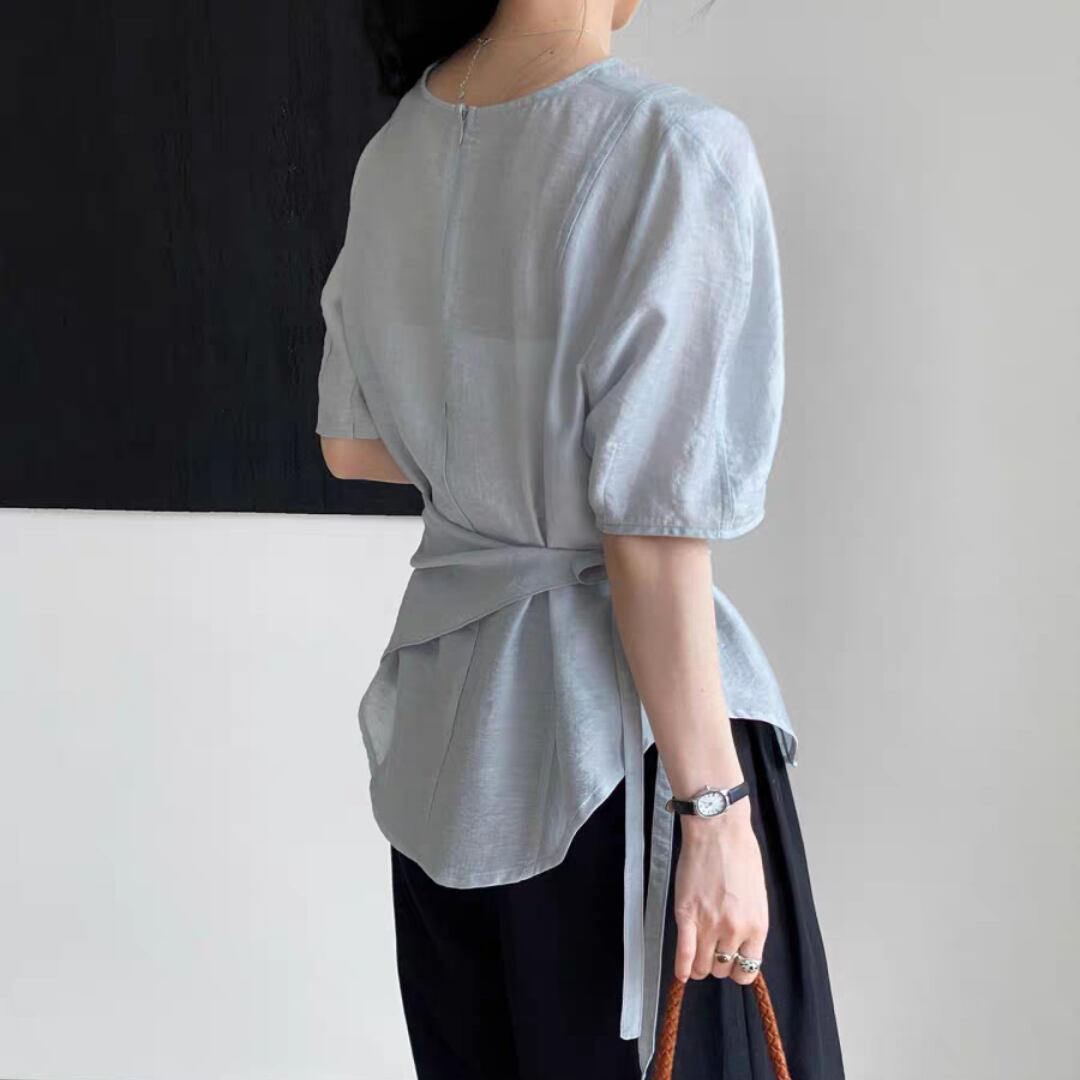 ふんわりとした袖と、ウエストを包み込むラップ風デザインが女性らしいシルエットを演出。サイドで結ぶリボンがさりげないアクセントに。