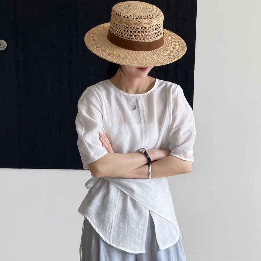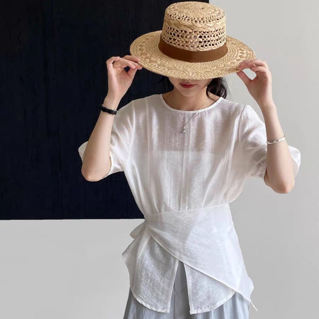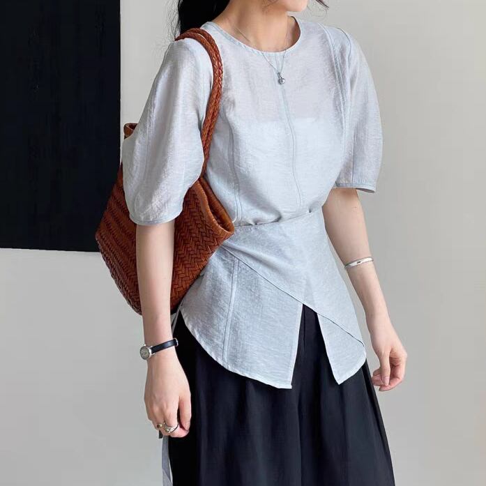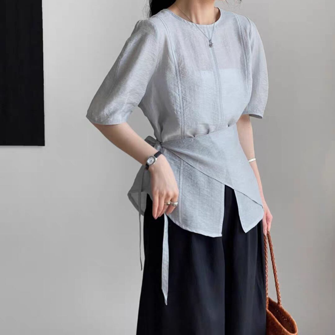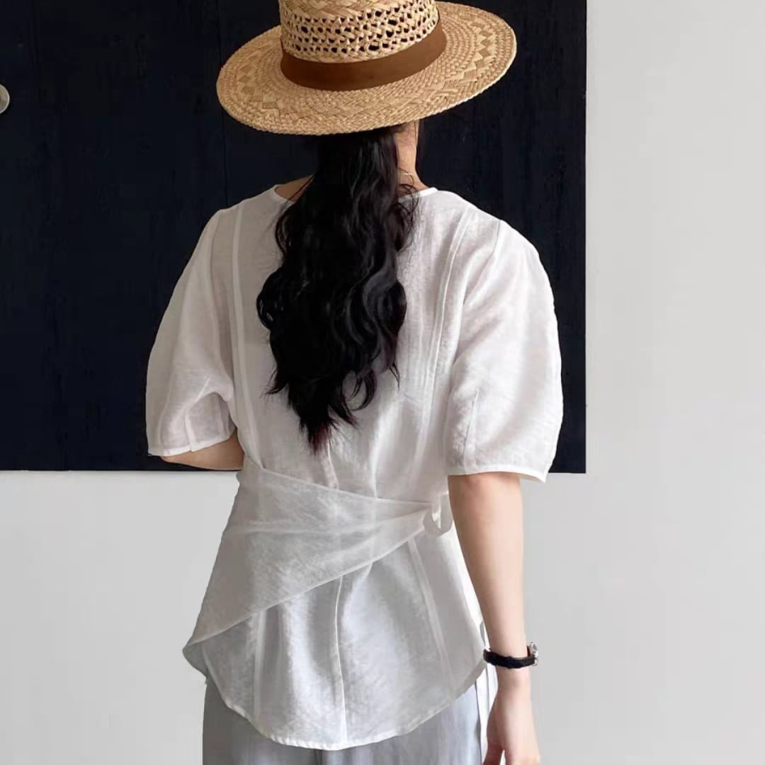 ふんわりとした袖と、ウエストを包み込むラップ風デザインが女性らしいシルエットを演出。サイドで結ぶリボンがさりげないアクセントに。