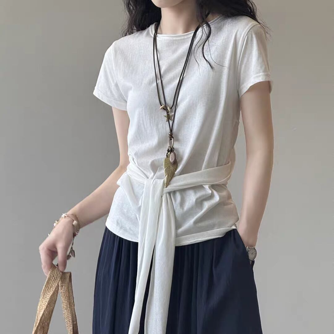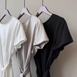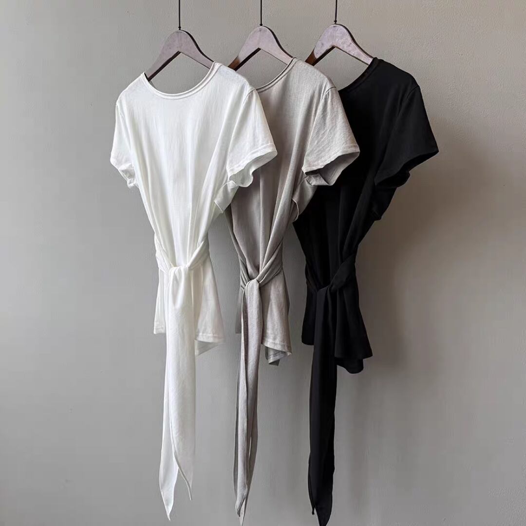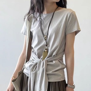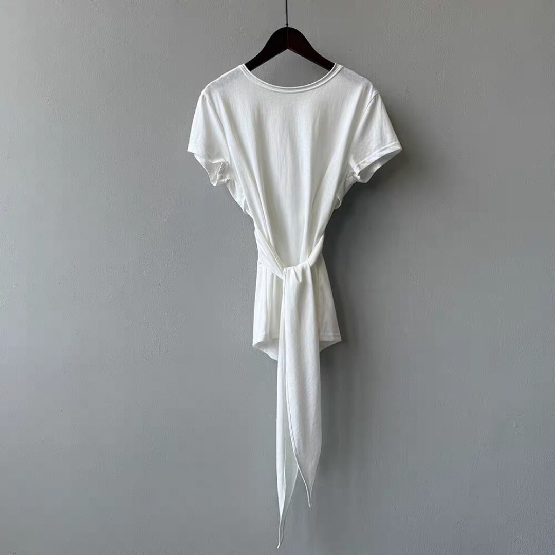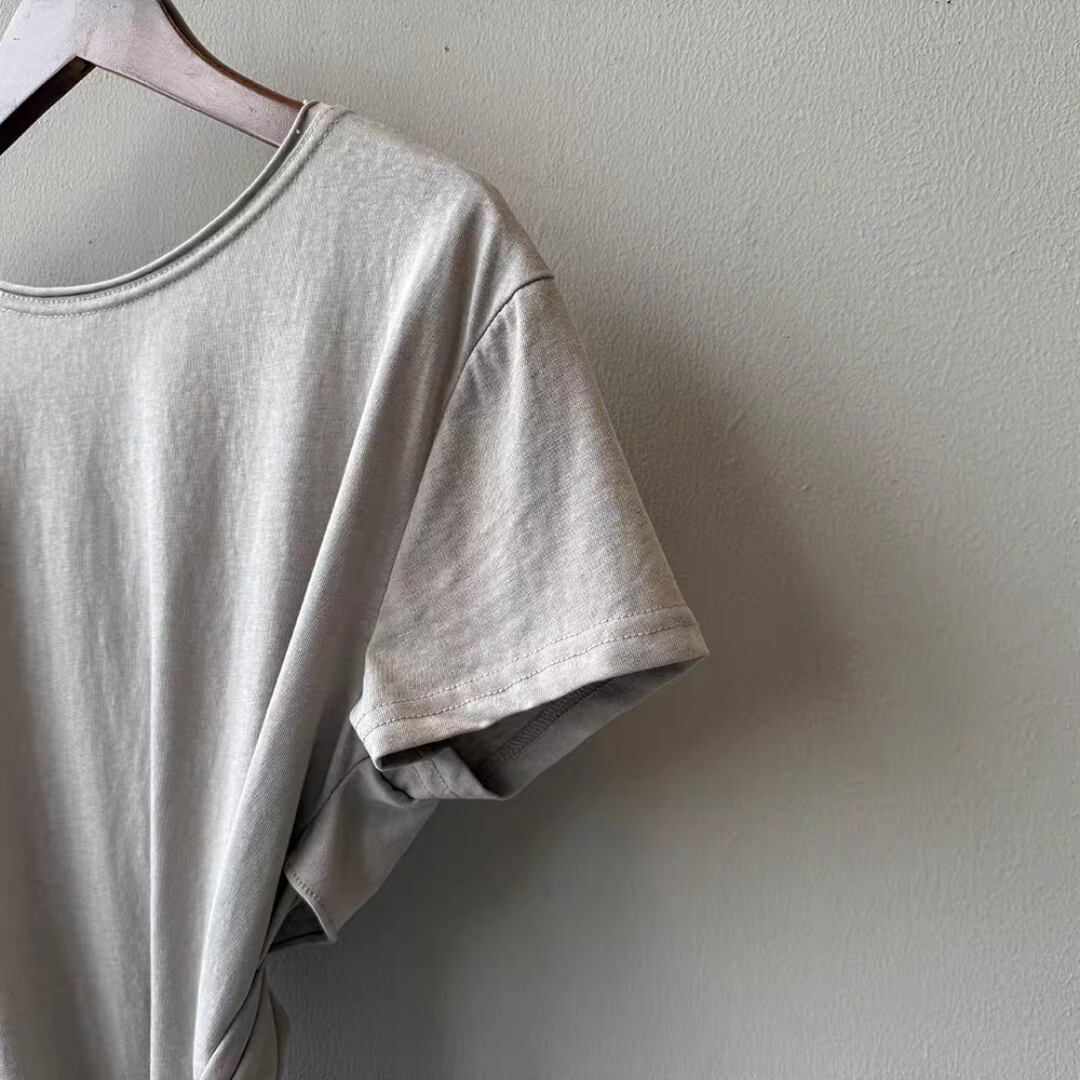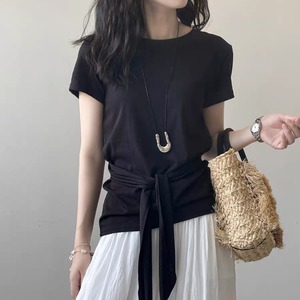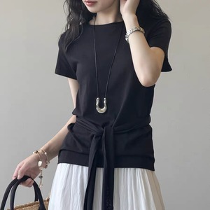 ウエスト部分のクロスデザインが目を引く、シンプルながらもひとクセあるTシャツ。