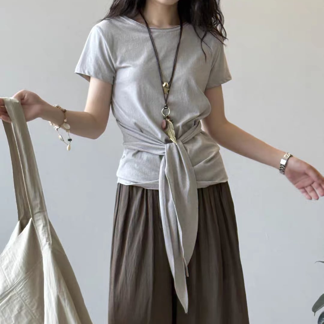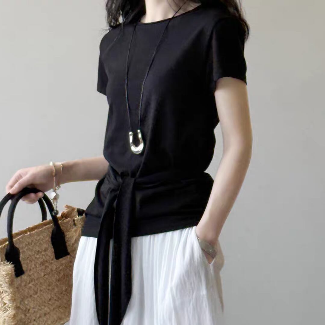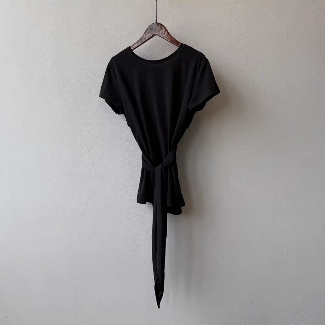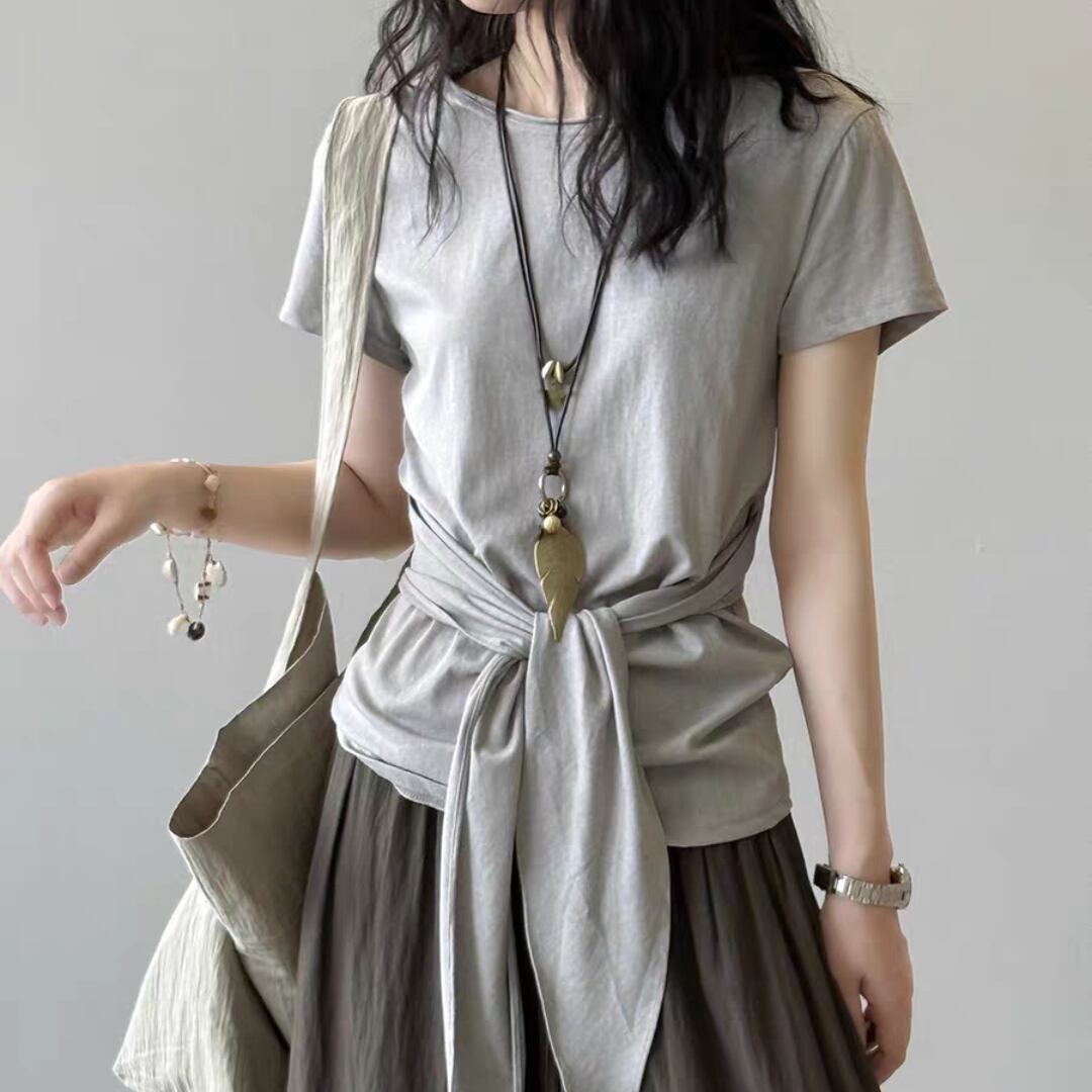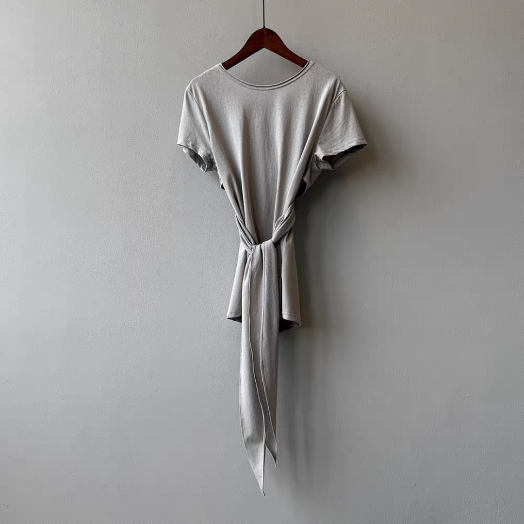 ウエスト部分のクロスデザインが目を引く、シンプルながらもひとクセあるTシャツ。