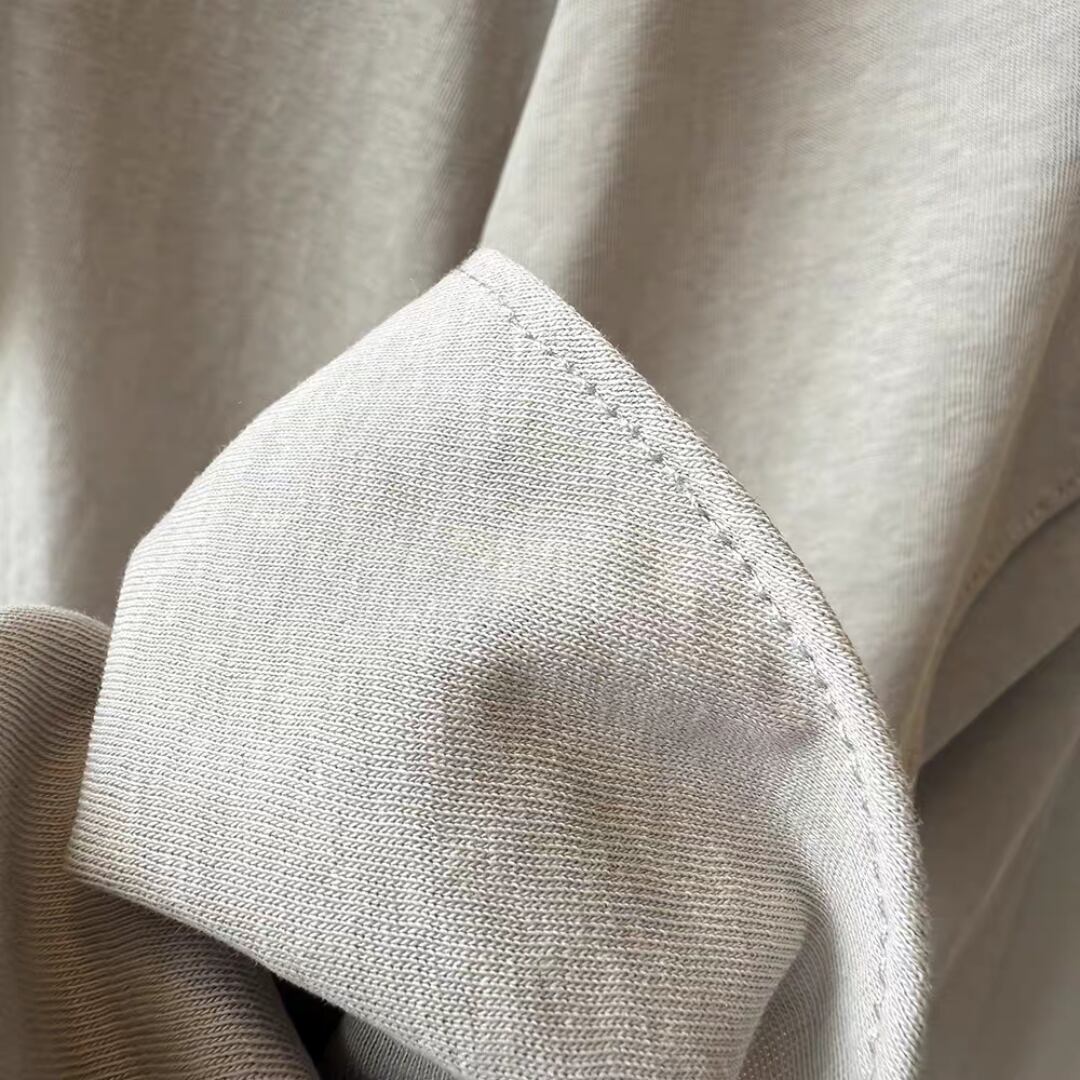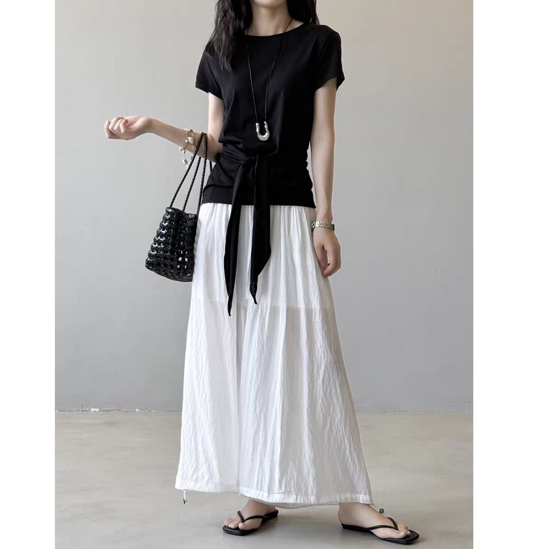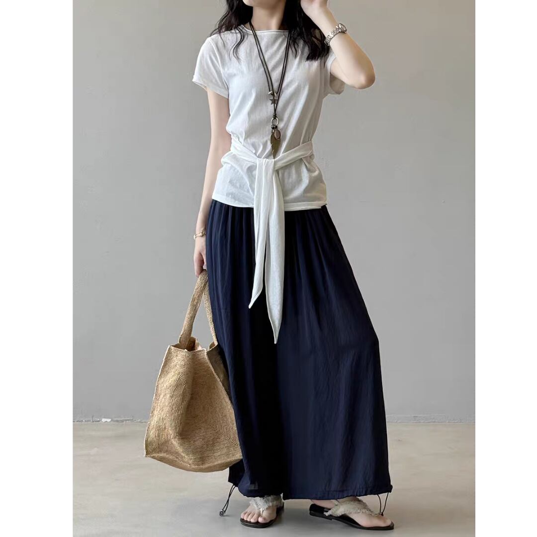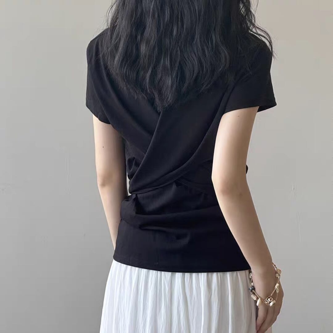 ウエスト部分のクロスデザインが目を引く、シンプルながらもひとクセあるTシャツ。