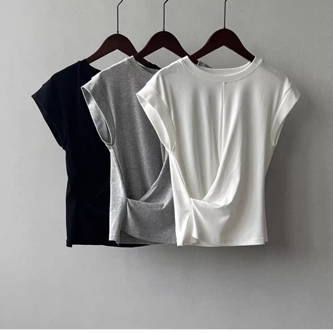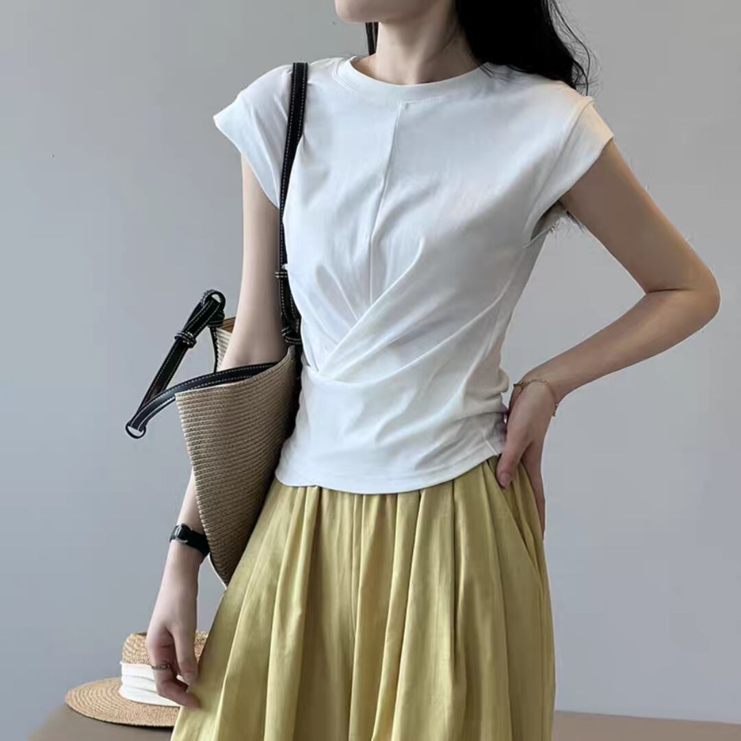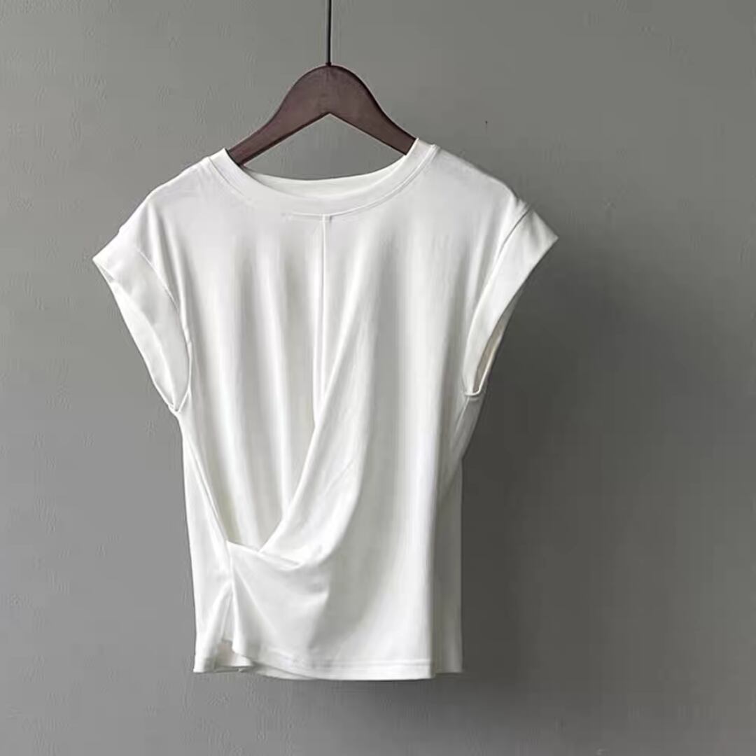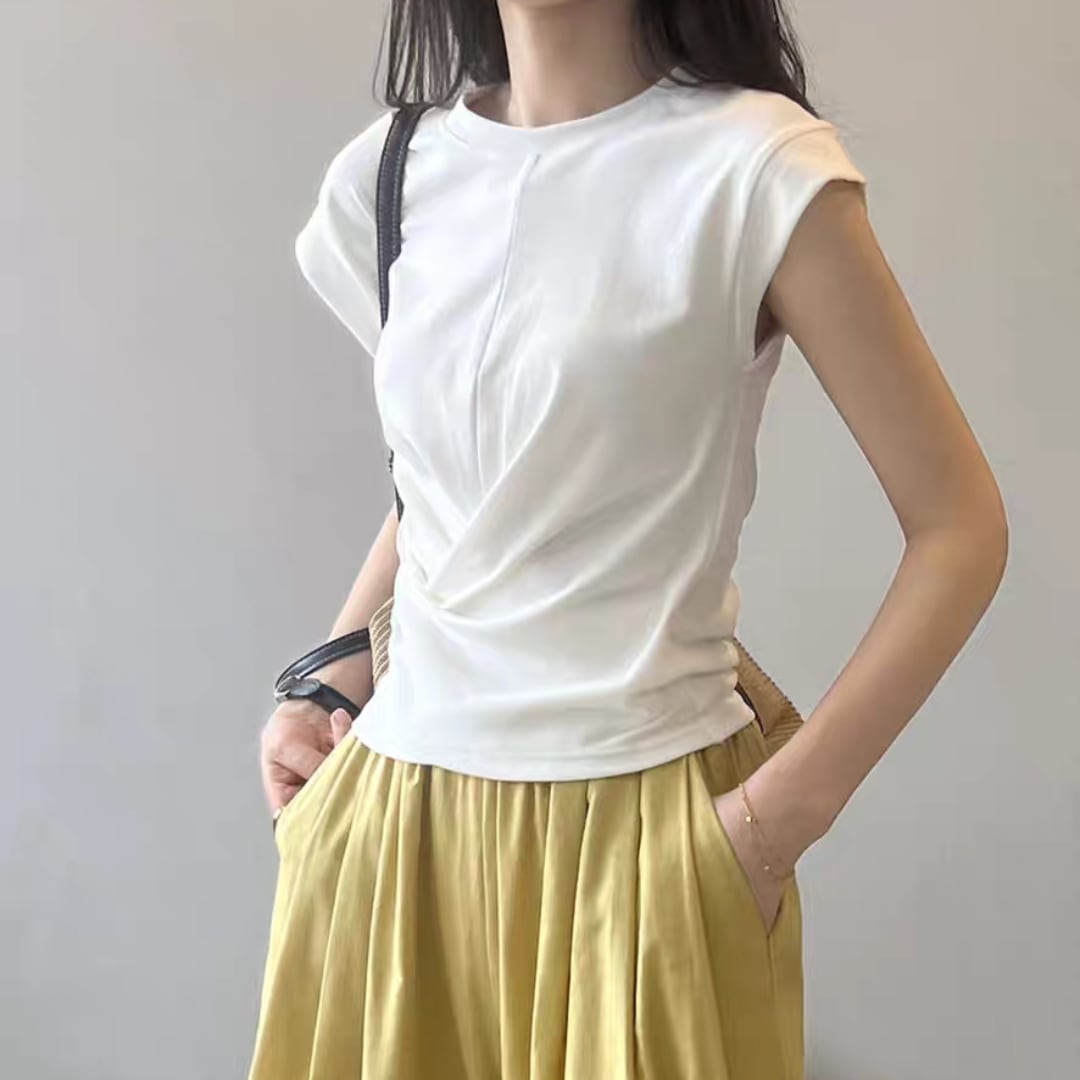 ひねりを加えたフロントタックが印象的な、大人のための上品Tシャツ。