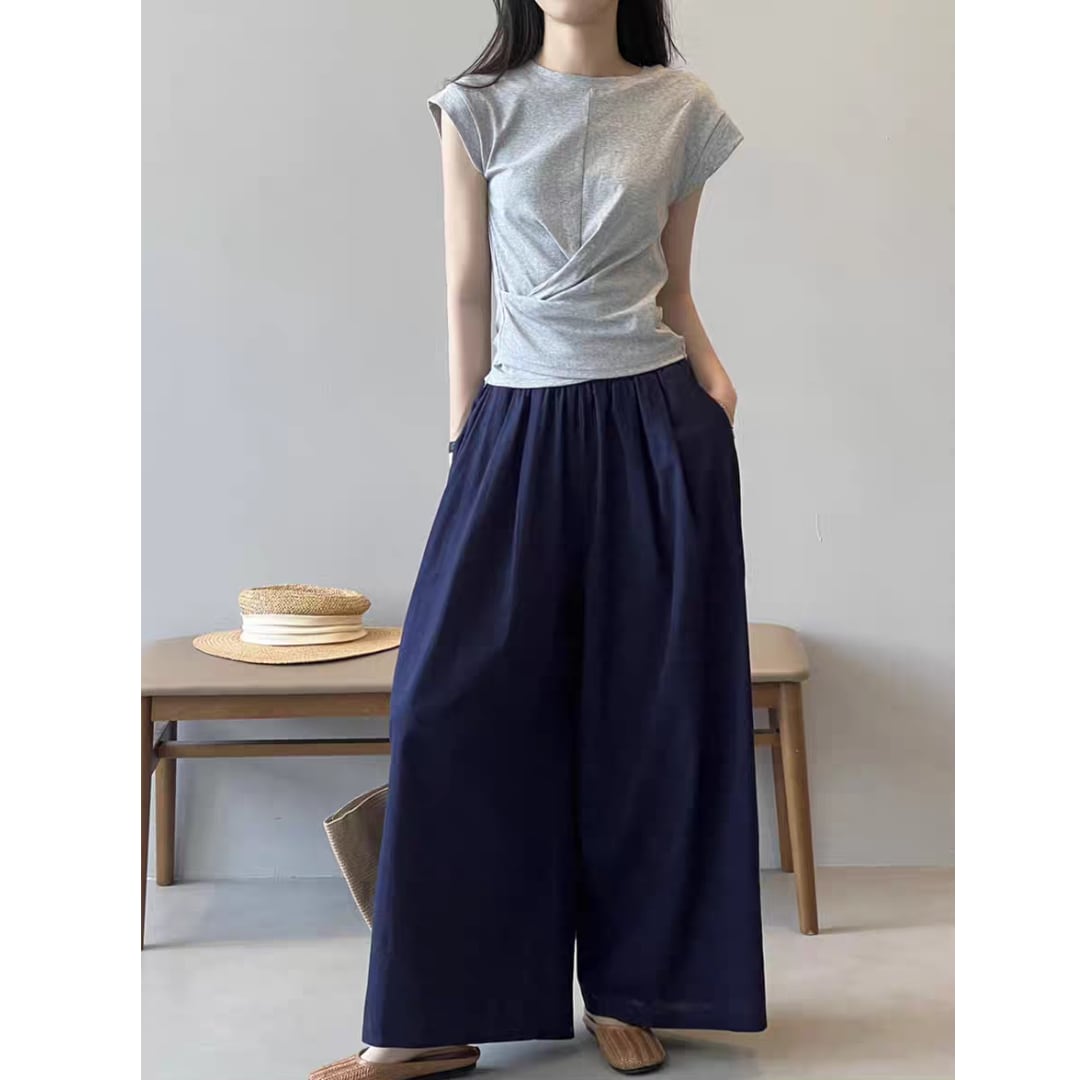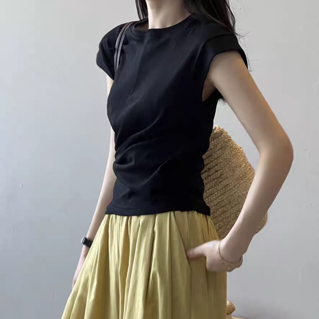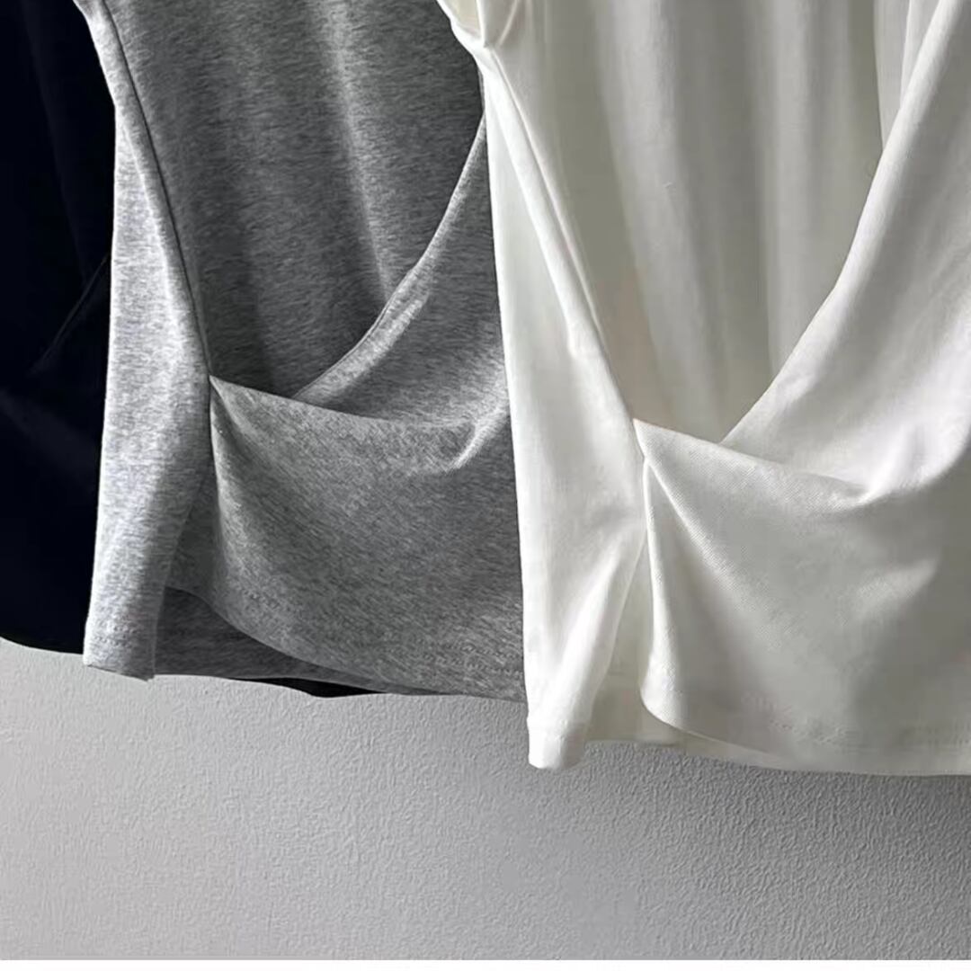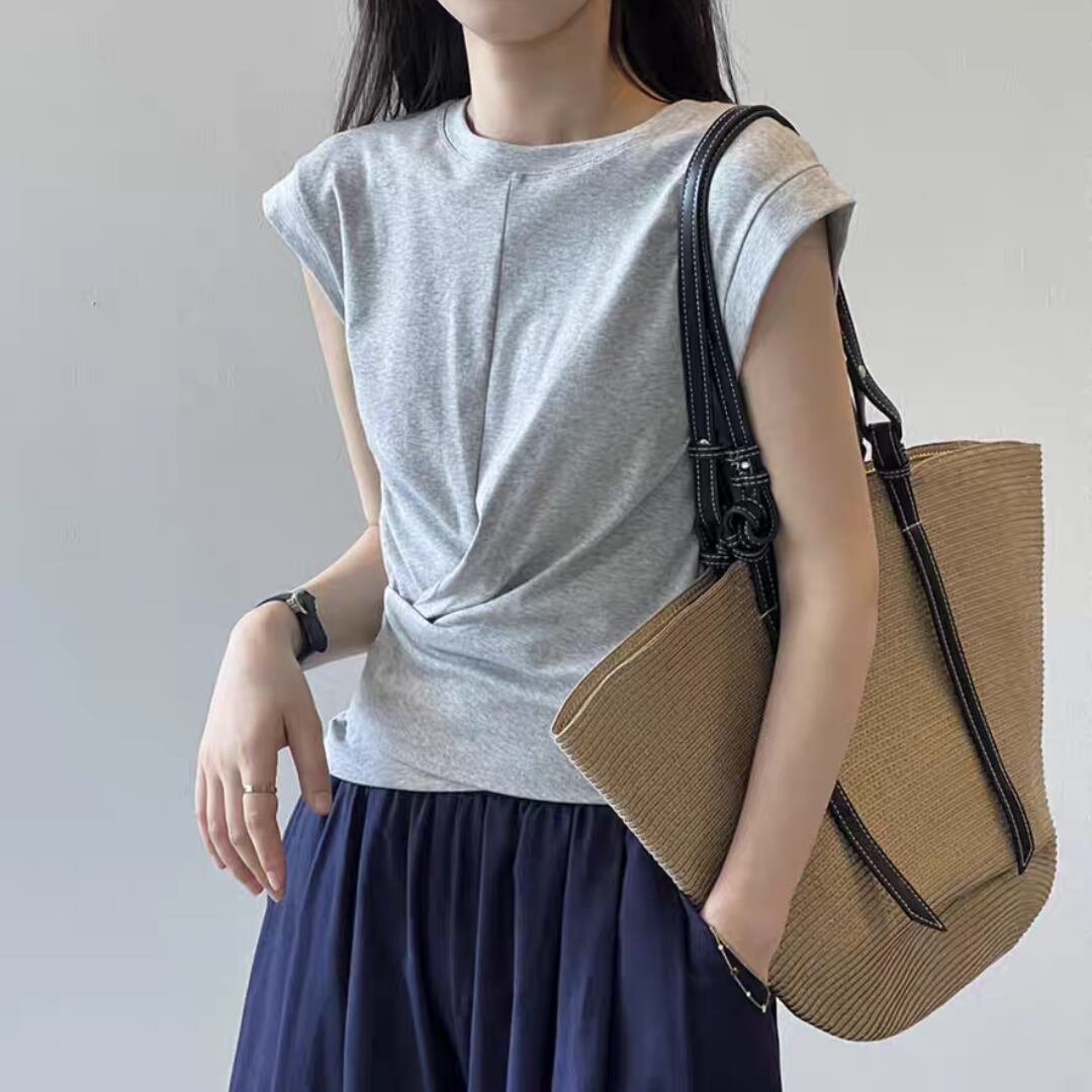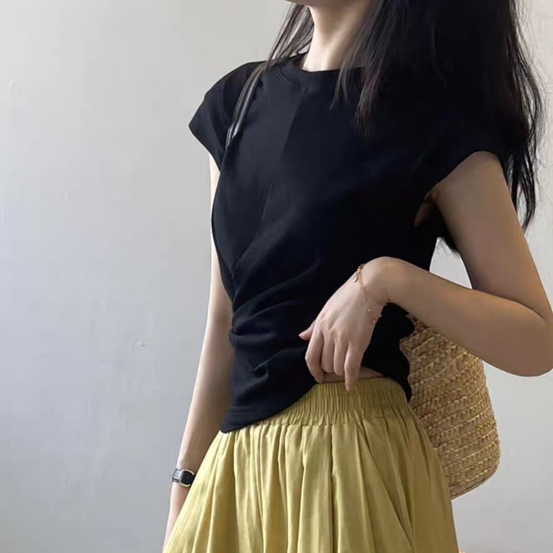 ひねりを加えたフロントタックが印象的な、大人のための上品Tシャツ。