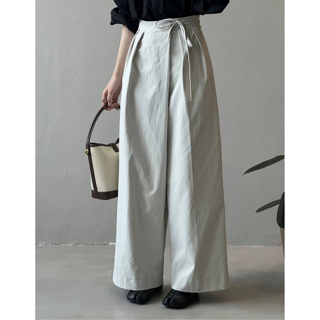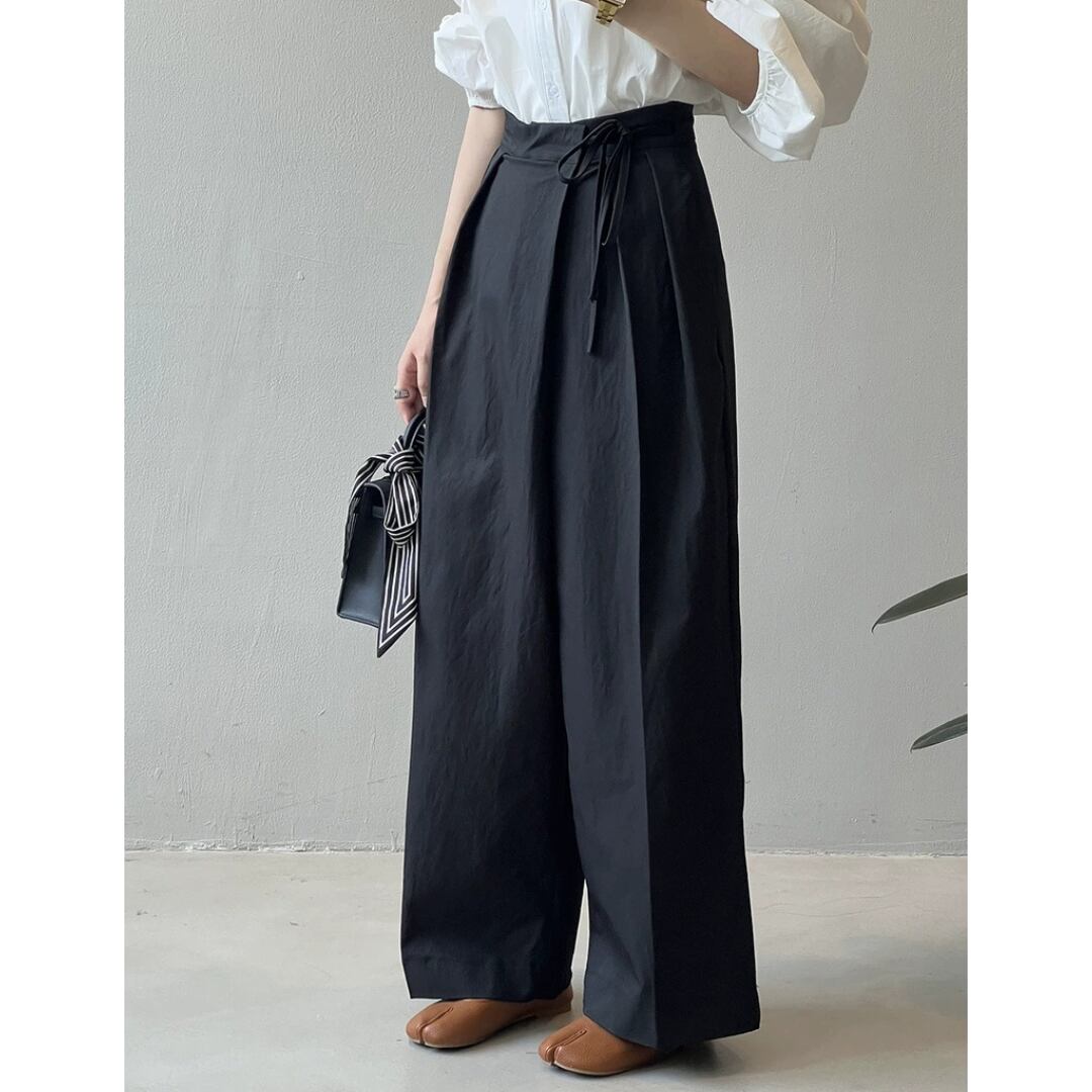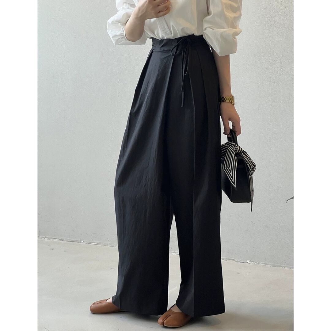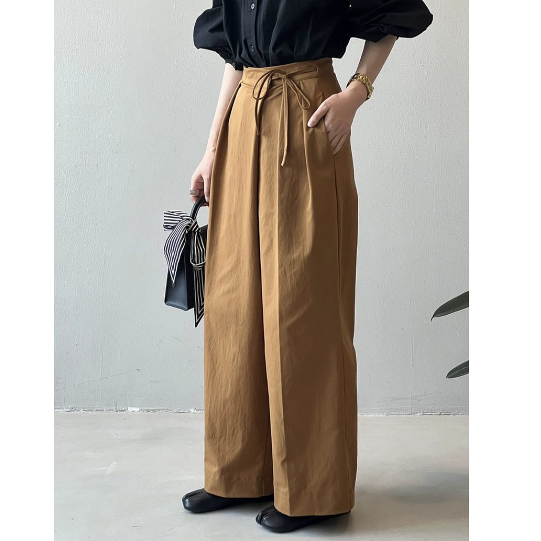 ハイウエスト&タック入りデザインが腰まわりをすっきり見せ、スタイルアップ効果も◎