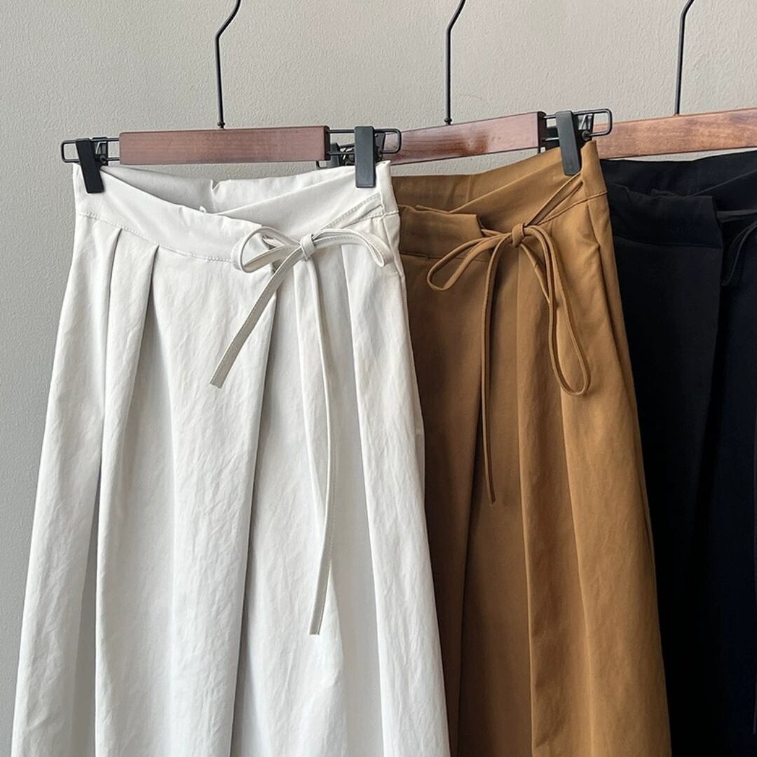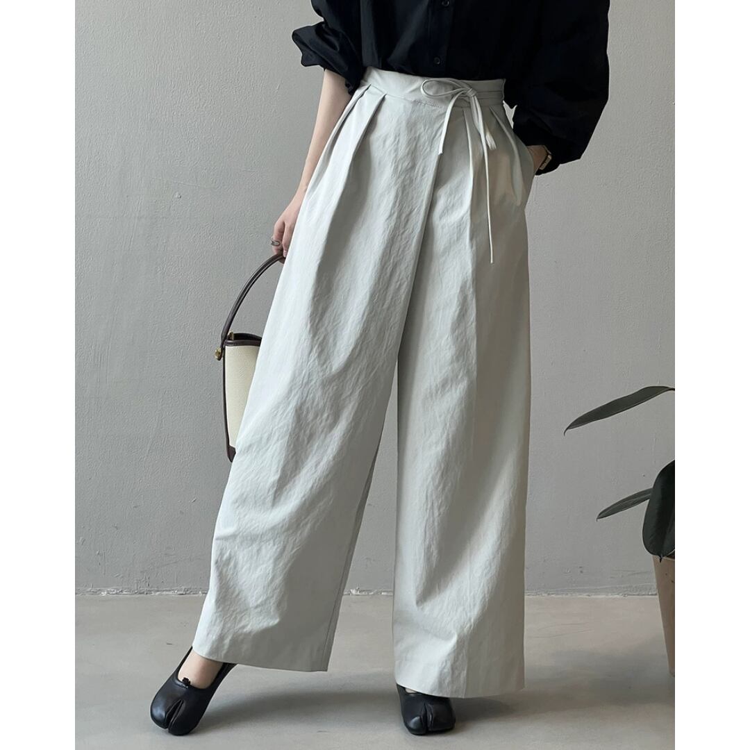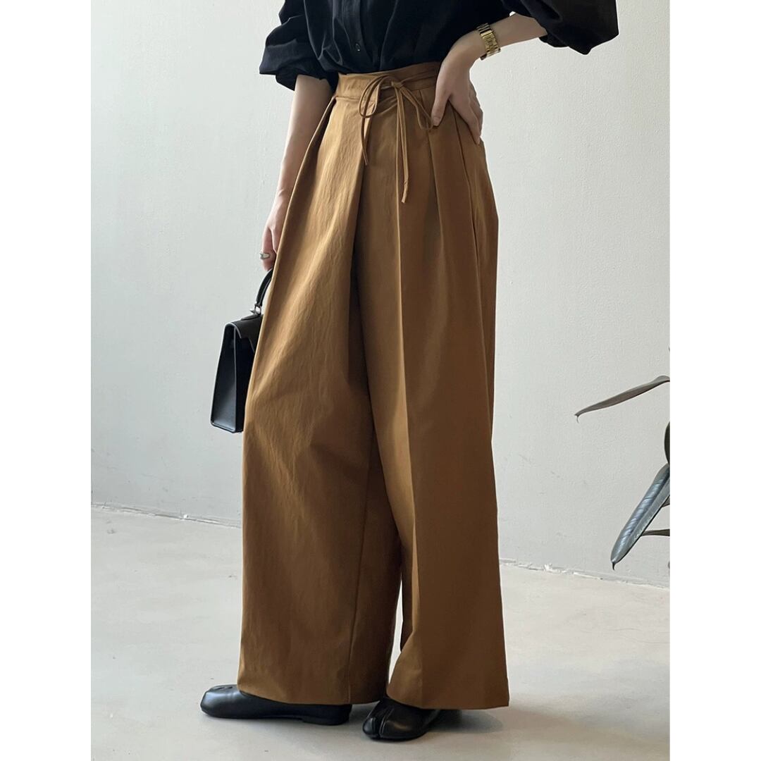 ハイウエスト&タック入りデザインが腰まわりをすっきり見せ、スタイルアップ効果も◎