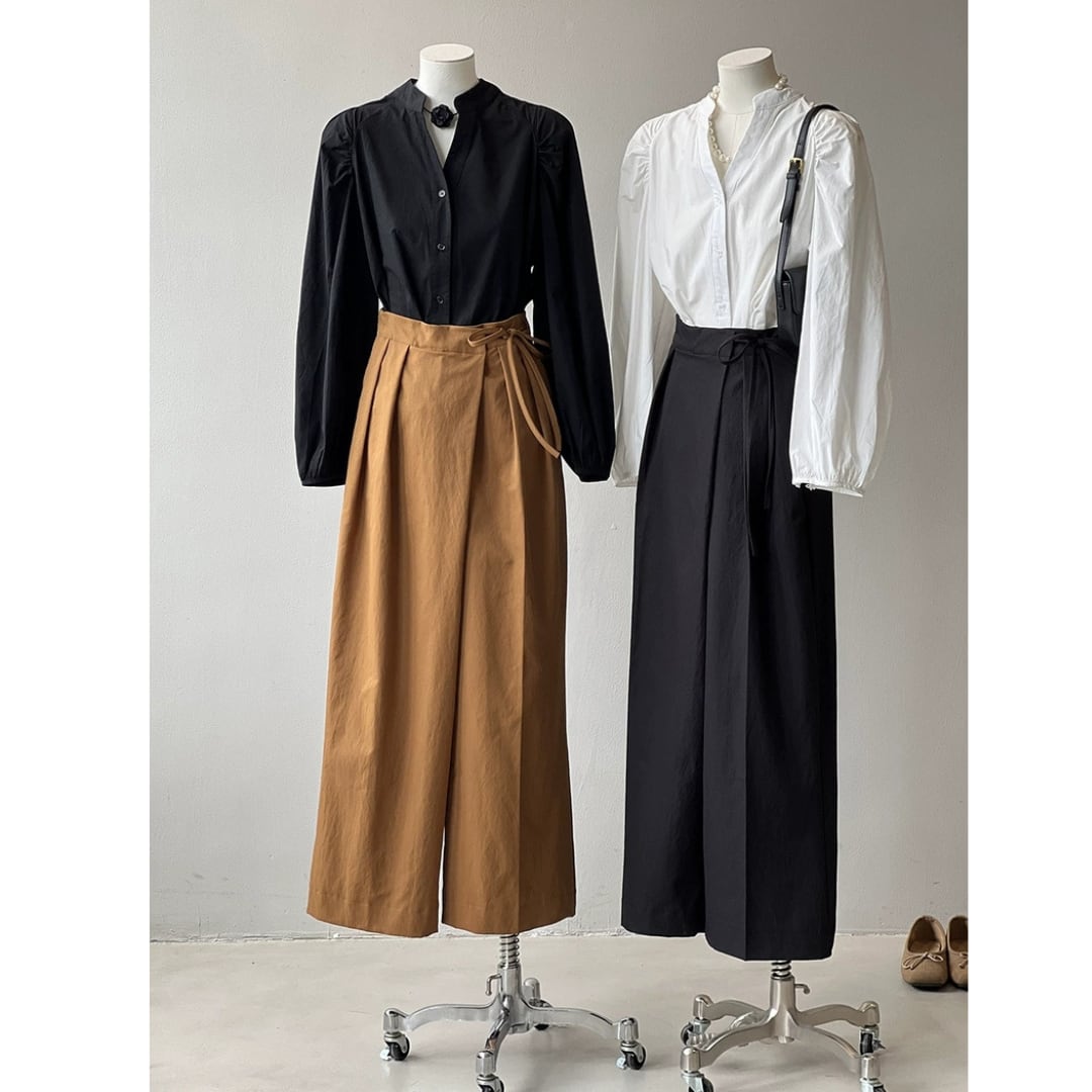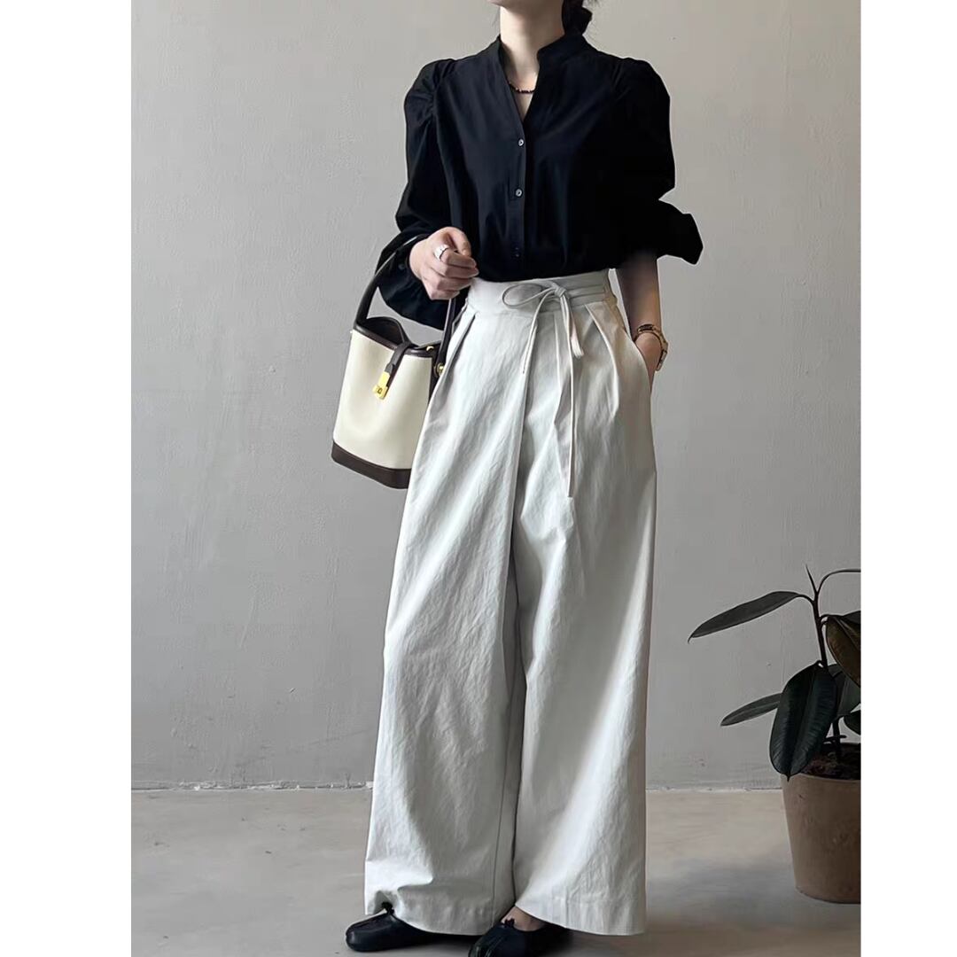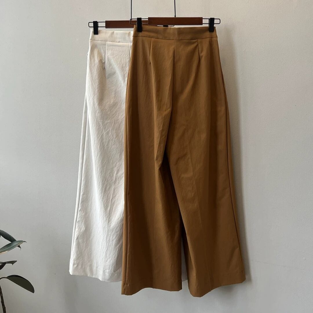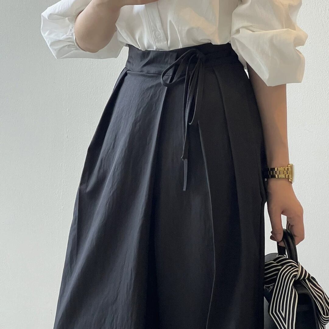 ハイウエスト&タック入りデザインが腰まわりをすっきり見せ、スタイルアップ効果も◎