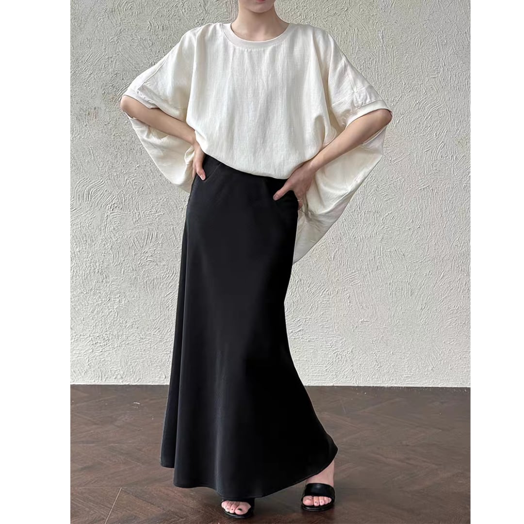 ゆったりとしたシルエットで、気になる体型も自然にカバー。
