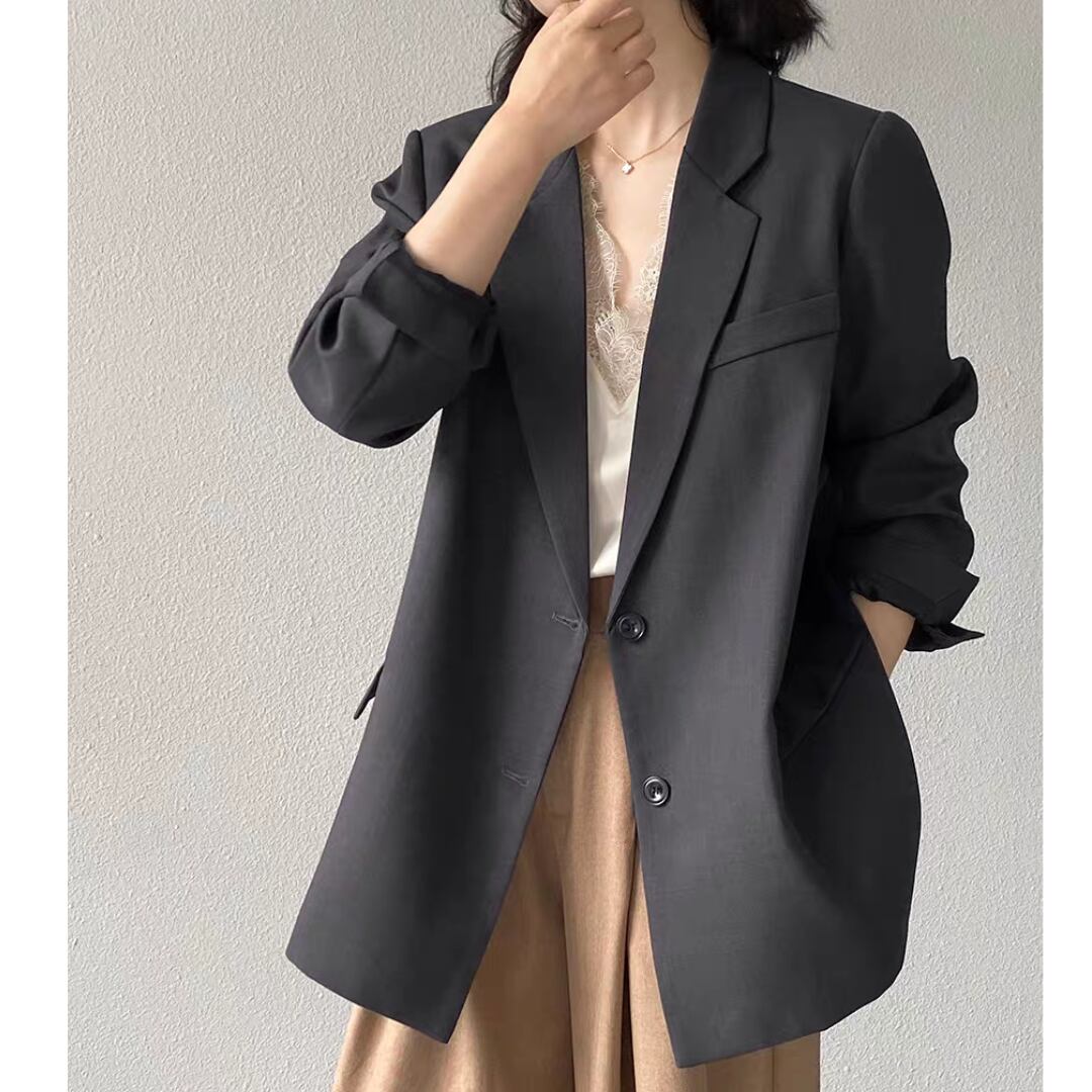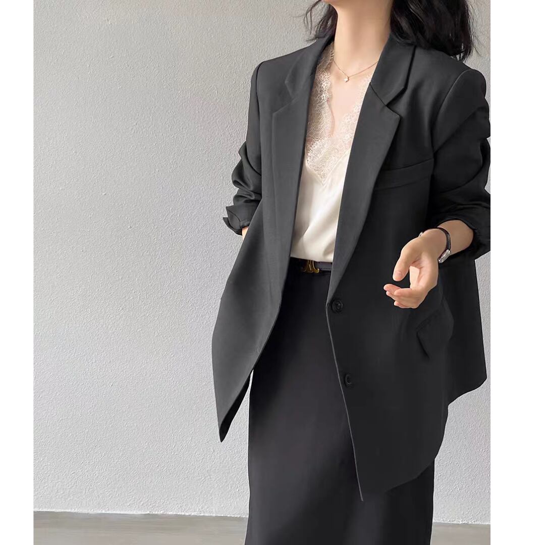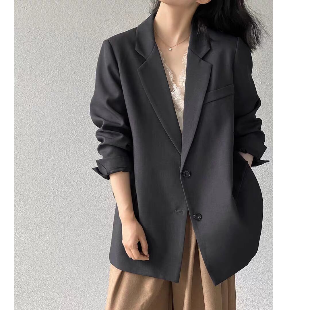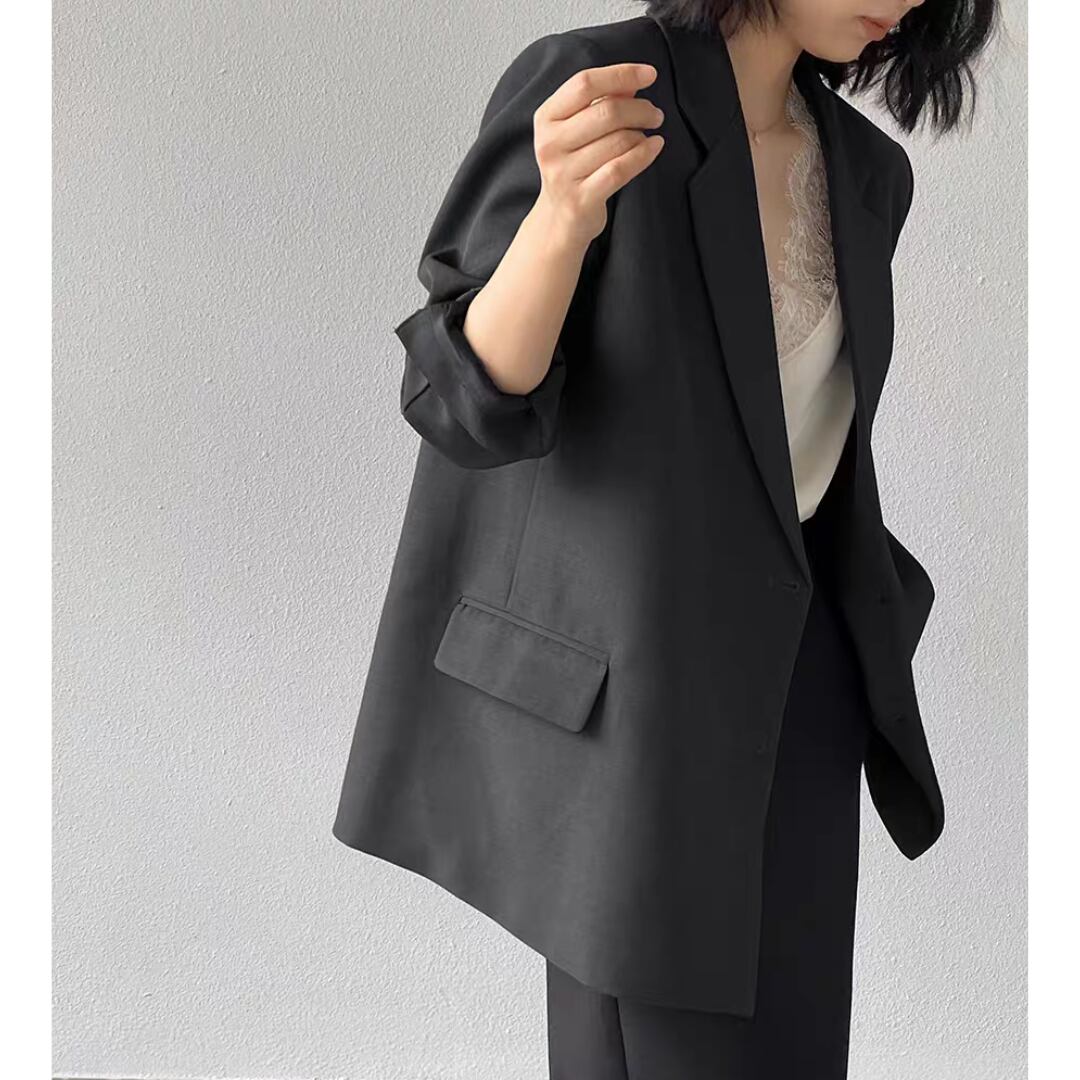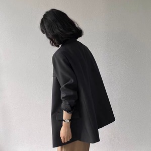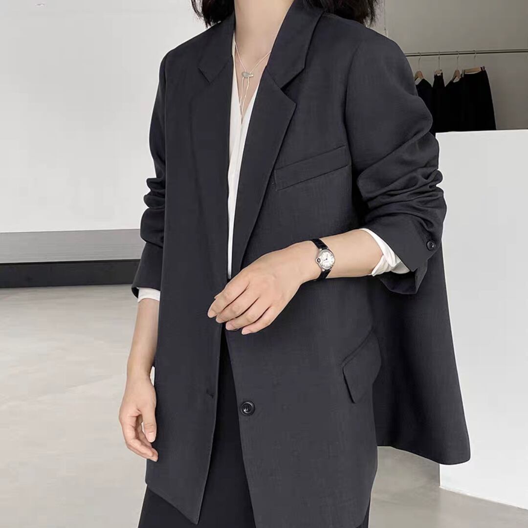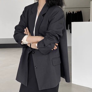 シャープな印象を与えるチャコールグレーが大人の余裕を感じさせる、オーバーサイズシルエットのテーラードジャケット。