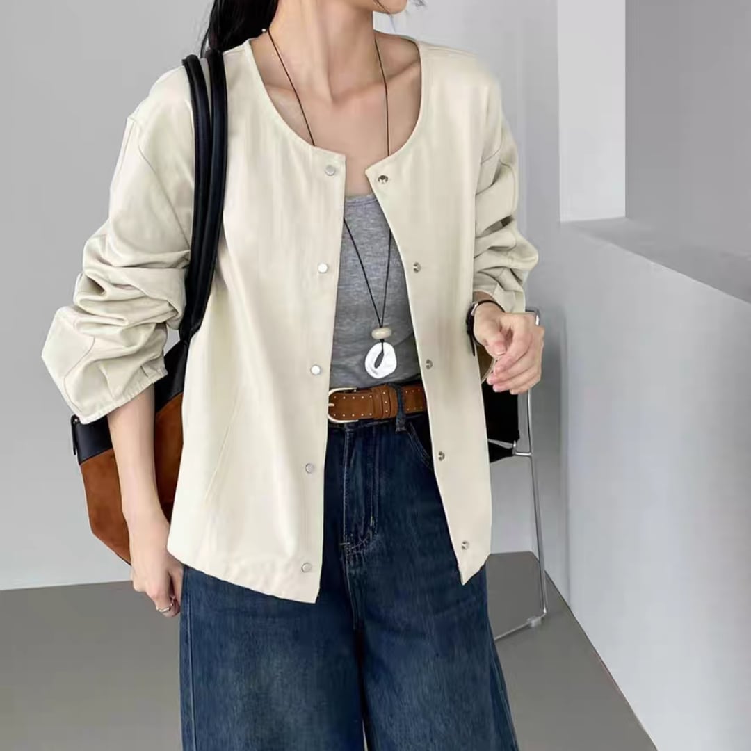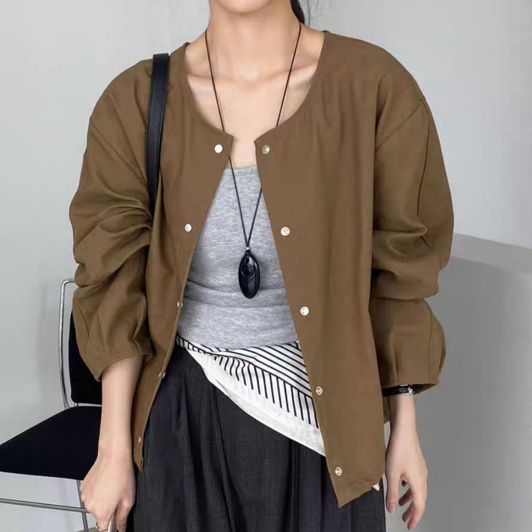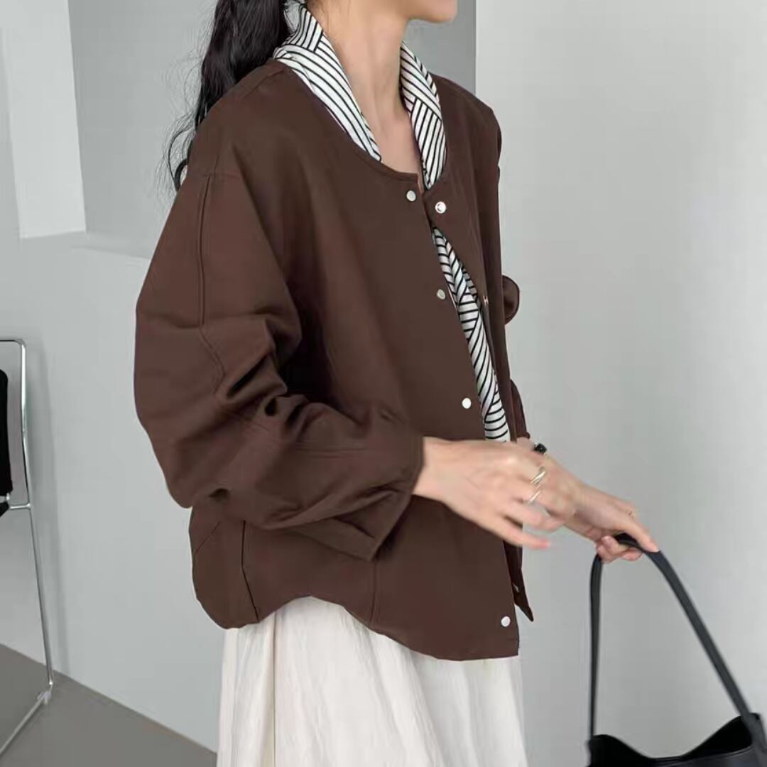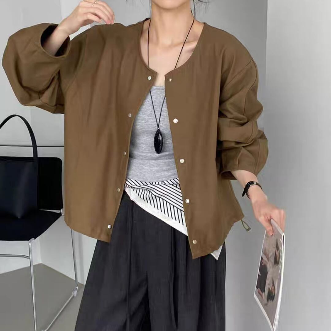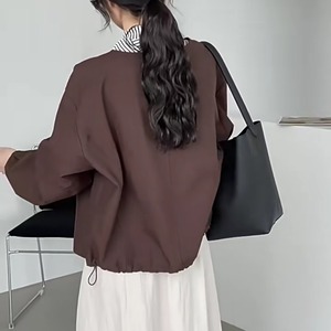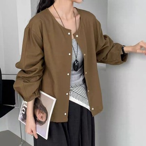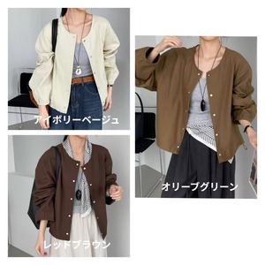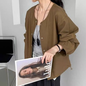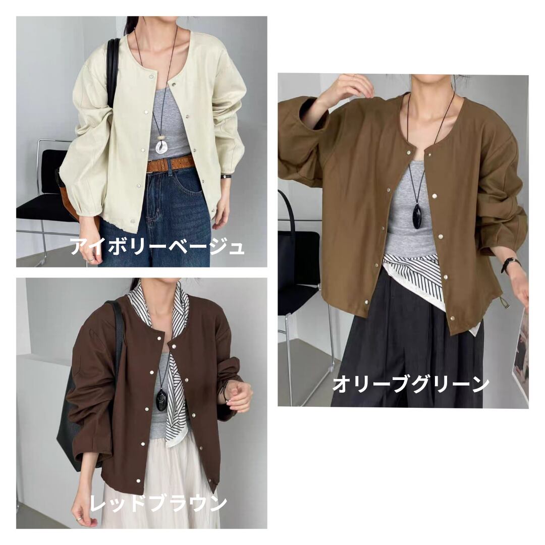 洗練されたノーカラーデザインが大人の女性らしさを引き立てるライトショートジャケット。フロントボタンとシャープなシルエットが、カジュアルながらも上品な印象を演出します。どんなスタイルにもすんなり馴染むため、通勤やお出かけにもピッタリです。