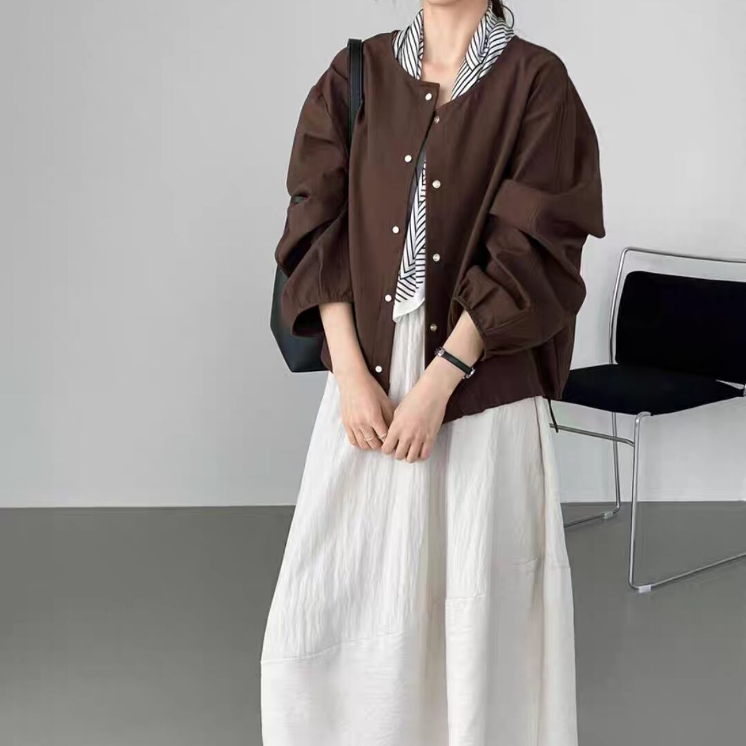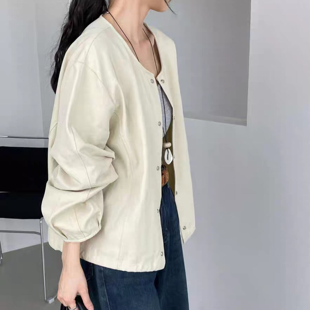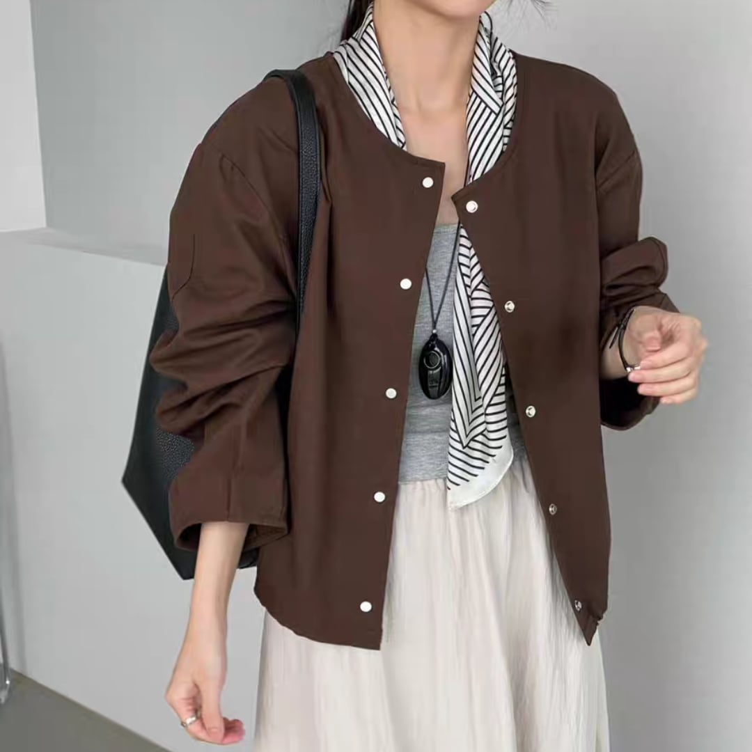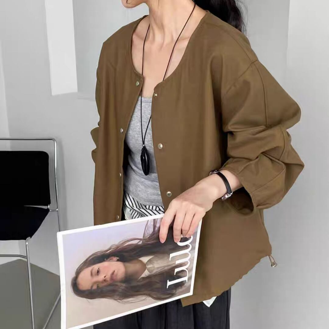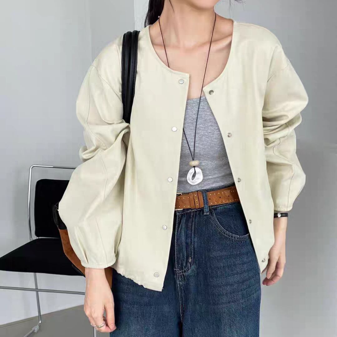 洗練されたノーカラーデザインが大人の女性らしさを引き立てるライトショートジャケット。フロントボタンとシャープなシルエットが、カジュアルながらも上品な印象を演出します。どんなスタイルにもすんなり馴染むため、通勤やお出かけにもピッタリです。