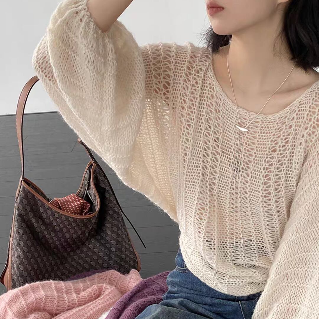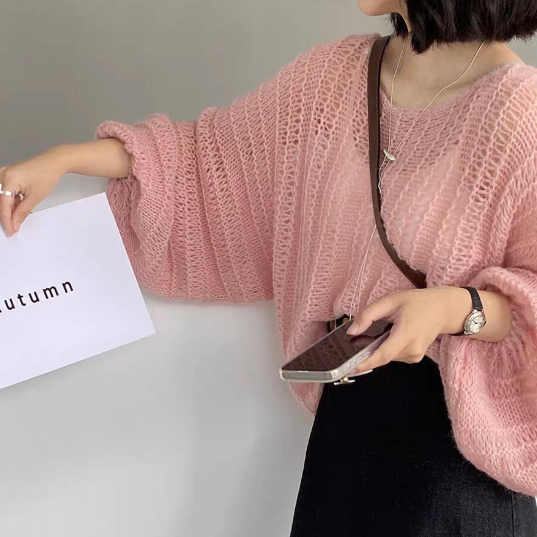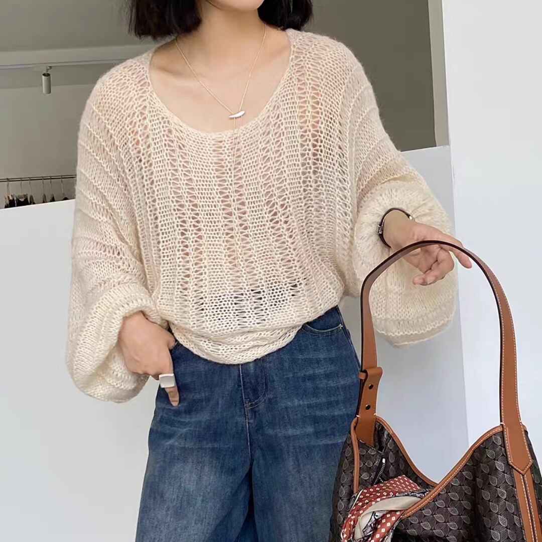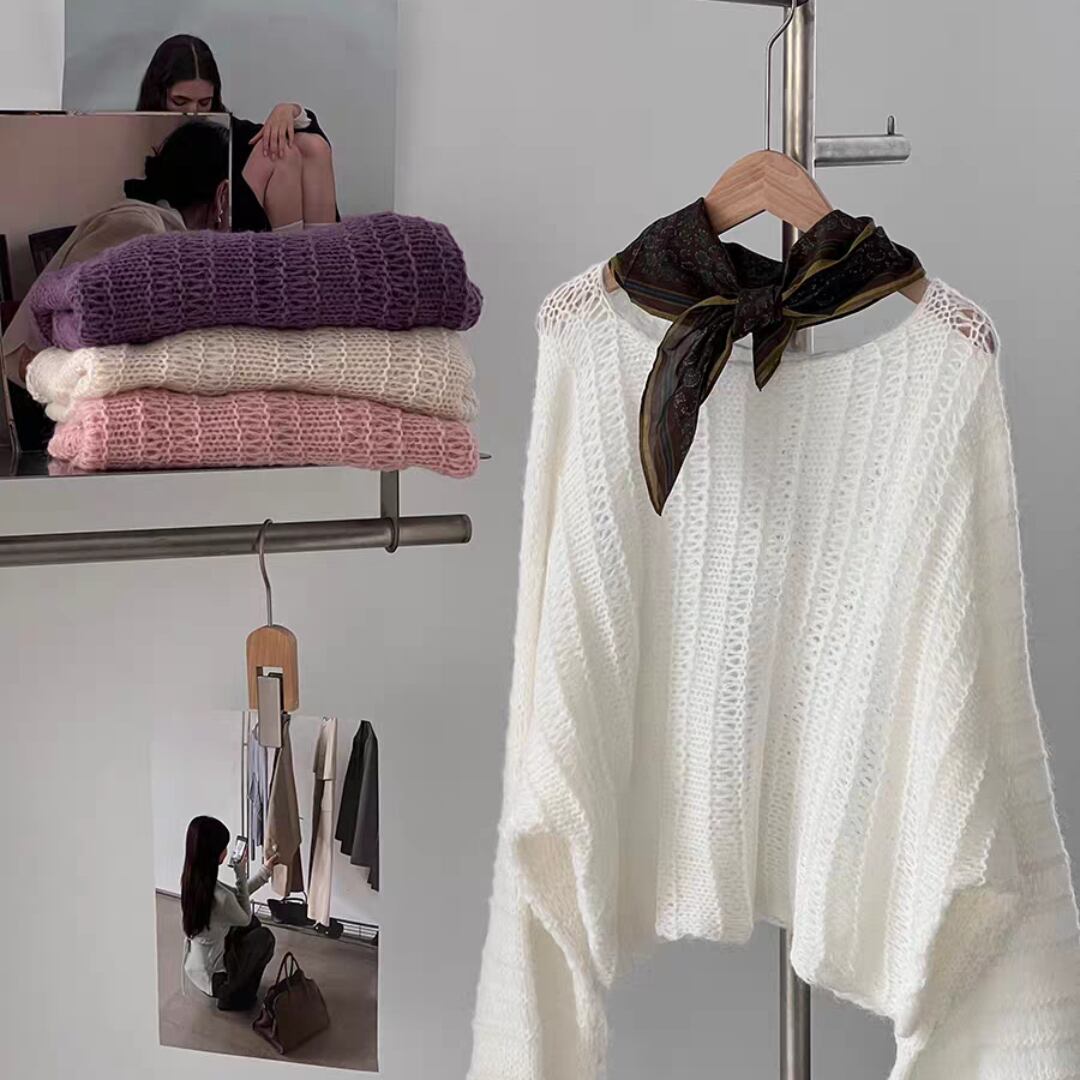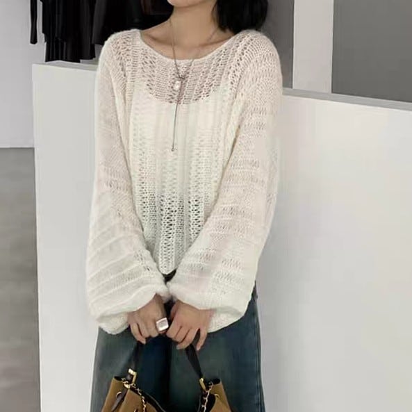 軽やかな透かし編みが魅力のルーズメッシュニットプルオーバー。ドロップショルダーとゆったり袖が抜け感のあるシルエットを演出し、レイヤードスタイルにもぴったりです。パンツにもスカートにも合わせやすく、シーズンを問わず活躍する1枚。