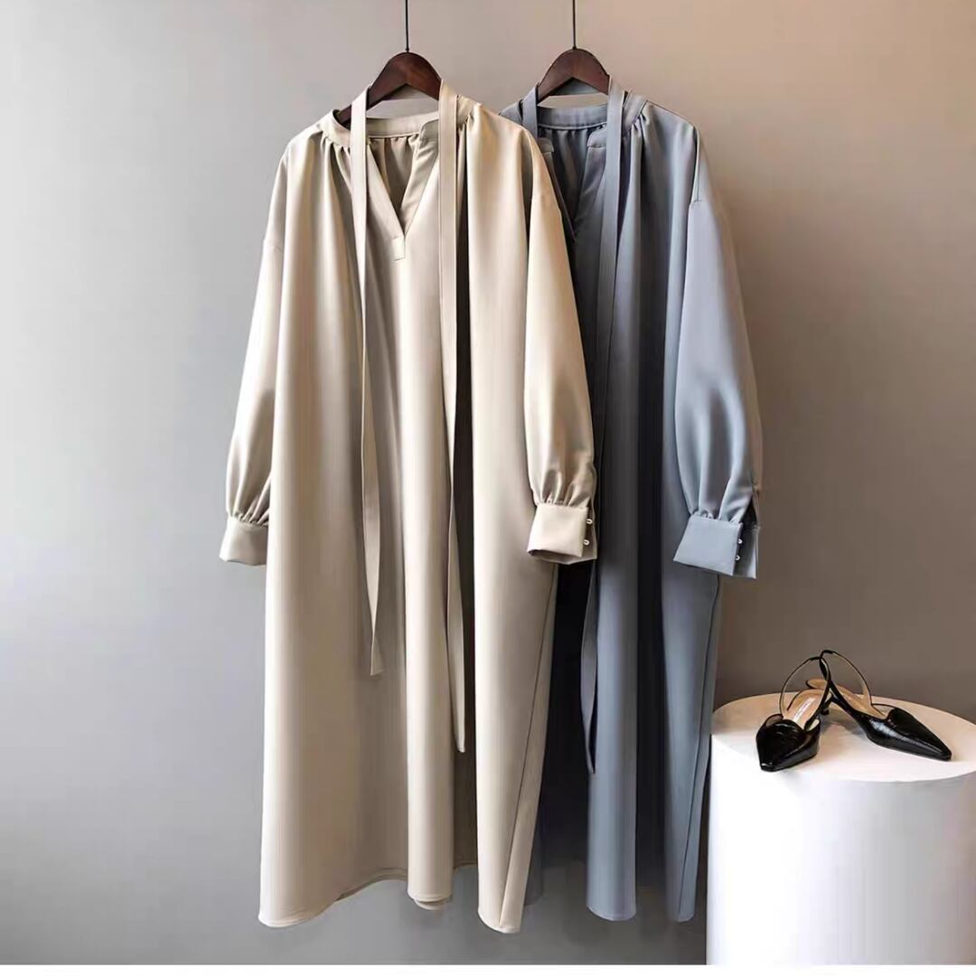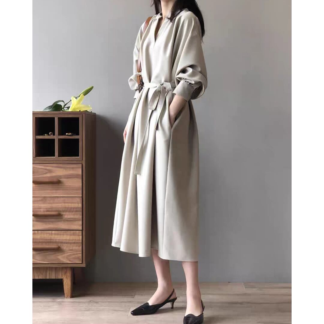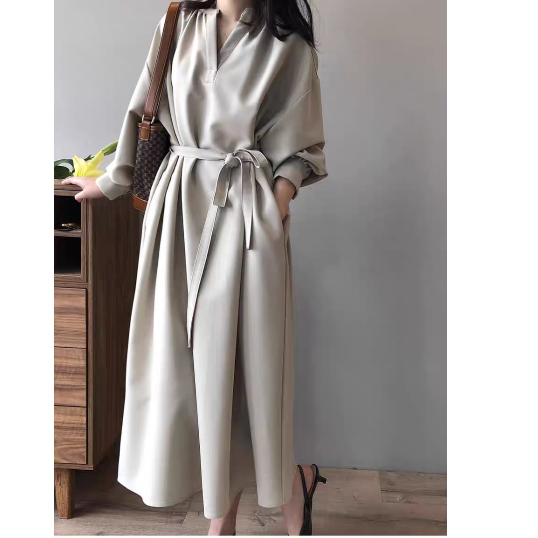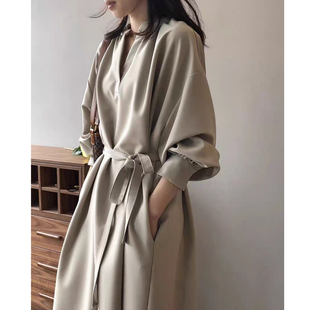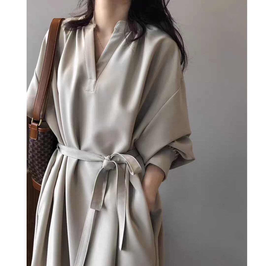 深めのVネックが顔まわりをすっきり見せ、抜け感をプラスします。ドロップショルダーと長めのカフス袖で上品なリラックス感を演出。付属のリボンベルトは前後どちらでも結べ、着こなしのアレンジも自在。普段使いからお出かけまで幅広く活躍する1枚です。