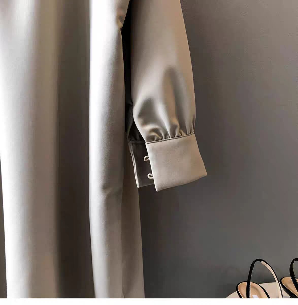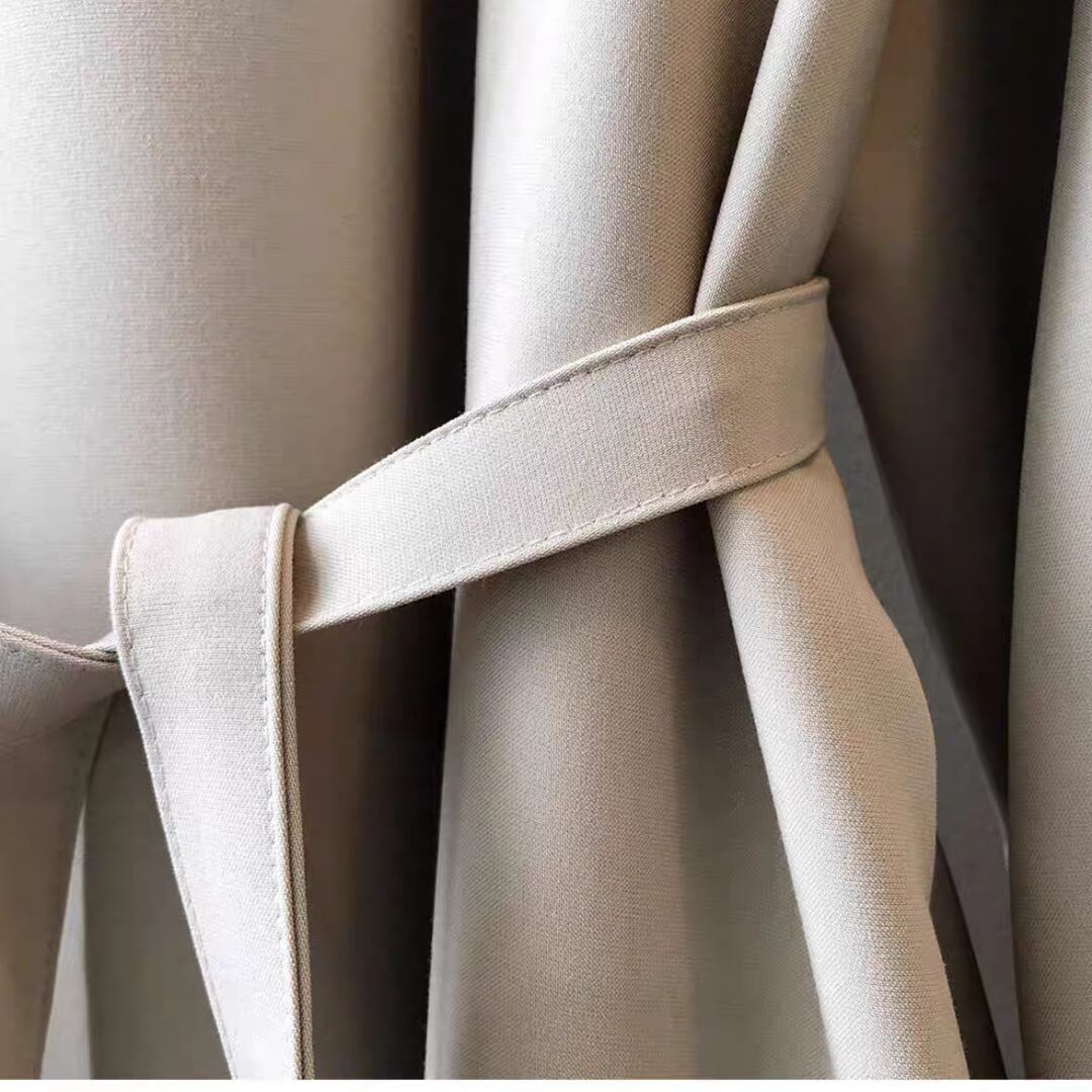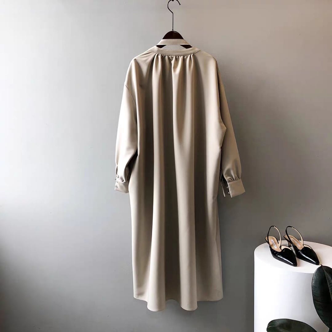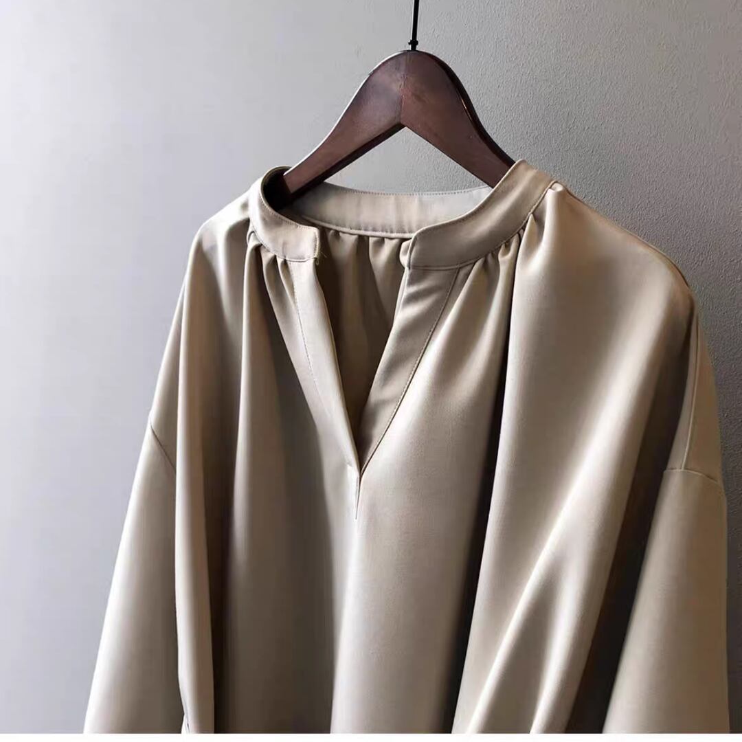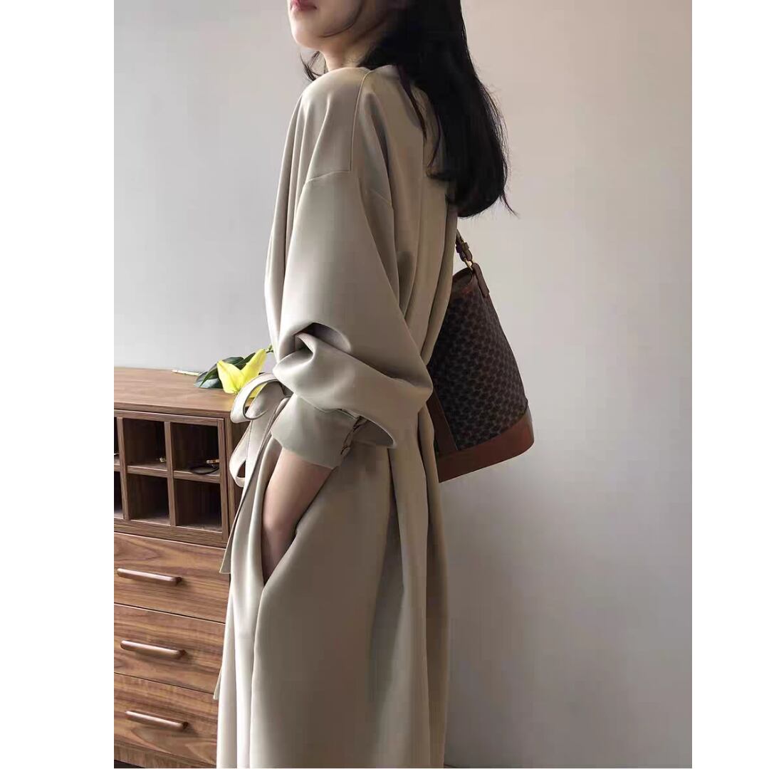 深めのVネックが顔まわりをすっきり見せ、抜け感をプラスします。ドロップショルダーと長めのカフス袖で上品なリラックス感を演出。付属のリボンベルトは前後どちらでも結べ、着こなしのアレンジも自在。普段使いからお出かけまで幅広く活躍する1枚です。